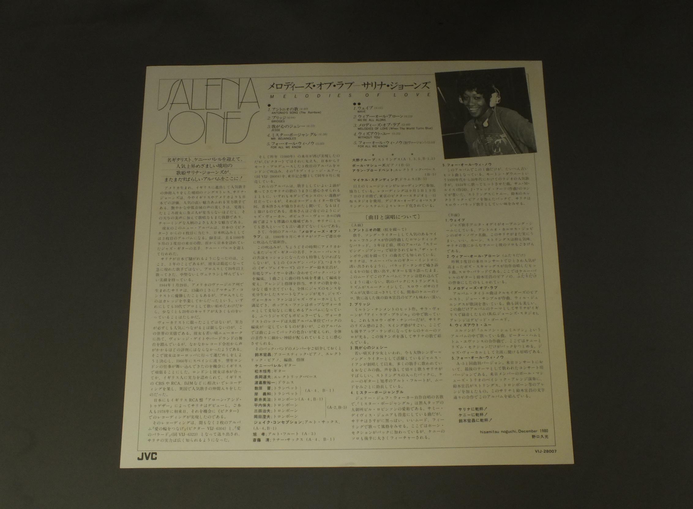 SALENA JONEサリナ・ジョーンズ/MELODIES OF LOVEメロディーズ・オブ・ラブ VIJ28007 製造国:日本盤 / Media:LP外観:EX+盤の状態:EX+ 価格(税込):¥2,383(売約済) 送料 7inch:定形外郵便 360円~LP:定形外郵便 660円~送料は、注文の最終画面で確認頂けます。 > > SALENA JONE/MELODIES OF LOVE 外観 (EX+)特記事項:特記なし。外観EX+の共通説明:中古としては美品、一見してきれいでダメージが軽微。シミ、ヨゴレ、スレ有っても僅か~少し。 盤の状態 (EX+)特記事項:薄いスリキズ・スレ少し。一見してきれいな状態です。盤EX+の共通説明:盤面の極薄いスリキズ、スレ少し程度 音に出そうなものは無いように見える(極軽微なソフトティック音は除く)。 Tweet それぞれの画像をクリックすると、大きい写真が見られます こちらの商品もお勧めです 990円 BERNSTEIN-DIETRICH FISCHER DIESKAUバーンスタイン-ディースカウ / MAHLER SONGS PROMO ONLYマーラー-歌曲集 プロモ用 990円 GARDENガーデン / DUFAY MISSA `SE LA FACE AY PALE` ZU 4 STIMMENデュファイ ミサ`ス・ラ・ファス・エ・パール` 990円 CLIFTON WILLIAMS OWEN REED ETCC.ウィリアムス O.リード 他 / BRASS BAND MUSIC GUIDANCE VOL.2-ORIGINAL REPERTOIRE BEST100吹奏楽名曲ガイドVOL.2-オリジナルレパートリー・ベスト100 1,320円 GERARD SOUZAYジェラール・スゼー / SCHUMANNシューマン歌曲集 990円 JESSYE NORMANジェーシー・ノーマン / NEGRO SPIRITUALAS黒人霊歌集 990円 FRITZ WERNERフリッツ・ヴェルナー / BACH-KANTATE BWV82-BWV56バッハ-カンタータ 第82番-第56番 880円 HANS HOTTERハンス・ホッター / SCHUBERT`SCHWANENGESANG`-SONG CYCLEシューベルトー`白鳥の歌`全曲 990円 JANET BAKER - BARBIROLLI - THE NEW PHILHARMONIA ORCH.ジャネット・ベイカー - バルビローニ - ニュー・フィルハーモニア管弦楽団 / BERLIOZ - LES NUITS D`ETEベルリオーズ - 歌曲 夏の夜