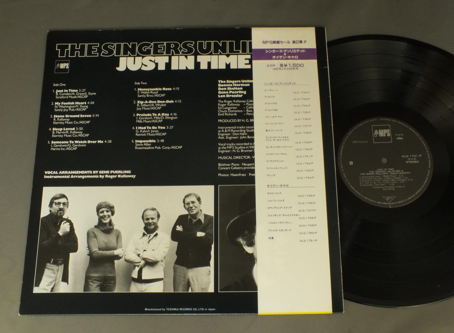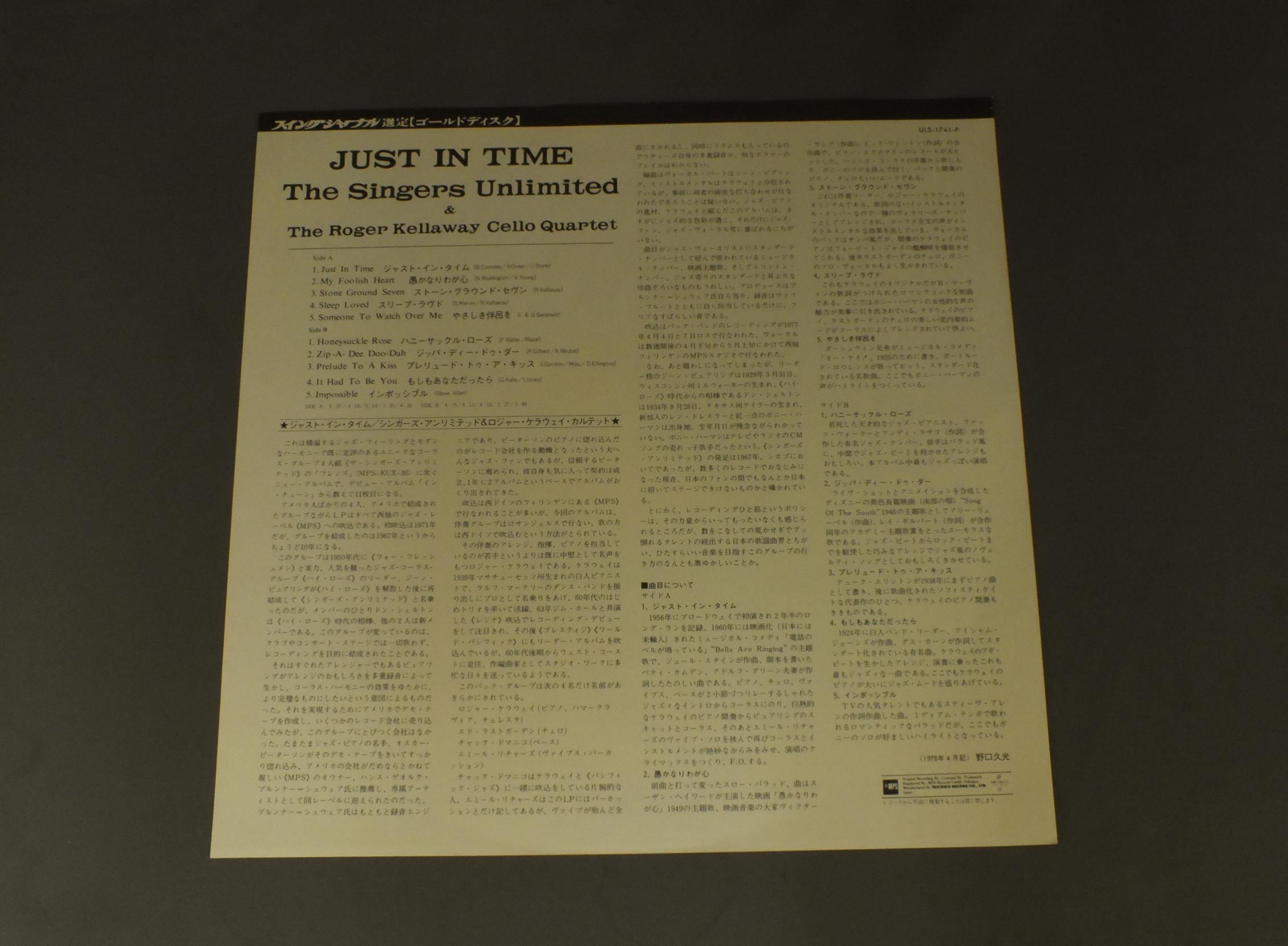 SINGERS UNLIMITEDシンガーズ・アンリミテッド/JUST IN TIMEジャスト・イン・タイム ULS1741P 製造国:日本盤 / Media:LP外観:EX盤の状態:EX帯:EX+ 価格(税込):¥660(売約済) 送料 7inch:定形外郵便 360円~LP:定形外郵便 660円~送料は、注文の最終画面で確認頂けます。 > > SINGERS UNLIMITED/JUST IN TIME 外観 (EX)特記事項:特記なし。外観EXの共通説明:ダメージが限定的。中古品としては保存状態がよい方。シミ、ヨゴレ、スレ 少し~軽度。 盤の状態 (EX)特記事項:薄いスリキズ・スレ軽くある感じ。軽微なものの様子です。盤EXの共通説明:盤面のスリキズが薄いものが少し~軽度 音に出そうなものは無いように見える(軽微なソフトティック音は除く)。 帯の状態 (EX+):特記なし。 Tweet それぞれの画像をクリックすると、大きい写真が見られます こちらの商品もお勧めです 1,210円 MATT DENNISマット・デニス / PLAY MELANCHOLY BABYプレイ・メランコリー・ベイビー 770円 BUDDY GRECOバディ・グレコ / HERE`S BUDDY GRECOヒアーズ・バディ・グレコ 1,320円 CLEO LAINEクレオ・レーン / AT THE WAVENDON FESTIVALジス・イズ・クレオ -クレオ・レーン・アット・ザ・ウェイヴンドン- 990円 MARI NAKAMOTO中本マリ / LOVE TOUCHLOVE TOUCH 770円 TONY MARTINトニー・マーティン / HIS GREATEST HITS 990円 MAHALIA JACKSONマヘリア・ジャクソン / MAHALIA JACKSON STORYマヘリア・ジャクソン・ストーリー 1,320円 SAMMY DAVIS JR & CARMEN MCRAEサミー・ディヴィス・ジュニア & カーメン・マクレエ / BOY MEETS GIRLボーイ・ミーツ・ガール 990円 BILLIE HOLIDAYビリー・ホリデイ / BILLIE HOLIDAYビリー・ホリデイの魂
