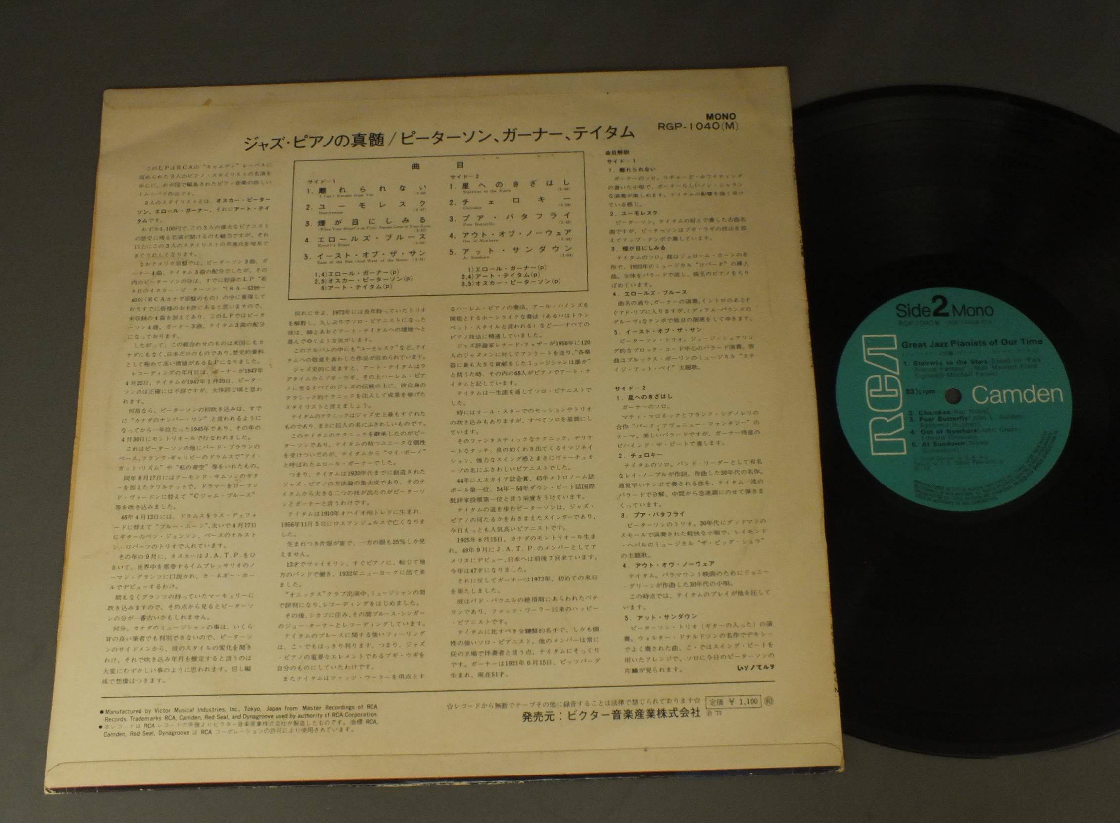OSCAR PETERSONオスカー・ピーターソン他/GREAT JAZZ PIANISTS OF OUR TIMEジャズ・ピアノの真髄 RGP1040 製造国:日本盤 / Media:LP外観:VG+盤の状態:EX 価格(税込):¥660(売約済) 送料 7inch:定形外郵便 360円~LP:定形外郵便 660円~送料は、注文の最終画面で確認頂けます。 > > OSCAR PETERSON/GREAT JAZZ PIANISTS OF OUR TIME 外観 (VG+)特記事項:ペラジャケ外観VG+の共通説明:ダメージやや有り。シミ、ヨゴレ、スレなど多少~やや多め。 盤の状態 (EX)特記事項:薄いスリキズ・スレ軽くある感じ。軽微なものの様子です。盤EXの共通説明:盤面のスリキズが薄いものが少し~軽度 音に出そうなものは無いように見える(軽微なソフトティック音は除く)。 Tweet それぞれの画像をクリックすると、大きい写真が見られます こちらの商品もお勧めです 1,210円 RED NICHOLS & HIS FIVE PENNIESレッド・ニコルスとファイブ・ペニーズ / RED NICHOLS STORYレッド・ニコルス物語 1,210円 MODERN JAZZ QUARTET & SWINGLE SINGERSMJQとスィングル・シンガーズ / PLACE VENDOMEヴァンドーム 770円 RONNELL BRIGHTロンネル・ブライト / BRIGHT FLIGHTブライト・フライ 990円 SIDNEY DEPARIS etc / COMMODORE SHOW CASEコモドア・ショーケース 1,210円 MODERN JAZZ QUARTETMJQ / ART OF THE MODERN JAZZ QUARTETアート・オブ・MJQ 770円 CHICK COREA etcチック・コリア 他 / ECM SPECIALECMスペシャル 770円 RALPH SIMONラルフ・サイモン / TIME BEINGタイム・ビーイング 990円 MODERN JAZZ QUARTETモダン・ジャズ・カルテット / TOGETHER AGAINトゥゲザー・アゲイン
