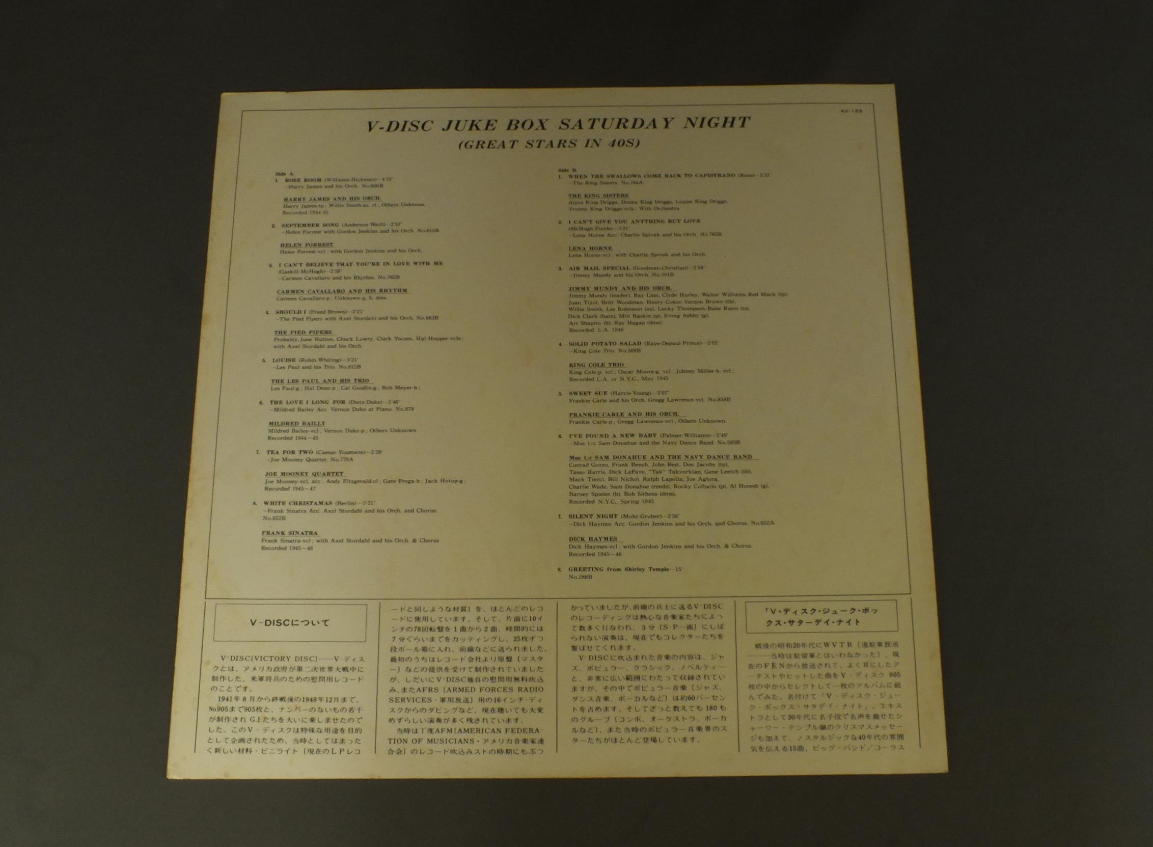 GREAT STARS IN 40s/V-DISC JUKE BOX SATURDAY NIGHT KV123 製造国:日本盤 / Media:LP外観:EX盤の状態:EX+ 価格(税込):¥440(売約済) 送料 7inch:定形外郵便 360円~LP:定形外郵便 660円~送料は、注文の最終画面で確認頂けます。 > > GREAT STARS IN 40s/V-DISC JUKE BOX SATURDAY NIGHT 外観 (EX)特記事項:特記なし。外観EXの共通説明:ダメージが限定的。中古品としては保存状態がよい方。シミ、ヨゴレ、スレ 少し~軽度。 盤の状態 (EX+)特記事項:極薄いスリキズ・スレ少し。一見してきれいな状態です。盤EX+の共通説明:盤面の極薄いスリキズ、スレ少し程度 音に出そうなものは無いように見える(極軽微なソフトティック音は除く)。 Tweet それぞれの画像をクリックすると、大きい写真が見られます こちらの商品もお勧めです 1,210円 OUT OF THE BLUEアウト・オブ・ザ・ブルー / OUT OF THE BLUEアウト・オブ・ザ・ブルー 770円 BUDDY GRECOバディ・グレコ / BIG BAND&BALLADSビッグ・バンド・アンド・バラード 990円 FORCEフォース / SECOND FORCEセカンド・フォース 990円 MODERN JAZZ QUARTETモダン・ジャズ・カルテット / TOGETHER AGAINトゥゲザー・アゲイン 990円 DAVE GRUSINデイヴ・グルーシン / ONE OF A KINDデイヴ・グルーシン・ジェントル・サウンド 990円 TAKEHIKO HONDA本田竹彦 / JODO浄土 660円 QUINCY JONES & BANDクインシー・ジョーンズ / I DIG DANCERSアイ・ディグ・ダンサーズ 1,210円 ART FARMER AND THE ORCHESTRAアート・ファーマー楽団 / LISTEN TO ART FARMER AND THE ORCHESTRA 60s ISSUEアート・ファーマーの芸術 ペラジャケ