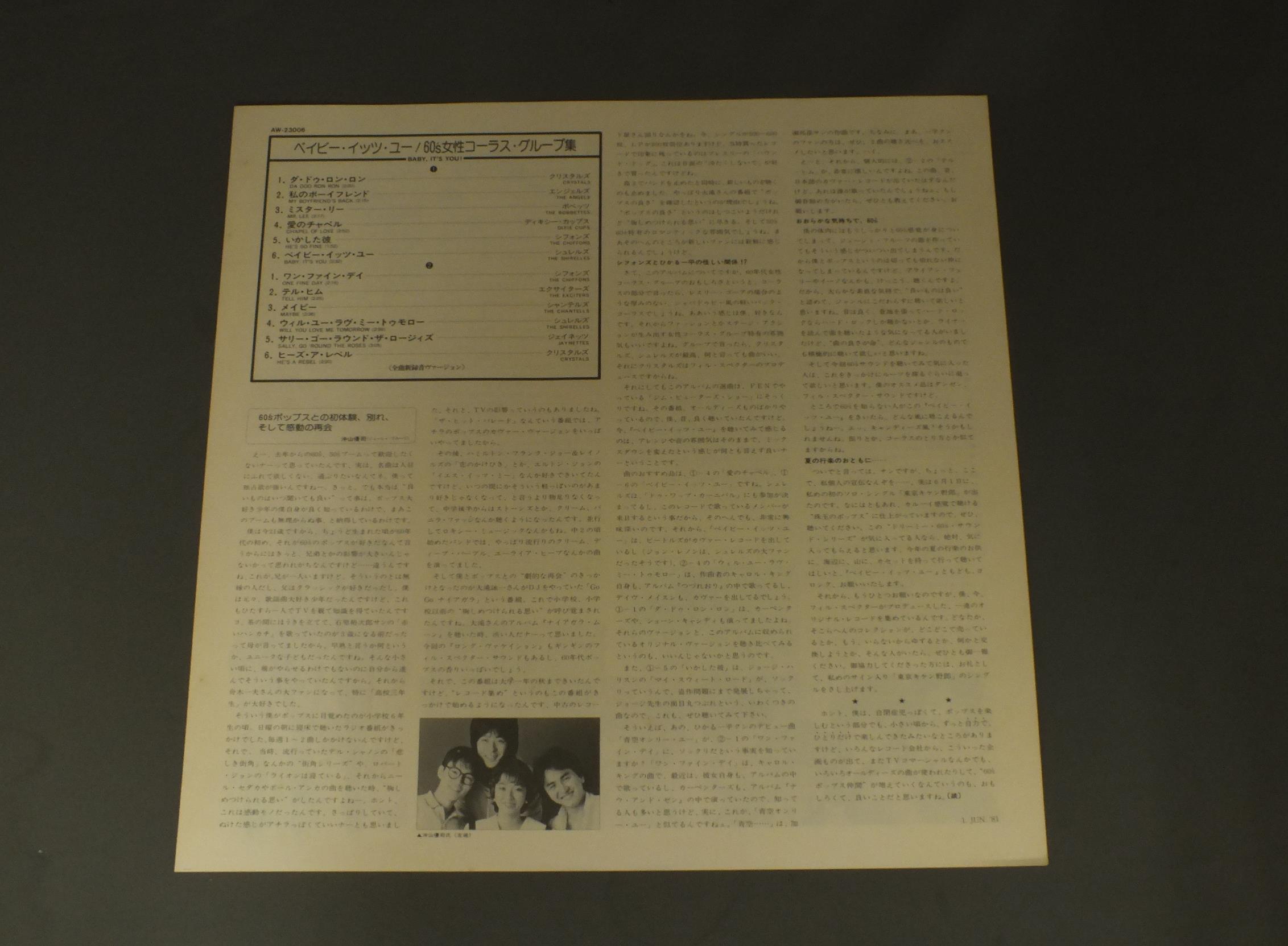 60`S女性コーラス・グループ集/BABY IT`S YOU!シュレルス来日記念盤 AW23006 製造国:日本盤 / Media:LP外観:EX+盤の状態:EX帯:EX 価格(税込):¥564(売約済) 送料 7inch:定形外郵便 360円~LP:定形外郵便 660円~送料は、注文の最終画面で確認頂けます。 > > /BABY IT`S YOU! 外観 (EX+)特記事項:特記なし。外観EX+の共通説明:中古としては美品、一見してきれいでダメージが軽微。シミ、ヨゴレ、スレ有っても僅か~少し。 盤の状態 (EX)特記事項:薄いスリキズ・スレ軽くある感じ。軽微なものの様子です。盤EXの共通説明:盤面のスリキズが薄いものが少し~軽度 音に出そうなものは無いように見える(軽微なソフトティック音は除く)。 帯の状態 (EX):特記なし。 Tweet それぞれの画像をクリックすると、大きい写真が見られます こちらの商品もお勧めです 880円 DOOBIE BROTHERSドゥービー・ブラザーズ / LIVIN` ON THE FAULT LINE運命の掟 770円 SUZI QUATROスージー・クアトロ / SUZI QUATRO STORYスージー・クアトロ・ストーリー 440円 J.GEILS BANDJ.ガイルズ・バンド / SANCTUARY.サンクチュアリー(禁猟区) 1,210円 STYX酢亭久洲 / REPPOO烈風 660円 SUZI QUATROスージー・クアトロ / QUATRO陶酔のアイドル/クアトロ 990円 STYXスティクス / PARADISE THEATERパラダイス・シアター 440円 BOB SEGER & THE SILVER BULLET BANDボブ・シーガー&ザ・シルバー・ブレット・バンド / DISTANCEディスタンス 1,320円 GARY LEWIS AND THE PLAYBOYSゲーリー・ルイスとプレイボーイズ / THIS DIAMOND RING恋のダイアモンド・リング