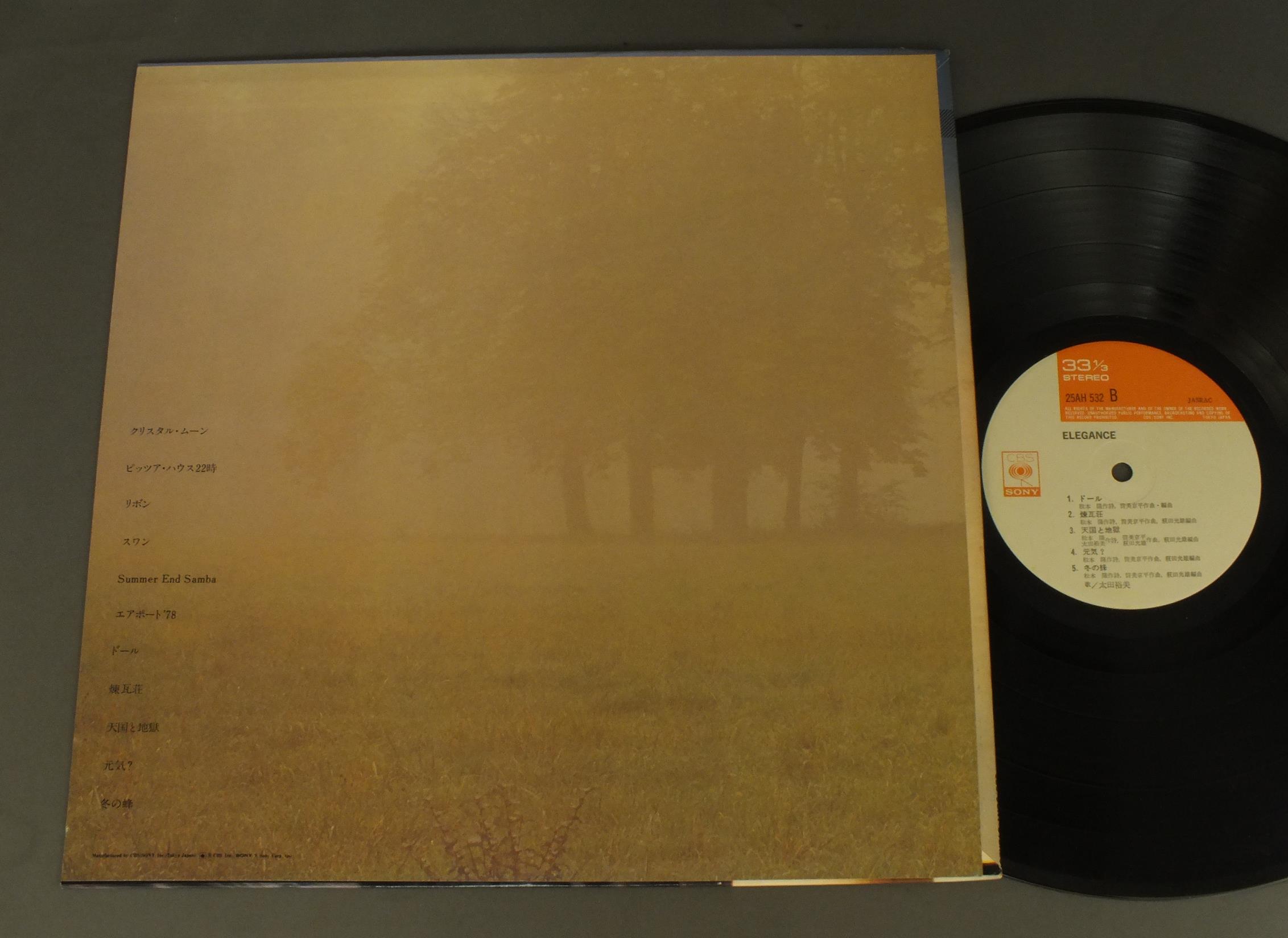 HIROMI OHTA太田裕美/ELEGANCE 25AH532 製造国:日本盤 / Media:LP外観:EX盤の状態:EX+ 価格(税込):¥660(売約済) 送料 7inch:定形外郵便 360円~LP:定形外郵便 660円~送料は、注文の最終画面で確認頂けます。 > > HIROMI OHTA/ELEGANCE 外観 (EX)特記事項:背側に薄いシミ有り。外観EXの共通説明:ダメージが限定的。中古品としては保存状態がよい方。シミ、ヨゴレ、スレ 少し~軽度。 盤の状態 (EX+)特記事項:極薄いスリキズ・スレ少し。一見してきれいな状態です。盤EX+の共通説明:盤面の極薄いスリキズ、スレ少し程度 音に出そうなものは無いように見える(極軽微なソフトティック音は除く)。 Tweet それぞれの画像をクリックすると、大きい写真が見られます こちらの商品もお勧めです 770円 KENJI SAWADA沢田研二 / OMOIKKIRI KIZANA JINSEI思いきり気障な人生 1,210円 ALFIEアルフィー / GREENHORN ( VICTOR YEARS 1974-76 ) + OUTER COVERGREENHORN ( VICTOR YEARS 1974-76 ) + オリジナル外袋 770円 MAYUMI ITSUWA五輪真弓 / MICHI岐路(みち) 770円 KAZUHIKO KATOH加藤和彦 / L`OPERA FRAGILE 770円 KUMIKO YAMASHITA山下久美子 / AME NO H IHA IENIITE雨の日は家にいて 990円 DR. RIVERBEACH & HIS ORCHESTRA / GOOD-BYE SONG BOOK 1,210円 SHOGO HAMADA浜田省吾 / SAND CASTLESAND CASTLE 1,650円 TAKAYUKI INOUE井上堯之 / DON`T DRINK THE WATER WATER MIND 2ドント・ドリンク・ザ・ウォーター(ウォーター・マインド2)