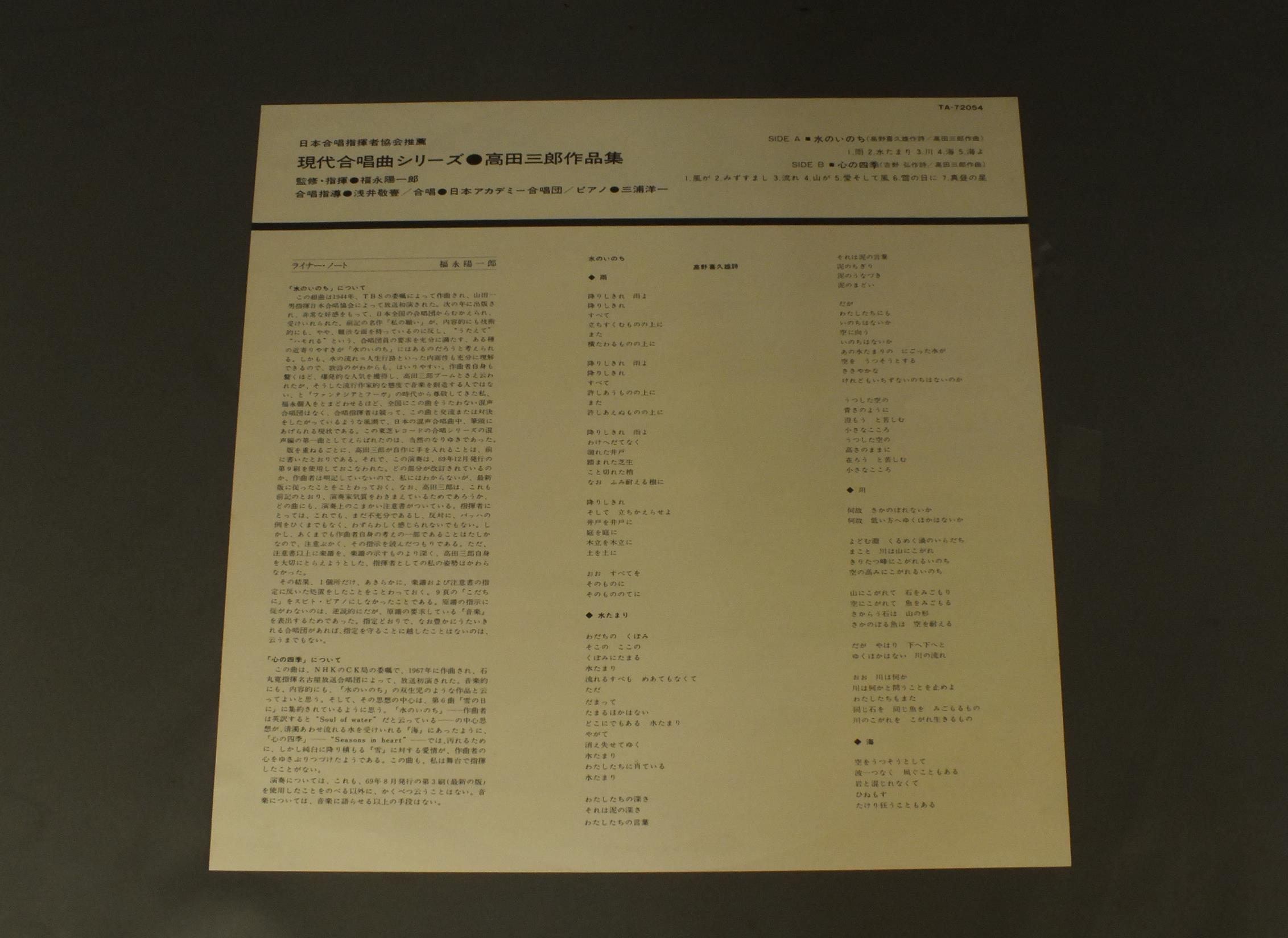 福永陽一郎/水のいのち/高田三郎作品集 TA72054 製造国:日本盤 / Media:LP外観:EX-盤の状態:EX+帯:VG+ 価格(税込):¥1,650(売約済) 送料 7inch:定形外郵便 360円~LP:定形外郵便 660円~送料は、注文の最終画面で確認頂けます。 > > / 外観 (EX-)特記事項:シミ有り外観EX-の共通説明:ダメージ軽度~多少。 中古品としては普通の状態。シミ、ヨゴレ、スレなど軽く~多少。 盤の状態 (EX+)特記事項:極薄いスリキズ・スレ少し。一見してきれいな状態です。盤EX+の共通説明:盤面の極薄いスリキズ、スレ少し程度 音に出そうなものは無いように見える(極軽微なソフトティック音は除く)。 帯の状態 (VG+):特記なし。 その他:白見本盤 Tweet それぞれの画像をクリックすると、大きい写真が見られます こちらの商品もお勧めです 990円 VARIOUS CONDUCTORメトロポリタン・オペラ・ガラ / METROPOLITAN OPERA GALA 1972 APR 221972年4月22日 990円 NEGRI - AMELING - ORCHESTRA DE CHAMBRE DE LAUSANNE etcメグリ - アーメリング - ローザンヌ室内管弦楽団他 / CIMAROSA - REQUIEMチマローザ - レクイエム 1,210円 CALLAS - SERAFIN - PHILHARMONIAカラス - セラフィン - フィルハーモニア管弦楽団 / DONIZETTI - LUCIA DI LAMMERMOOR 1958 2LP SETドニゼッティ - ランメルムーアのルチア全曲 1959 2枚組 1,210円 KNAPPERTSBUSCH - CHORUS AND ORCHESTRA OF THE BAVARIAN STATE OPERA MUNICHクナッパーブッシュ - バイエルン国立歌劇場管弦楽団・合唱団 / ベートーベン - フィデリオ全曲 990円 HOUZAN YAMAMOTO山本邦山/山内喜美子/望月太八 他 / NOZAKI KOUTA和洋合奏野崎小唄 990円 WERNER - ENSEMBLE INSTRUMENTAL DE HEILBORNNヴェルナー - ハイルブロン・シュルツ合唱団&器楽アンサンブル / BACH - GROBEN KANTATENバッハ - 教会カンタータ集13 1,210円 KYOUICH KITAMURA北村協一 - 関西学院グリークラブ他 / TAKEHIKO TAKEDA WORKS ( CONTEMPORARY JAPANESE CHORUS )多田武彦作品集 - 中勘助の詩から他 2,090円 TERUKO ONO小野光子 / ROMANCES TO POEMS BY PUSHKINプーシキンの詩による歌曲集