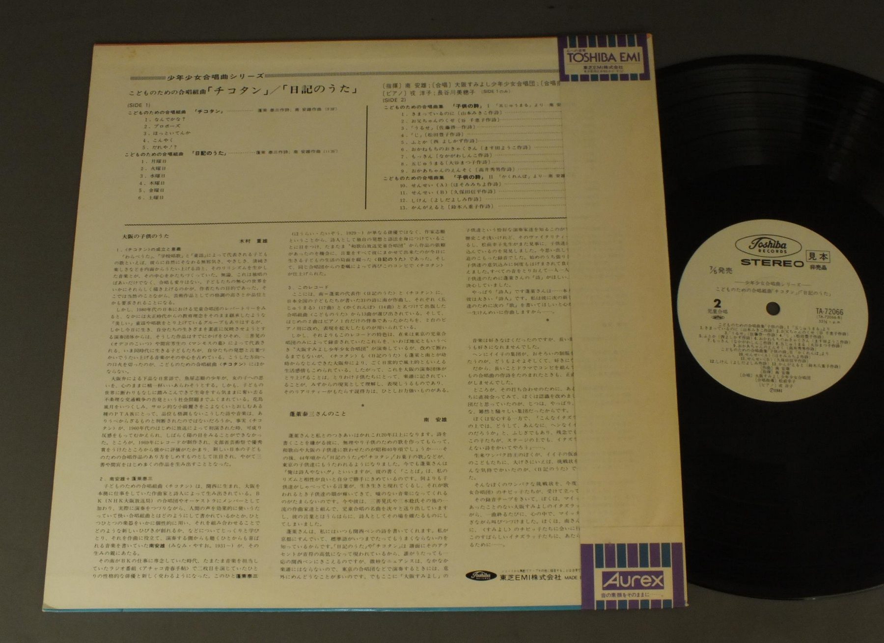南安雄/こどものための合唱組曲「チコタン」 TA72066 製造国:日本盤 / Media:LP外観:EX盤の状態:EX+帯:EX 価格(税込):¥1,650(売約済) 送料 7inch:定形外郵便 360円~LP:定形外郵便 660円~送料は、注文の最終画面で確認頂けます。 > > / 外観 (EX)特記事項:シミ有り外観EXの共通説明:ダメージが限定的。中古品としては保存状態がよい方。シミ、ヨゴレ、スレ 少し~軽度。 盤の状態 (EX+)特記事項:極薄いスリキズ・スレ少し。一見してきれいな状態です。盤EX+の共通説明:盤面の極薄いスリキズ、スレ少し程度 音に出そうなものは無いように見える(極軽微なソフトティック音は除く)。 帯の状態 (EX):特記なし。 その他:白見本盤 Tweet それぞれの画像をクリックすると、大きい写真が見られます こちらの商品もお勧めです 1,320円 WALTERワルター / SCHUMANN - FRAUEN LIEBE UND LEBEN DICHTERLIEBE etcシューマン - 歌曲集 女の愛と生涯 他 1,320円 RITA STREICHリタ・シュトライヒ-クルト・ゲーベル / SINGS IMMORTAL MELODIESジョスランのこもり歌-リタ・シュトライヒ愛唱歌集 1,320円 WUNDERLICH - GIESENヴンダーリッヒ - ギーゼン / SCHUBERT - DIE SCHONE MULLERIN歌曲集 美しき水車小屋の娘 990円 PRO CANTIONE ANTIQUA LONDONブルーノ・ターナー - プロ・カンツィーオーネ・アンティカ / JOHANNES OCKEGHEM - MISSA PRO DEFUNCTISオケゲム - 死者のためのミサ曲 990円 VITTORIO NEGRI - POWER BIGGSヴィットリオ・ネグリ - パワー・ビッグス / GLORY OF GABRIELIガブリエーリの栄光 2,420円 BOHM - DRESDENベーム - ドレスデン国立管弦楽団 / MOZART - DIE ENTRUHRUNG AUS DEM SERAIL 3LP BOXモーツアルト - 後宮よりの誘惑 3枚組 990円 WUNDERLICH- GIESENヴンダーリッヒ-ギーゼン / SCHUBERT SCHONE MULLERIN歌曲集`美しき水車小屋の娘`D795 990円 Y.FUKUNAGA - JAPAN ACADEMY CHORUS福永陽一郎 - 日本アカデミー合唱団 / SABURO TAKADA WORKS (COMTEMPORARY JAPANESE CHORUS )高田三郎作品集 水のいのち