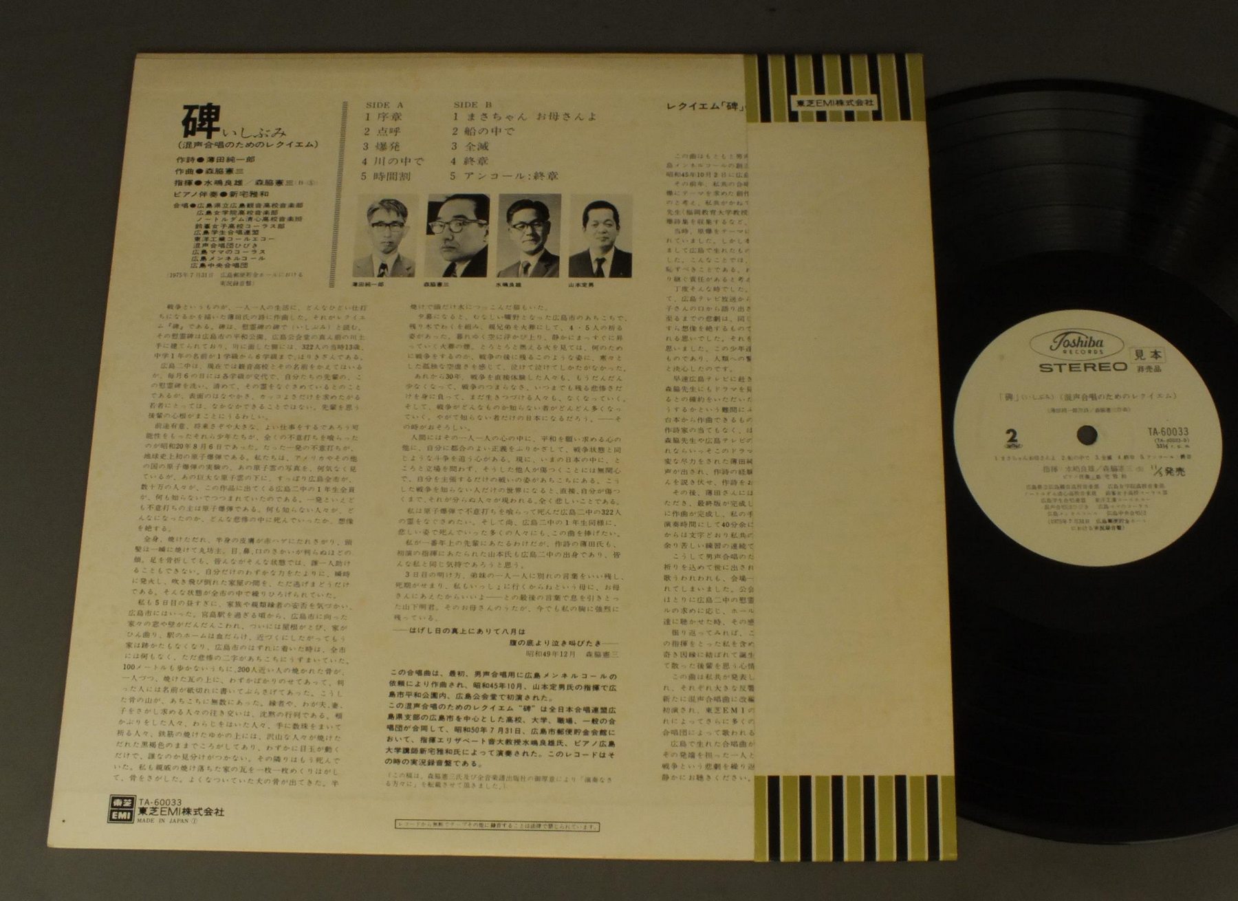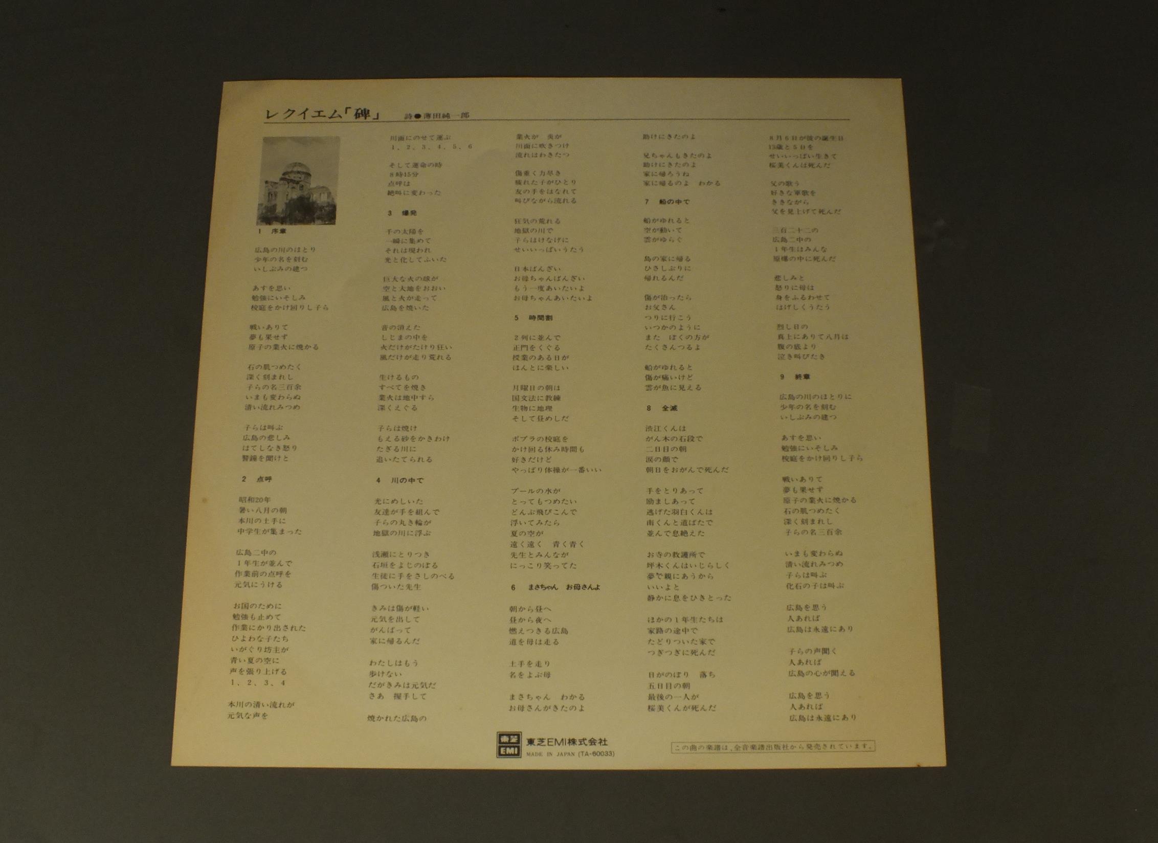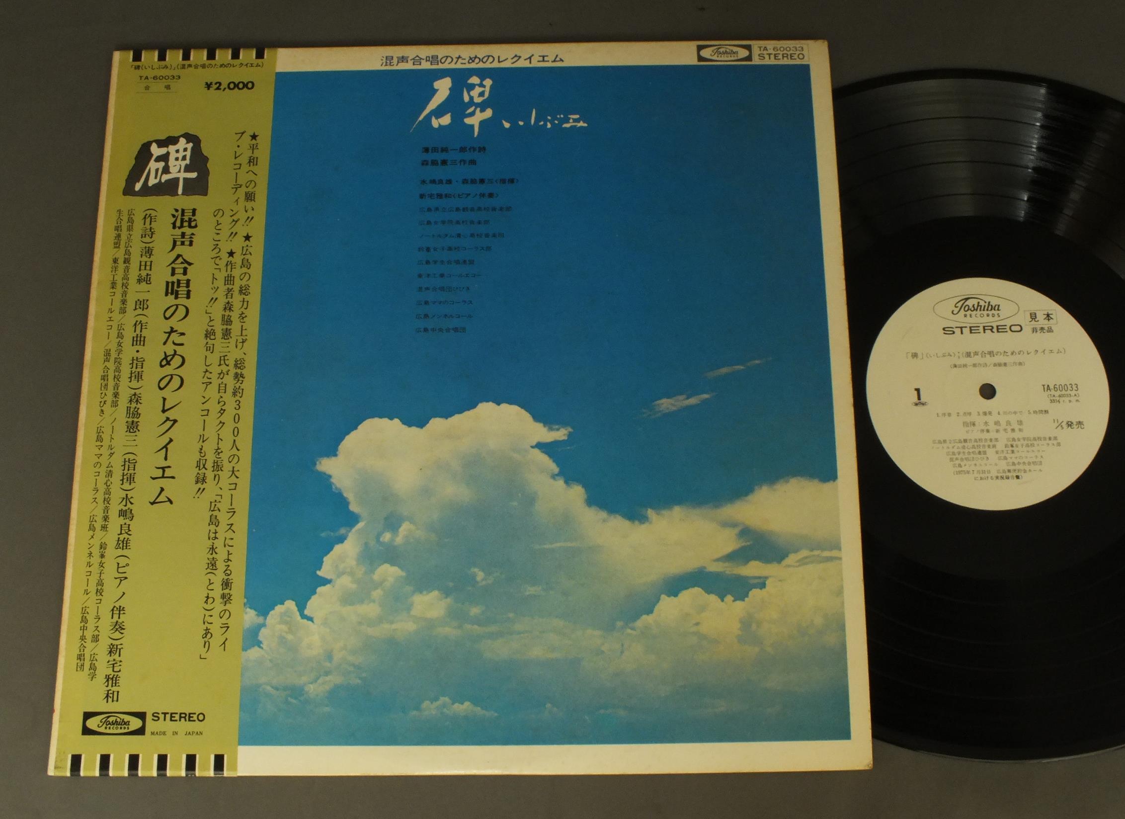 水嶋良雄/「碑(いしぶみ)」(混声合唱のためのレクイエム) TA60033 製造国:日本盤 / Media:LP外観:EX-盤の状態:EX+帯:EX 価格(税込):¥880(売約済) 送料 7inch:定形外郵便 360円~LP:定形外郵便 660円~送料は、注文の最終画面で確認頂けます。 > > / 外観 (EX-)特記事項:シミ有り外観EX-の共通説明:ダメージ軽度~多少。 中古品としては普通の状態。シミ、ヨゴレ、スレなど軽く~多少。 盤の状態 (EX+)特記事項:極薄いスリキズ・スレ少し。一見してきれいな状態です。盤EX+の共通説明:盤面の極薄いスリキズ、スレ少し程度 音に出そうなものは無いように見える(極軽微なソフトティック音は除く)。 帯の状態 (EX):シミ有り その他:白見本盤 Tweet それぞれの画像をクリックすると、大きい写真が見られます こちらの商品もお勧めです 990円 KEGEL-HAITINKケーゲル-ハイティンク / RADIO CHORUS & SYM. ORCH. LEIPZIGブルックナー&ヴェルディ テ・デウム 2,200円 LEVINEレヴァイン / METROPOLITAN OPERA PUCCINI-LA BOHEMEプッチーニ- ボエーム 全四幕 1,320円 TURNERターナー / OCKEGHEM MISSA `ECCE ANCILLA DOMINI`オネゲム ミサ`エッチェ・アンチルラ・ドミニ`他 2,420円 SOLTI - CHICAGO SYM. ORCH.ショルティ - シカゴ交響楽団 / HANDEL - MESSIAH 3LP BOXヘンデル - メサイヤ全曲 3枚組 990円 CARUSOカルーソー / SINGS NEAPOLITAN SONGSナポリ民謡集 1,320円 WINCHERMANNヴィンシャマン / BACH KANTATE BWV210 ARIEバッハ カンタータ第210番-アリア 990円 STEPHANE CAILLAT - PAILLARD CHAMBER ORCHステファンヌ・カイヤー - パイヤール室内管弦楽団 / DELALANDE - DE PROFUNDISドラランド - 大モテット 深き淵より 990円 ROGER BOURDIN & ANNIE CHALLANブルダン&シャラン / DUOS D`AMOUR精霊の踊り