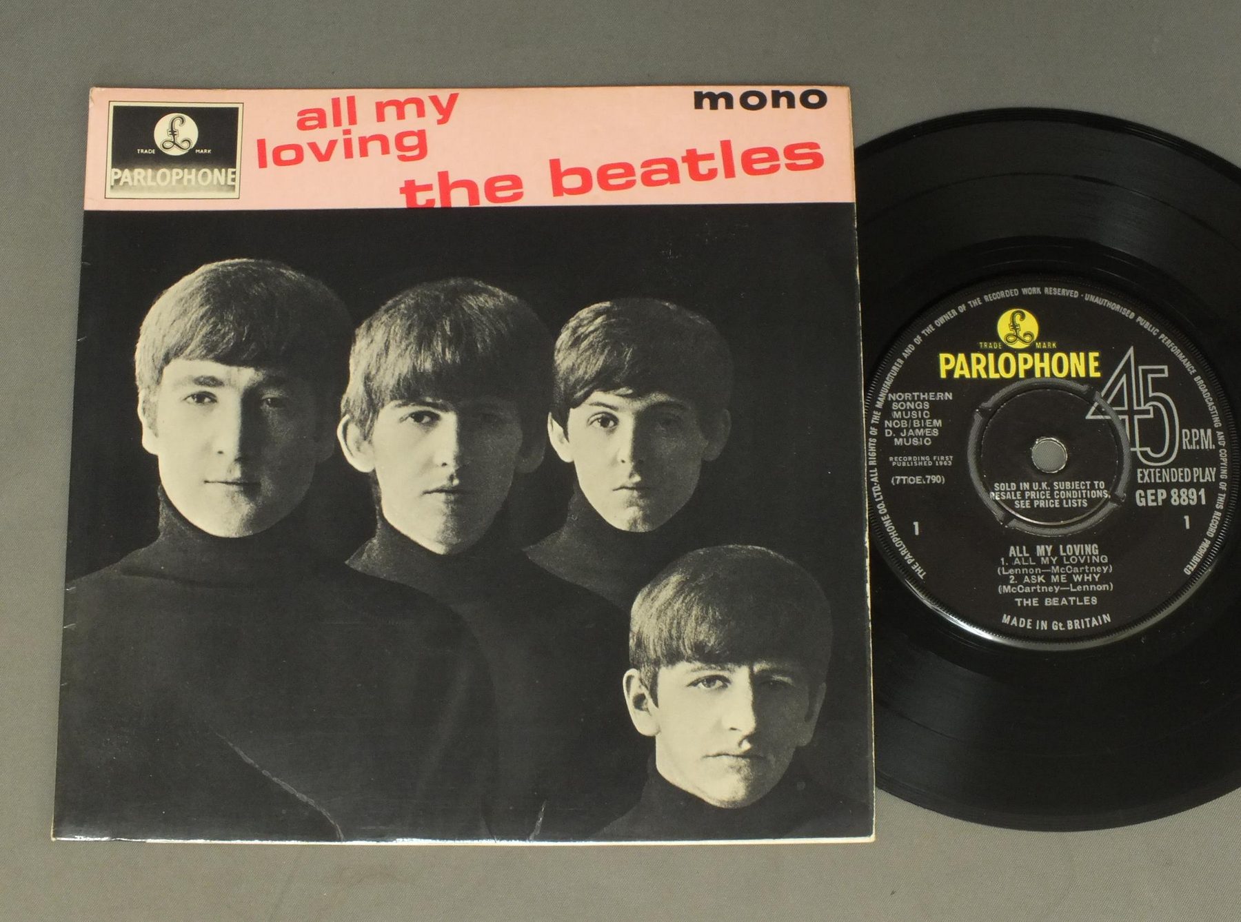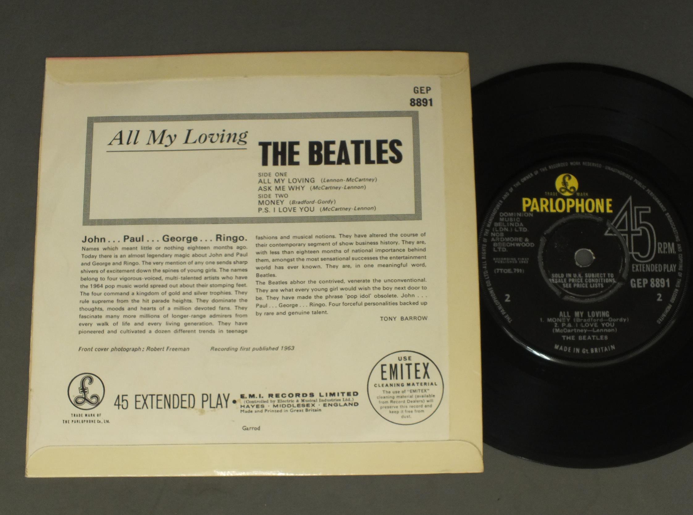 BEATLES/ALL MY LOVING EP GEP8891 製造国:英国盤 / Media:7inchMatrix:1N/1/GH | 1N/2/OM外観:EX盤の状態:EX 価格(税込):¥7,700(売約済) 送料 7inch:定形外郵便 360円~LP:定形外郵便 660円~送料は、注文の最終画面で確認頂けます。 > > BEATLES/ALL MY LOVING EP 外観 (EX)特記事項:全体的にコーティングのヨレシワの少ないきれいな状態。裏ジャケ側もよごれ等は少ないです。外観EXの共通説明:ダメージが限定的。中古品としては保存状態がよい方。シミ、ヨゴレ、スレ 少し~軽度。 盤の状態 (EX)特記事項:薄いスリキズ・スレ少しある程度。音に出そうなものもなく一見してきれいな状態です。曲間など、静かなところを中心にMONO針で聴いて見ましたが、チリノイズ少ないきれいな再生具合でした。盤EXの共通説明:盤面のスリキズが薄いものが少し~軽度 音に出そうなものは無いように見える(軽微なソフトティック音は除く)。 Tweet それぞれの画像をクリックすると、大きい写真が見られます こちらの商品もお勧めです 4,950円 JOHN & YOKO - PLASTIC ONO BANDF / SOME TIME IN NEW YORK CITY 5,500円 BEATLES / AT THE HOLLYWOOD BOWL 5,500円 GEORGE HARRISON / THIRTY THREE & 1/3 5,500円 JOHN LENNON / SHAVED FISH 5,500円 GEORGE HARRISON / LIVING IN THE MATERIAL WORLD