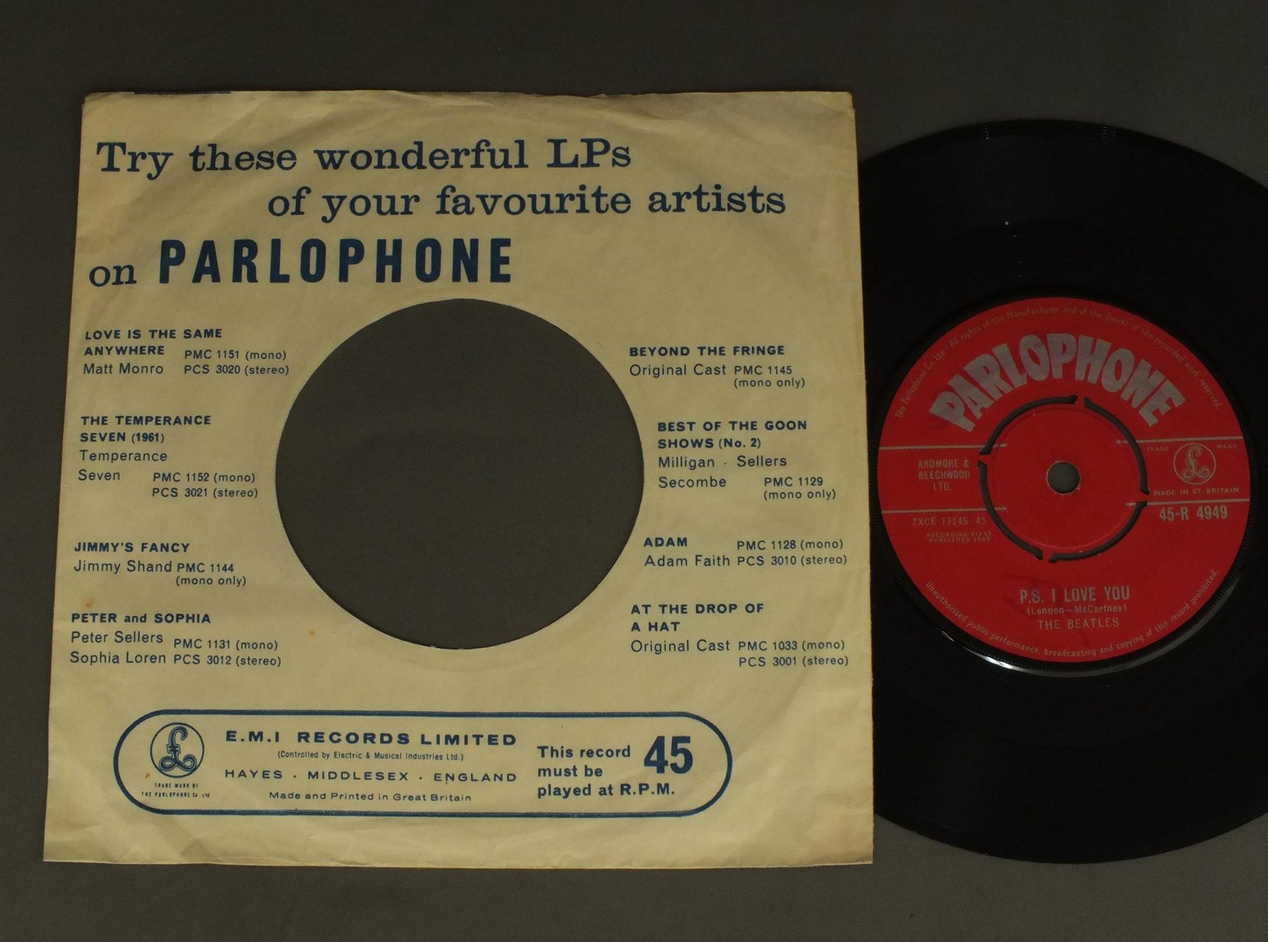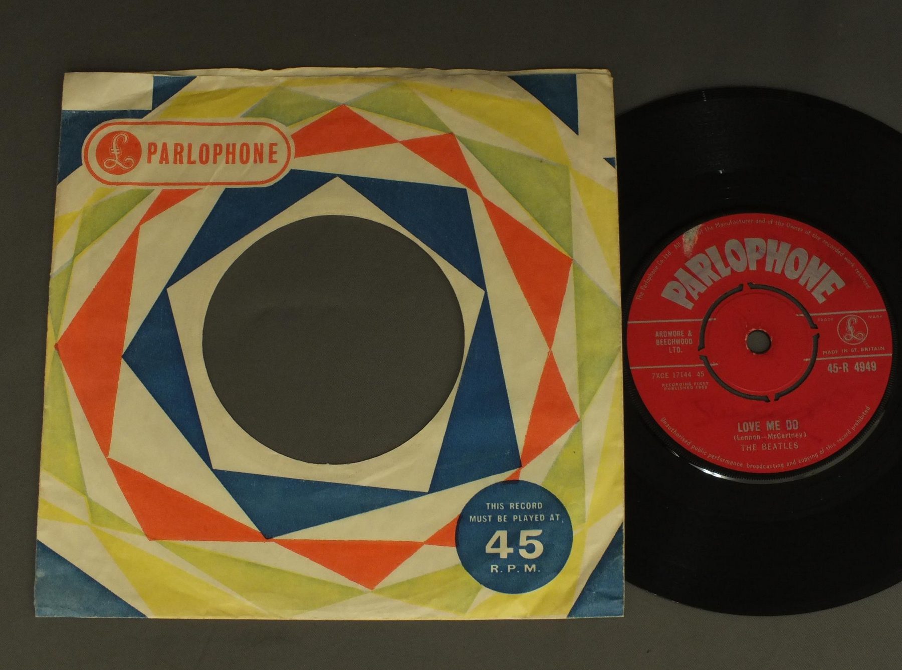 BEATLES/LOVE ME DO赤レーベル 45-R4949 製造国:英国盤 / Media:7inchMatrix:1N/1/A | 1N/1/O外観:EX盤の状態:EX- 価格(税込):¥22,000(売約済) 送料 7inch:定形外郵便 360円~LP:定形外郵便 660円~送料は、注文の最終画面で確認頂けます。 > > BEATLES/LOVE ME DO 外観 (EX)特記事項:PALOPHNE社のカラフルな三角形タイプのカンパニースリーブ。ヨレ多少有りますが、全体的にまだしっかりした感じ残っています。よごれ等も少ない感じ。抜けも無いです。外観EXの共通説明:ダメージが限定的。中古品としては保存状態がよい方。シミ、ヨゴレ、スレ 少し~軽度。 盤の状態 (EX-)特記事項:薄いスリキズ・細かい表面スレ多少-ややある感じですが殆どが軽微なものの様子で、盤面の黒さも残っている感じ。MONO針で聴いてみましたが、チリプチは軽度で音もしっかりなっていて、おすすめの音質。見た目はVG+ですが、サウンドは十分にEX-です。盤EX-の共通説明:盤面のスリキズが多少有り。音に出そうなものは殆ど無いように見える~さほど気にならないぐらいの軽いプチ数カ所程度。 Tweet それぞれの画像をクリックすると、大きい写真が見られます こちらの商品もお勧めです 5,500円 GEORGE HARRISON / LIVING IN THE MATERIAL WORLD 4,950円 JOHN & YOKO - PLASTIC ONO BANDF / SOME TIME IN NEW YORK CITY 5,500円 JOHN LENNON / SHAVED FISH 5,500円 GEORGE HARRISON / THIRTY THREE & 1/3 5,500円 BEATLES / AT THE HOLLYWOOD BOWL