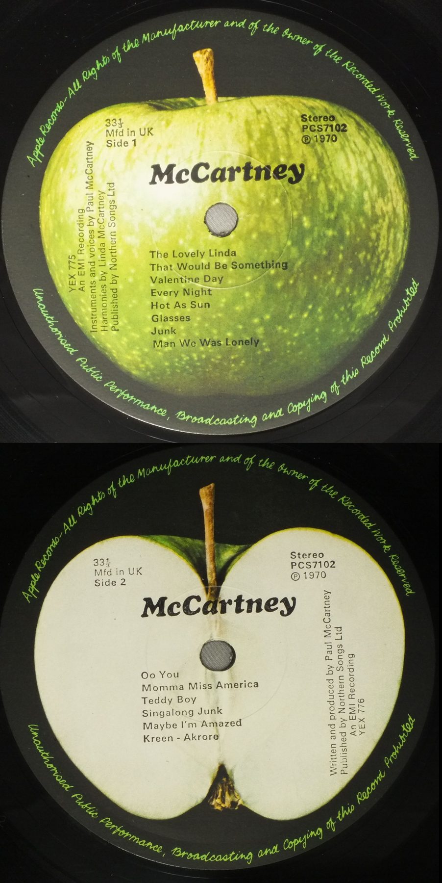 PAUL McCARTNEY/McCARTNEY PCS7102 製造国:英国盤 / Media:LPMatrix:3U/3/OA | 4U/2/RG外観:EX盤の状態:EX 価格(税込):¥4,400(売約済) 送料 7inch:定形外郵便 360円~LP:定形外郵便 660円~送料は、注文の最終画面で確認頂けます。 > > PAUL McCARTNEY/McCARTNEY 外観 (EX)特記事項:見開きまで厚手のコーティング仕様の初期タイプ。全体的にコーティングのヨレシワは少なく、スレやスリキズ等も薄い感じ。きれいな状態です。外観EXの共通説明:ダメージが限定的。中古品としては保存状態がよい方。シミ、ヨゴレ、スレ 少し~軽度。 盤の状態 (EX)特記事項:薄いスリキズ・スレ少しある程度。A4に小キズがあり、数回プチ。他は、音に出そうなものもなく一見してきれいな状態です。曲間など、静かなところを中心に聴いて見ましたが、チリプチノイズ少ないきれいな再生具合でした。盤EXの共通説明:盤面のスリキズが薄いものが少し~軽度 音に出そうなものは無いように見える(軽微なソフトティック音は除く)。 Tweet それぞれの画像をクリックすると、大きい写真が見られます こちらの商品もお勧めです 5,500円 JOHN LENNON / SHAVED FISH 5,500円 BEATLES / AT THE HOLLYWOOD BOWL 5,500円 GEORGE HARRISON / THIRTY THREE & 1/3 4,950円 JOHN & YOKO - PLASTIC ONO BANDF / SOME TIME IN NEW YORK CITY 5,500円 GEORGE HARRISON / LIVING IN THE MATERIAL WORLD