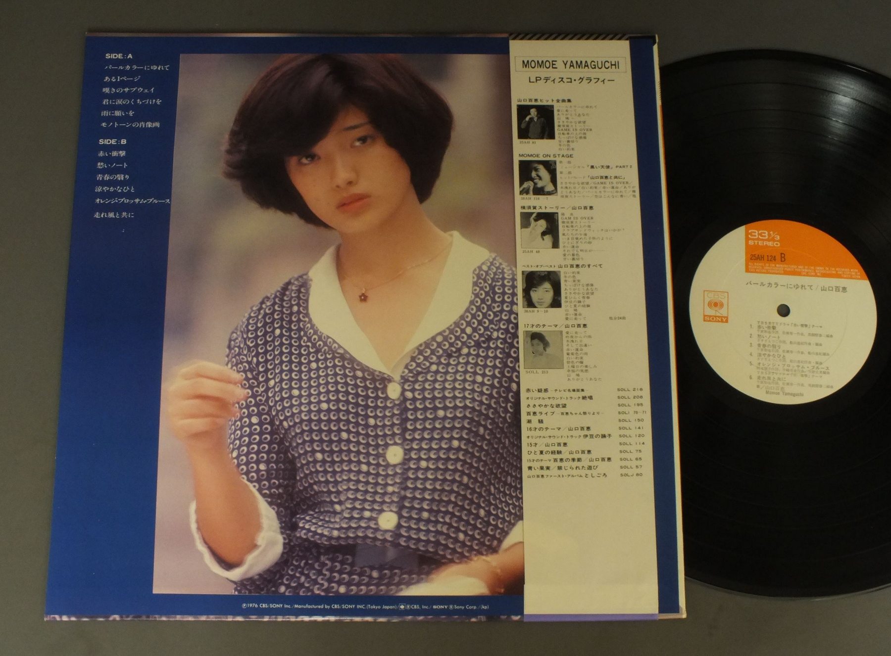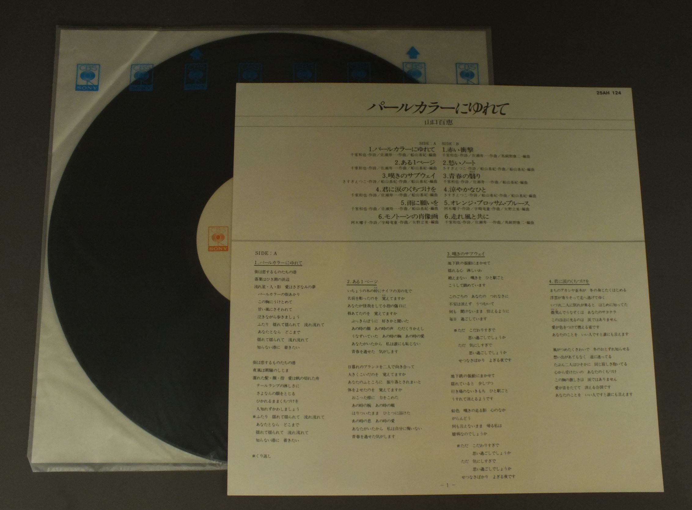 MOMOE YAMAGUCHI山口百恵/PARL COLOUR NI YURETEパールカラーにゆれて 25AH124 製造国:日本盤 / Media:LP外観:EX+盤の状態:EX+帯:EX+ 価格(税込):¥2,858(売約済) 送料 7inch:定形外郵便 360円~LP:定形外郵便 660円~送料は、注文の最終画面で確認頂けます。 > > MOMOE YAMAGUCHI/PARL COLOUR NI YURETE 外観 (EX+)特記事項:特記なし。外観EX+の共通説明:中古としては美品、一見してきれいでダメージが軽微。シミ、ヨゴレ、スレ有っても僅か~少し。 盤の状態 (EX+)特記事項:極薄いスリキズ・スレ少し。一見してきれいな状態です。盤EX+の共通説明:盤面の極薄いスリキズ、スレ少し程度 音に出そうなものは無いように見える(極軽微なソフトティック音は除く)。 帯の状態 (EX+):特記なし。 Tweet それぞれの画像をクリックすると、大きい写真が見られます こちらの商品もお勧めです 880円 YUMI MORIO森尾 由美 / YOU & ME 770円 TOMOYO HARADA原田知世 / NADESHIKO JUNJO撫子純情(なでしこじゅんじょう)-拾七歳バースデイ・アルバム 1,210円 PINK LADYピンク・レディー / PINK LADY CHALLENGE CONCERTピンク・レディー・チャレンジ・コンサート 1,210円 ONYANNKO CLUBおニャン子クラブ / DREAM CATALOGUE夢カタログ 550円 ERI NITTA新田恵利 / E-AREA 770円 YUKO ISHIKAWA石川優子 / SPICYスパイシィ 770円 TSUKASA ITOH伊藤つかさ / TSUKASA IN WONDERLANDふしぎの国のつかさ 1,320円 ONYANKO CLUBおニャン子クラブ / MERRY X`MAS FOR YOU PIC DISCメリー・クリスマス・フォー・ユー