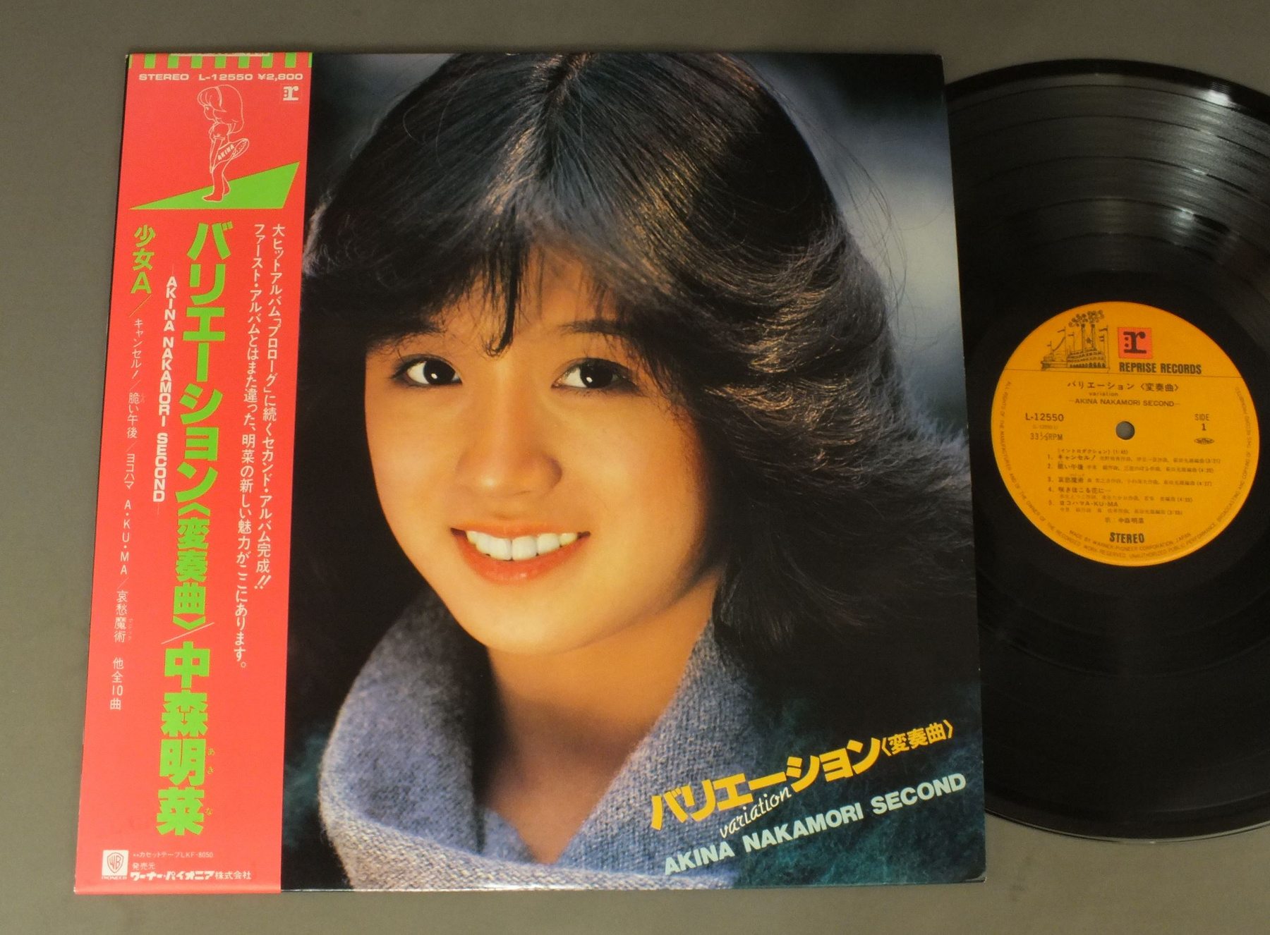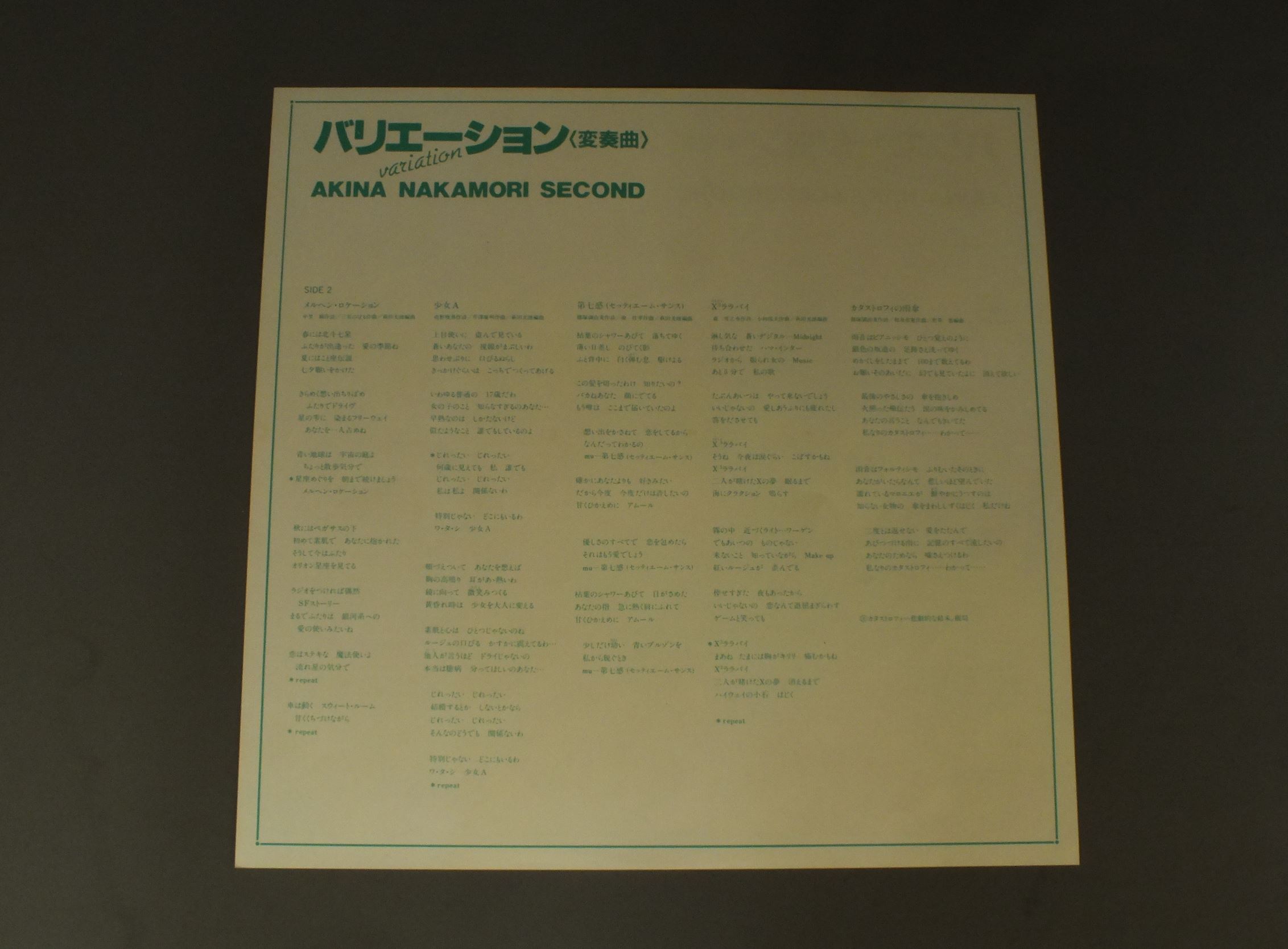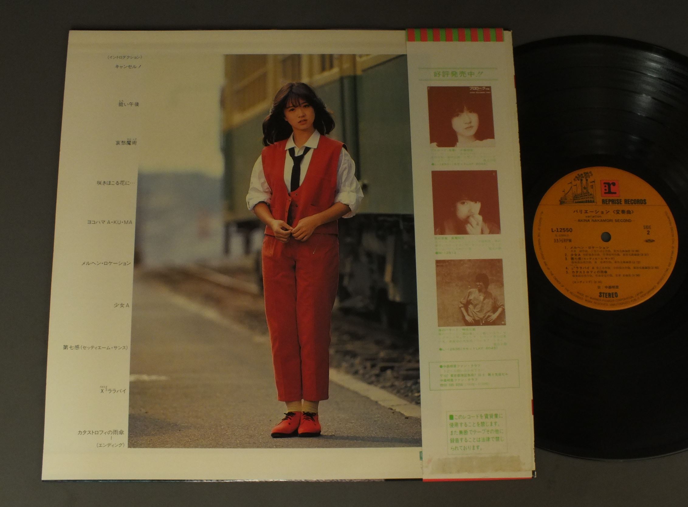 AKINA NAKAMORI中森明菜/VARIATIONバリエーション 変奏曲 L12550 製造国:日本盤 / Media:LP外観:EX+盤の状態:EX+帯:EX+ 価格(税込):¥2,504(売約済) 送料 7inch:定形外郵便 360円~LP:定形外郵便 660円~送料は、注文の最終画面で確認頂けます。 > > AKINA NAKAMORI/VARIATION 外観 (EX+)特記事項:特記なし。外観EX+の共通説明:中古としては美品、一見してきれいでダメージが軽微。シミ、ヨゴレ、スレ有っても僅か~少し。 盤の状態 (EX+)特記事項:極薄いスリキズ・スレ少し。一見してきれいな状態です。盤EX+の共通説明:盤面の極薄いスリキズ、スレ少し程度 音に出そうなものは無いように見える(極軽微なソフトティック音は除く)。 帯の状態 (EX+):特記なし。 Tweet それぞれの画像をクリックすると、大きい写真が見られます こちらの商品もお勧めです 880円 SONOKO KAWAI河合その子 / SONOKOその子 880円 MOMOE YAMAGUCHI山口百恵 / 16s THEME16才のテーマ 880円 SEIKO MATSUDA松田聖子 / MORNING SHOWER映画 プルメリアの伝説 1,210円 USHIRO-YUBI SASAREGUMIうしろゆびさされ組 / 1st LP ( FUWAFURA )ふ・わ・ふ・ら 770円 SHOKO SAWADA沢田聖子 / POTENTIALポテンシャル 770円 SHOKO SAWADA沢田聖子 / SHOKO LIVE 1,870円 ATSUMI KURASAWA倉沢敦美 / MESSAGEメッセージ 550円 ERI NITTA新田恵利 / E-AREA