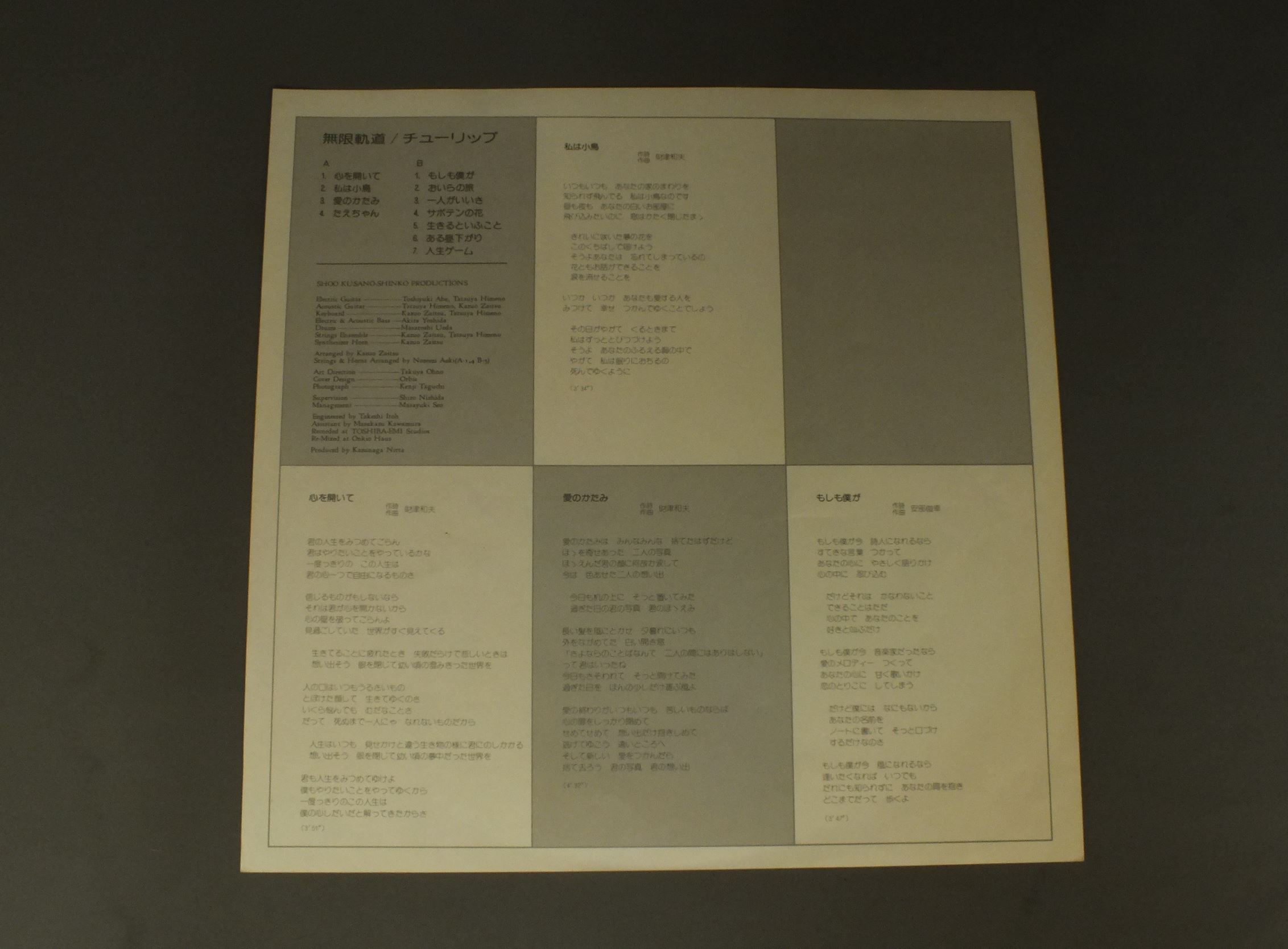 TULIPチューリップ/ENDLESS TRACK無限軌道 ETP72035 製造国:日本盤 / Media:LP外観:EX盤の状態:EX- 価格(税込):¥330(売約済) 送料 7inch:定形外郵便 360円~LP:定形外郵便 660円~送料は、注文の最終画面で確認頂けます。 > > TULIP/ENDLESS TRACK 外観 (EX)特記事項:特記なし。外観EXの共通説明:ダメージが限定的。中古品としては保存状態がよい方。シミ、ヨゴレ、スレ 少し~軽度。 盤の状態 (EX-)特記事項:薄いスリキズ・細かい表面スレ軽くある感じです。プチ出そうな所は少し。軽微なものが中心の様子です。盤EX-の共通説明:盤面のスリキズが多少有り。音に出そうなものは殆ど無いように見える~さほど気にならないぐらいの軽いプチ数カ所程度。 Tweet それぞれの画像をクリックすると、大きい写真が見られます こちらの商品もお勧めです 1,210円 SNAKEMAN SHOWスネークマン・ショー / 急いで口で吸え! 1,210円 ALFIEアルフィー / GREENHORN ( VICTOR YEARS 1974-76 ) + OUTER COVERGREENHORN ( VICTOR YEARS 1974-76 ) + オリジナル外袋 990円 AKIRA KOBAYASHI小林旭 / GOLDEN HITマイトガイ・ゴールデン・ヒット 1,210円 NUMBER ONE BANDザ・ナンバーワン・バンド / TOKYO ATARI東京あたり 770円 KOICHI MORITA & TOP GALLANTS森田公一 & トップギャラン / BEST HITSヒット全曲集 1,210円 KATSUYA KOBAYASHI & NUMBER ONE BANDナンバーワン・バンド / 1st ALBUMもも 770円 `SHOW` AIKAWA哀川翔 / ANTITHESE TRAIN ANTITHESE FLIGHTアンチテーゼ・トレイン アンチテーゼフライト 1,320円 TAKAKO SHIRAI白井貴子 / PRINCESS NIGHTプリンセスナイト