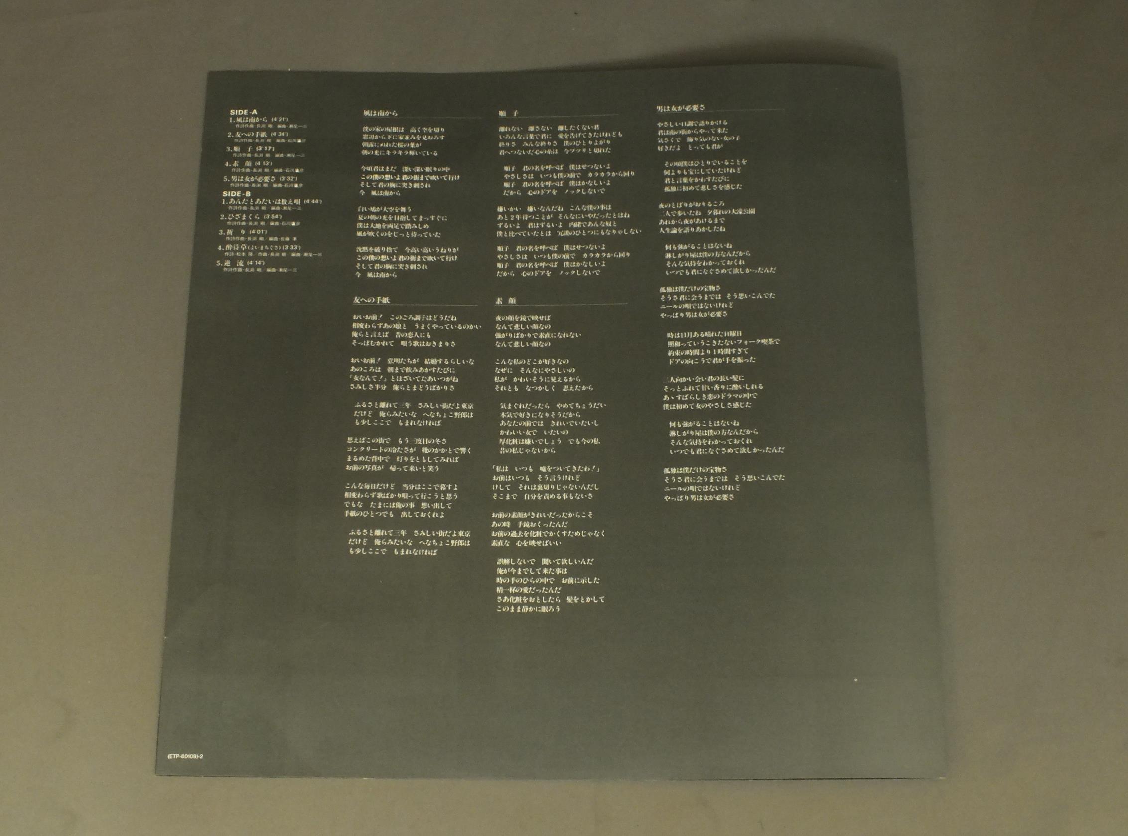 TSUYOSHI NAGABUCHI長渕剛/GYAKURYU逆流 ETP80109 製造国:日本盤 / Media:LP外観:EX+盤の状態:EX+帯:EX+ 価格(税込):¥2,057(売約済) 送料 7inch:定形外郵便 360円~LP:定形外郵便 660円~送料は、注文の最終画面で確認頂けます。 > > TSUYOSHI NAGABUCHI/GYAKURYU 外観 (EX+)特記事項:特記なし。外観EX+の共通説明:中古としては美品、一見してきれいでダメージが軽微。シミ、ヨゴレ、スレ有っても僅か~少し。 盤の状態 (EX+)特記事項:極薄いスリキズ・スレ少し。一見してきれいな状態です。盤EX+の共通説明:盤面の極薄いスリキズ、スレ少し程度 音に出そうなものは無いように見える(極軽微なソフトティック音は除く)。 帯の状態 (EX+):特記なし。 Tweet それぞれの画像をクリックすると、大きい写真が見られます こちらの商品もお勧めです 440円 MARI AMACHI天地真理 / BRIDGE OF A RAINBOW虹をわたって 770円 JAP`S GAP`Sジャップス・ギャップス / JAP`S GAP`Sジャップス・ギャップス 770円 SAKURA & ICHIROUさくらと一郎 / SHOWA KARESUSUKI昭和枯れすすき 770円 HAJIME TACHIBANA立花はじめ / MR. TECHIE & MISS KIPPLE 770円 NOBODYノーバディ / RESTLESS HEARTレストレス・ハート 770円 CANDIESキャンディーズ / CANDIESキャンディーズ 770円 TULIPチューリップ / TULIP BEST心の旅 770円 TULIPチューリップ / BOKU GATSUKUTTA AINO UTAぼくがつくった愛のうた