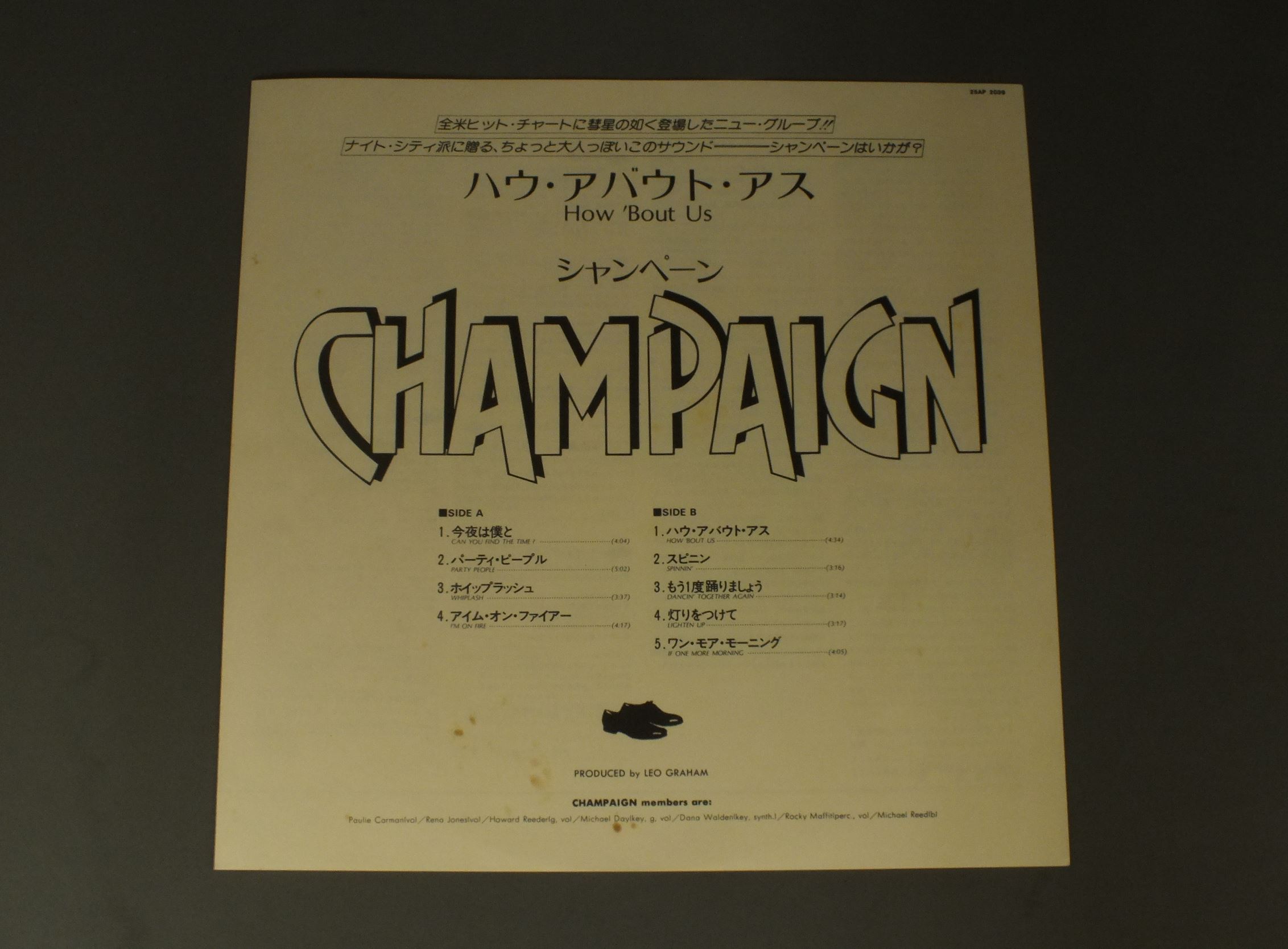 CHAMPAIGNシャンペーン/HOW `BOUT USハウ・アバウト・アス 25AP2039 製造国:日本盤 / Media:LP外観:EX盤の状態:EX 価格(税込):¥2,130(売約済) 送料 7inch:定形外郵便 360円~LP:定形外郵便 660円~送料は、注文の最終画面で確認頂けます。 > > CHAMPAIGN/HOW `BOUT US 外観 (EX)特記事項:シミ軽有り外観EXの共通説明:ダメージが限定的。中古品としては保存状態がよい方。シミ、ヨゴレ、スレ 少し~軽度。 盤の状態 (EX)特記事項:薄いスリキズ・スレ少しある感じ。一見してきれいな感じです。盤EXの共通説明:盤面のスリキズが薄いものが少し~軽度 音に出そうなものは無いように見える(軽微なソフトティック音は除く)。 Tweet それぞれの画像をクリックすると、大きい写真が見られます こちらの商品もお勧めです 1,210円 DRAMATICSドラマティックス / SOMEWHERE IN TIMEドラマティック・リユニオン 1,210円 EARTH. WIND & FIREアース・ウインド&ファイアー / ELECTRIC UNIVERSEエレクトリック・ユニヴァース 1,210円 ASHFORD & SIMPSONアシュフォード&シンプソン / SOLIDソリッド 662円 JOE TEXジョー・テックス / HOLD WHAT YOU`VE GOTホールド・ホワット・ユーヴ・ガット 1,320円 SMOKEY ROBINSONスモーキー・ロビンソン / BEING WITH YOUビーイング・ウィズ・ユー 1,210円 VAN McCOYバン・マッコイ / MY FEVORITE FANTASYマイ・フェバリット・ファンタジー 770円 WRITERS / WRITERSニュー・リズム・マシーン登場 770円 MIRACLESミラクルズ / LOVE CRAZYラブ・クレイジー