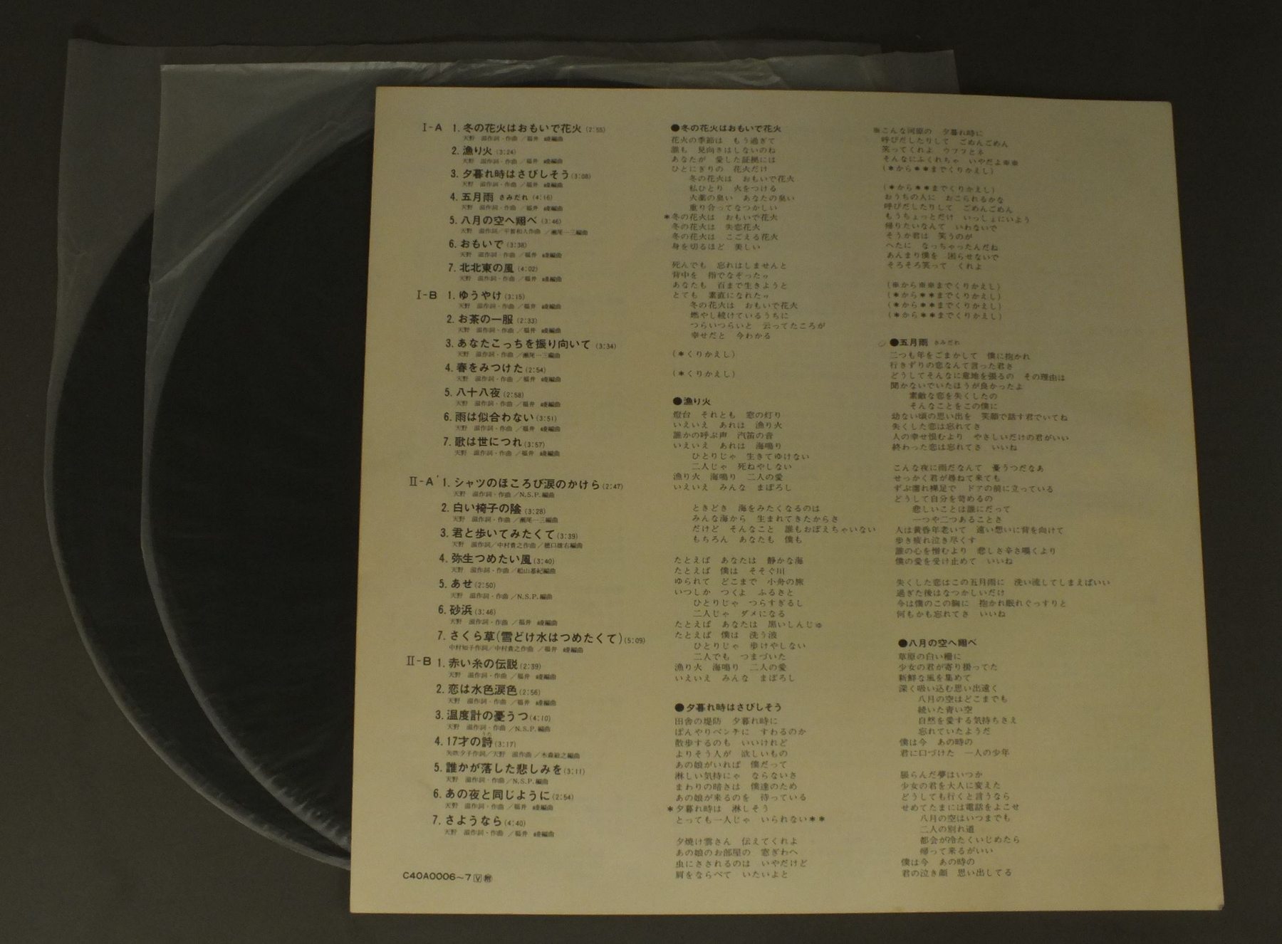 N.S.P./BEST ALBUM青春のかけら達 C40A0006-7 製造国:日本盤 / Media:LP外観:EX+盤の状態:EX+帯:EX+ 価格(税込):¥660(売約済) 送料 7inch:定形外郵便 360円~LP:定形外郵便 660円~送料は、注文の最終画面で確認頂けます。 > > N.S.P./BEST ALBUM 外観 (EX+)特記事項:特記なし。外観EX+の共通説明:中古としては美品、一見してきれいでダメージが軽微。シミ、ヨゴレ、スレ有っても僅か~少し。 盤の状態 (EX+)特記事項:極薄いスリキズ・スレ少し。一見してきれいな状態です。盤EX+の共通説明:盤面の極薄いスリキズ、スレ少し程度 音に出そうなものは無いように見える(極軽微なソフトティック音は除く)。 帯の状態 (EX+):特記なし。 Tweet それぞれの画像をクリックすると、大きい写真が見られます こちらの商品もお勧めです 1,650円 5 RED BALLOONS5つの赤い風船 / 3rd ALBUM巫OLK脱出計画 1,980円 JIRO`Sジローズ / BRAND NEW SONGS JORO`S 2新しい唄 ジローズ 2 1,320円 SHIGERU IZUMIYA泉谷しげる / 3rd ALBUM第三集 地球はお祭りさわぎ 2,200円 KOHEI OIKAWA及川恒平 / 1st ALBUM忘れたお話 及川恒平1 1,210円 NOBUYASU OKABAYASHI岡林信康 / OOINARU ISAN大いなる遺産 1,980円 HAKO YAMAZAKI山崎ハコ / NINGEN MAGAI人間まがい 1,650円 5 BALLOONS五つの赤い風船 / `75 770円 OSAMU KITAYAMA北山修 / OSAMU KITAYAMA ALBUM戦争を知らない子供たち 北山修作詩集