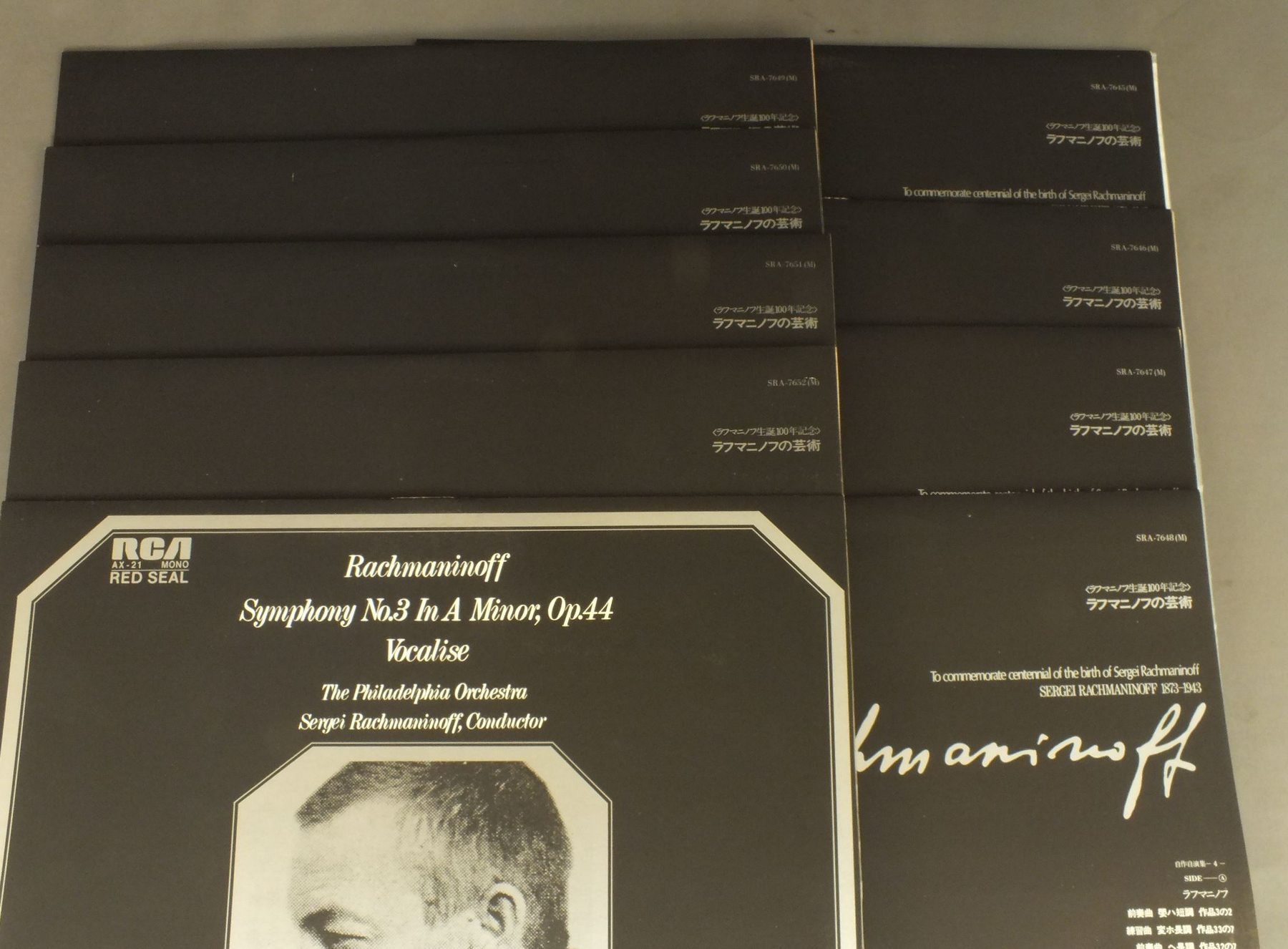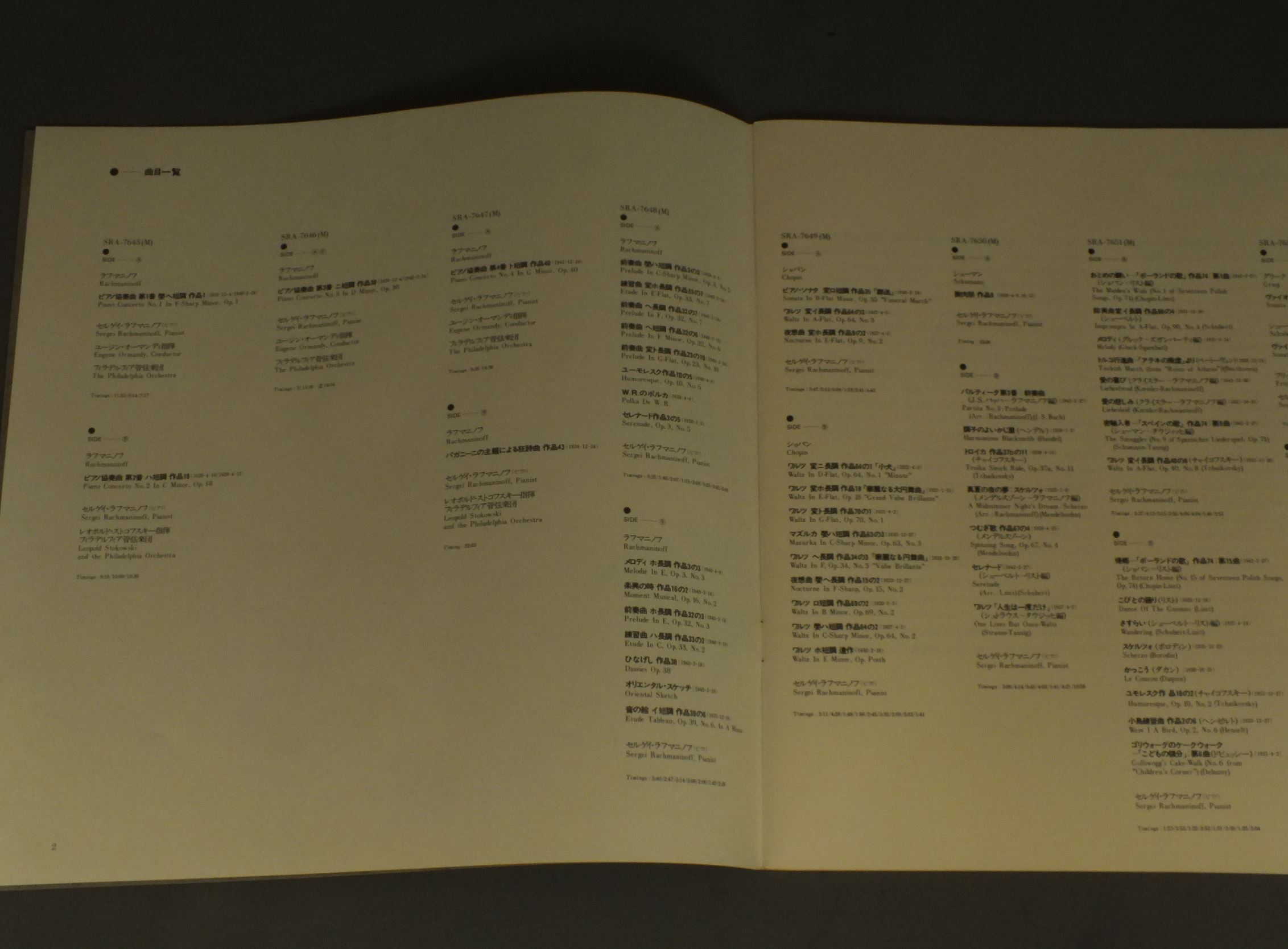 RACHMANINOFFラフマニノフ/TO COMMEMORATE CENTENNIAL OF THE BIRTH OF RACHMANINOFF ラフマニノフ生誕100年記念 ラフマニノフの芸術 SRA7645-52 製造国:日本盤 / Media:LP外観:EX盤の状態:EX+ 価格(税込):¥2,640(売約済) 送料 7inch:定形外郵便 360円~LP:定形外郵便 660円~送料は、注文の最終画面で確認頂けます。 > > RACHMANINOFF/TO COMMEMORATE CENTENNIAL OF THE BIRTH OF RACHMANINOFF 外観 (EX)特記事項:特記なし。外観EXの共通説明:ダメージが限定的。中古品としては保存状態がよい方。シミ、ヨゴレ、スレ 少し~軽度。 盤の状態 (EX+)特記事項:薄いスリキズ・スレ少し。一見してきれいな状態です。盤EX+の共通説明:盤面の極薄いスリキズ、スレ少し程度 音に出そうなものは無いように見える(極軽微なソフトティック音は除く)。 帯の状態 ():特記なし。 その他:8枚組 Tweet それぞれの画像をクリックすると、大きい写真が見られます こちらの商品もお勧めです 1,320円 CLUYTENS - ORCHESTRE DE LA SOCIETE DU CONSERVATOIREクリュイタンス - パリ音楽院管弦楽団 / RAVEL - MA MERE LOYEラヴェル - マ・メール・ロア 1,320円 RAMPAL - LASKINE - LANCERLOT - PAILLARDランパル - ラスキーヌ - ランスロ - パイヤール / MOZART - CONSERTO FOR FLUTE & HARPモーツァルト - フルートとハープのための協奏曲 990円 BOHM - WIENER PHIL.ベーム - ウィーン・フィル / MOZART - SYMPHONEY NO40 & 41モーツアルト交響曲第40番41番 770円 NEUMANN - CZECH PHILHARMONICノイマン - チェコ・フィル / DVORAK - SYMPHONY NO9 FROM THE NEW WORLDドヴォルザーク - 新世界・モルダウ 1,430円 GILELS - JOCHUM - BERLIN PHILHARMONIC ORCHESTRAギレリス - ヨッフム - ベルリンフィルハーモニー管弦楽団 / BRAHMS - PIANO CONCERT NO.2ブラームス - ピアノ協奏曲第2番 770円 MURAVINSKY - LENINGRAD PHILHARMONICムラヴィンスキー - レニングラード・フィル / THCHAIKOVSKY - SYMPHONY NO5チャイコフスキー - 交響曲第5番 990円 MAAZELマーゼル / BEETHOVEN SYM. NO6 `PASTORAL`ベートーヴェン 交響曲第6番 `田園` 990円 CLIBURN-ORMANDYクライバーン-オーマンディ / GRIEG-CONC.-LISZT-CONC. NO1グリーク-ピアノ協奏曲 -リスト-ピアノ協奏曲 第1番