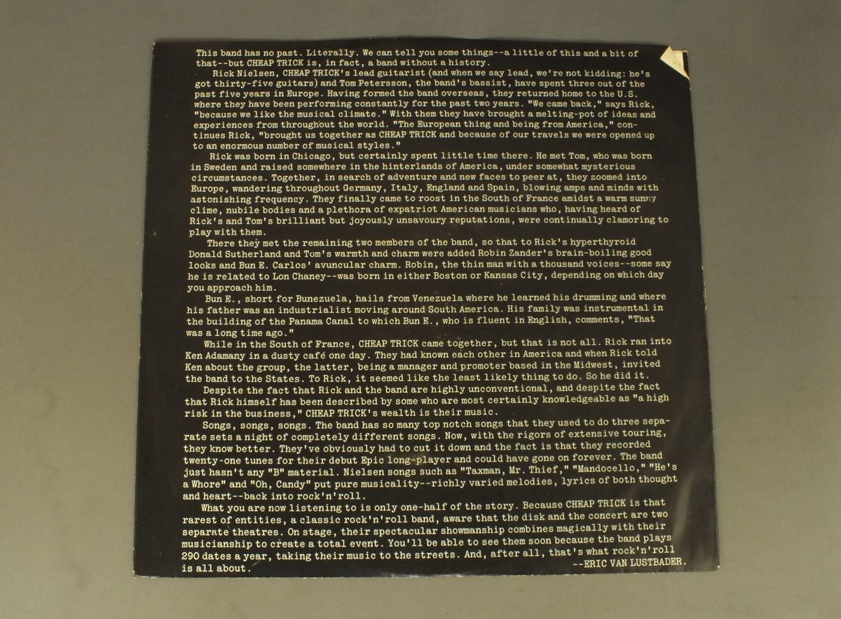 CHEAP TRICK/CHEAP TRICK BL34000 製造国:米国盤 / Media:LP外観:EX盤の状態:EX+ 価格(税込):¥1,100(売約済) 送料 7inch:定形外郵便 360円~LP:定形外郵便 660円~送料は、注文の最終画面で確認頂けます。 > > CHEAP TRICK/CHEAP TRICK 外観 (EX)特記事項:特記なし。外観EXの共通説明:ダメージが限定的。中古品としては保存状態がよい方。シミ、ヨゴレ、スレ 少し~軽度。 盤の状態 (EX+)特記事項:極薄いスリキズ・スレ少し。一見してきれいな状態です。盤EX+の共通説明:盤面の極薄いスリキズ、スレ少し程度 音に出そうなものは無いように見える(極軽微なソフトティック音は除く)。 Tweet それぞれの画像をクリックすると、大きい写真が見られます こちらの商品もお勧めです 1,100円 INNCONTROLLABILE SERPENTI / BIANCANEVE E GORBACIOV 1,980円 PRISONSHAKE / ROARING THIRD 990円 AND ALL BECAUSE THE LADY LOVES / ANYTHING BUT A SOFT CENTRE 1,320円 UNTOUCHABLES / WILD CHILD 990円 ROUGH TRADE ARTISTS / HERE`S EGG ON OUR FACE !( 8 TRACKS EASTER PROMO ) 1,320円 UK 80s SMALL GROUPS / TIMEBOX 1,210円 PICKLES / MINDYARD 1,650円 FRONT / UNDERWORLD