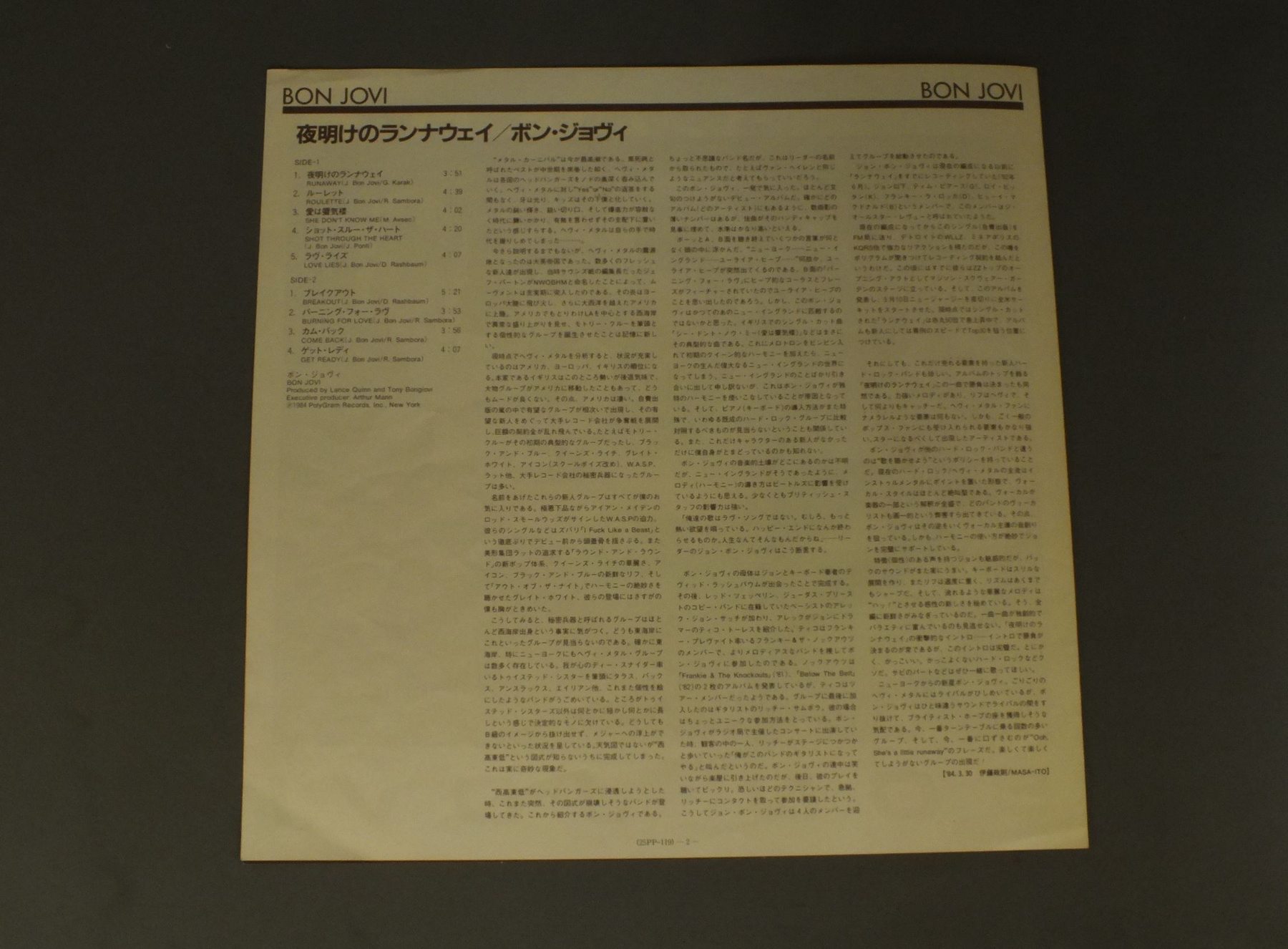 BON JOVI/BON JOVI 25PP119 製造国:米国盤 / Media:LP外観:EX-盤の状態:EX- 価格(税込):¥550(売約済) 送料 7inch:定形外郵便 360円~LP:定形外郵便 660円~送料は、注文の最終画面で確認頂けます。 レコード検索 > > BON JOVI/BON JOVI 外観 (EX-)特記事項:特記なし。外観EX-の共通説明:ダメージ軽度~多少。 中古品としては普通の状態。シミ、ヨゴレ、スレなど軽く~多少。 盤の状態 (EX-)特記事項:薄いスリキズ・細かい表面スレ軽くある感じです。プチ出そうな所は少し。軽微なものが中心の様子です。盤EX-の共通説明:盤面のスリキズが多少有り。音に出そうなものは殆ど無いように見える~さほど気にならないぐらいの軽いプチ数カ所程度。 Tweet それぞれの画像をクリックすると、大きい写真が見られます こちらの商品もお勧めです 1,650円 HEAVEN / HEAVEN 1,100円 ARASKA / HEART OF THE STORM 1,760円 QUIET RIOT / CONDITION CRITICAL 770円 SCHON & HAMMER / HERE TO STAY 1,540円 SAMSON / SURVIVORS 1,650円 HELIX / NO REST FOR THE WICKED 1,650円 IN/HUMANITY / HISTRORY BEHINED THE MYSTERY 880円 SAMMY HAGAR / SAMMY HAGAR