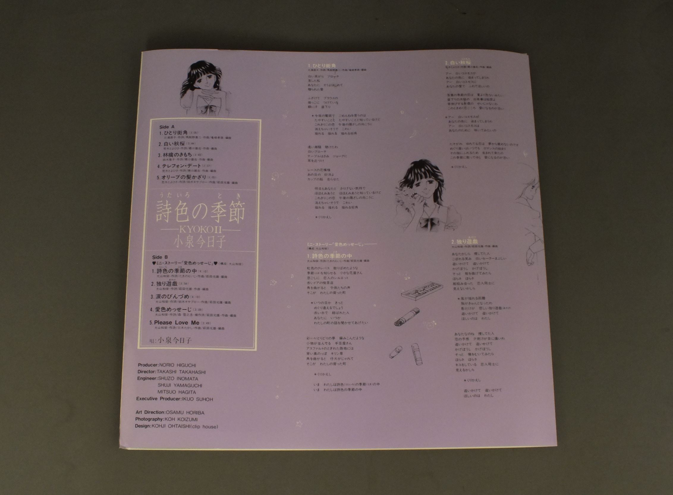 KYOKO KOIZUMI小泉今日子/KYOKO 2詩色の季節 SJX30719 製造国:日本盤 / Media:LP外観:EX+盤の状態:EX+帯:EX+ 価格(税込):¥660(売約済) 送料 7inch:定形外郵便 360円~LP:定形外郵便 660円~送料は、注文の最終画面で確認頂けます。 > > KYOKO KOIZUMI/KYOKO 2 外観 (EX+)特記事項:特記なし。外観EX+の共通説明:中古としては美品、一見してきれいでダメージが軽微。シミ、ヨゴレ、スレ有っても僅か~少し。 盤の状態 (EX+)特記事項:極薄いスリキズ・スレ少し。一見してきれいな状態です。盤EX+の共通説明:盤面の極薄いスリキズ、スレ少し程度 音に出そうなものは無いように見える(極軽微なソフトティック音は除く)。 帯の状態 (EX+):特記なし。 Tweet それぞれの画像をクリックすると、大きい写真が見られます こちらの商品もお勧めです 1,210円 TSUKASA ITOH伊藤つかさ / SAYONARA KONNICHIWAさよなら、こんにちは 880円 SONOKO KAWAI河合その子 / SONOKOその子 880円 MAKO ISHINO石野真子 / MAKO2 770円 ERI NITTA新田恵利 / ERI 440円 ERI E-AREA新田恵利 / ERI E-AREA 770円 SHOKO SAWADA沢田聖子 / KAZEN NO YOKAN風の予感 660円 YUKO ISHIKAWA石川優子 / SENTIMENTAL ROADセンチメンタル・ロード 2,640円 MINAKO HONDA本田美奈子 / MINAKO THE VIRGIN CONCERTMINAKO ザ・ヴァージン・コンサート