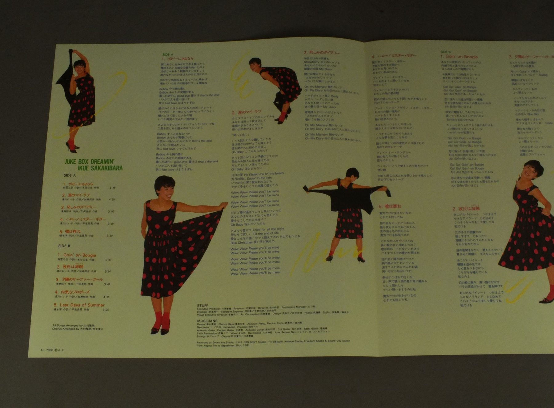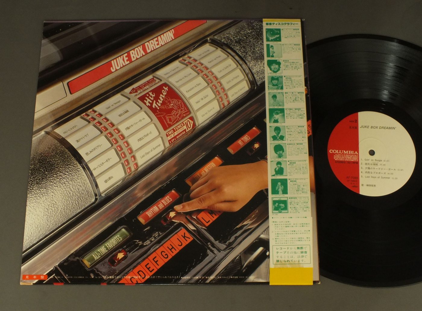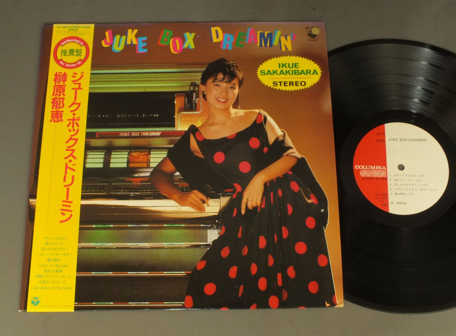 IKUE SAKAKIBARA榊原郁恵/JUKE BOX DREAMIN`ジューク・ボックス・ドリーミン AF7088 製造国:日本盤 / Media:LP外観:EX盤の状態:EX+帯:EX 価格(税込):¥1,986(売約済) 送料 7inch:定形外郵便 360円~LP:定形外郵便 660円~送料は、注文の最終画面で確認頂けます。 > > IKUE SAKAKIBARA/JUKE BOX DREAMIN` 外観 (EX)特記事項:特記なし。外観EXの共通説明:ダメージが限定的。中古品としては保存状態がよい方。シミ、ヨゴレ、スレ 少し~軽度。 盤の状態 (EX+)特記事項:極薄いスリキズ・スレ少し。一見してきれいな状態です。盤EX+の共通説明:盤面の極薄いスリキズ、スレ少し程度 音に出そうなものは無いように見える(極軽微なソフトティック音は除く)。 帯の状態 (EX):特記なし。 Tweet それぞれの画像をクリックすると、大きい写真が見られます こちらの商品もお勧めです 770円 NAOKO KAWAI河合奈保子 / LOVEラブ 1,210円 ONYANKO CLUB河合その子 国生さゆり 城之内早苗 渡辺美奈子 渡辺満里奈 / MERRY X`MAS FOR YOU PICTURE DISCメリー・クリスマス・フォー・ユー 660円 YUKO ISHIKAWA石川優子 / SENTIMENTAL ROADセンチメンタル・ロード 770円 SEIKO MATSUDA松田聖子 / SEIKO TOWN 660円 HIROKO TANIYAMA谷山浩子 / MOUHITORI NO ALICEもうひとりのアリス 1,210円 SAYURI KOKUSHO国生さゆり / TRANSIT 1,210円 USHIRO-YUBI SASAREGUMIうしろゆびさされ組 / 1st LP ( FUWAFURA )ふ・わ・ふ・ら 660円 TOSHIRO OHMI近江俊郎 / BEST COLLECTION懐かしの歌声デラックス 湯の町エレジー