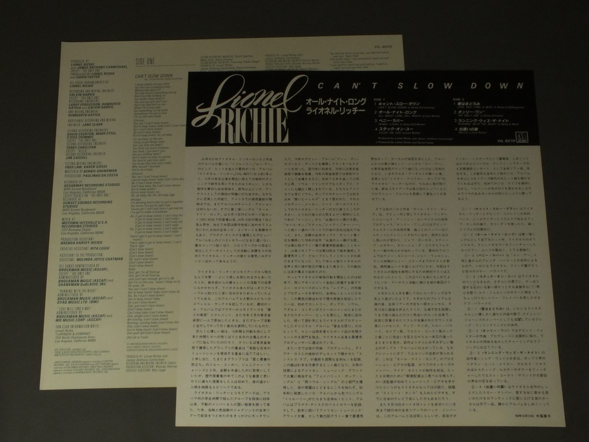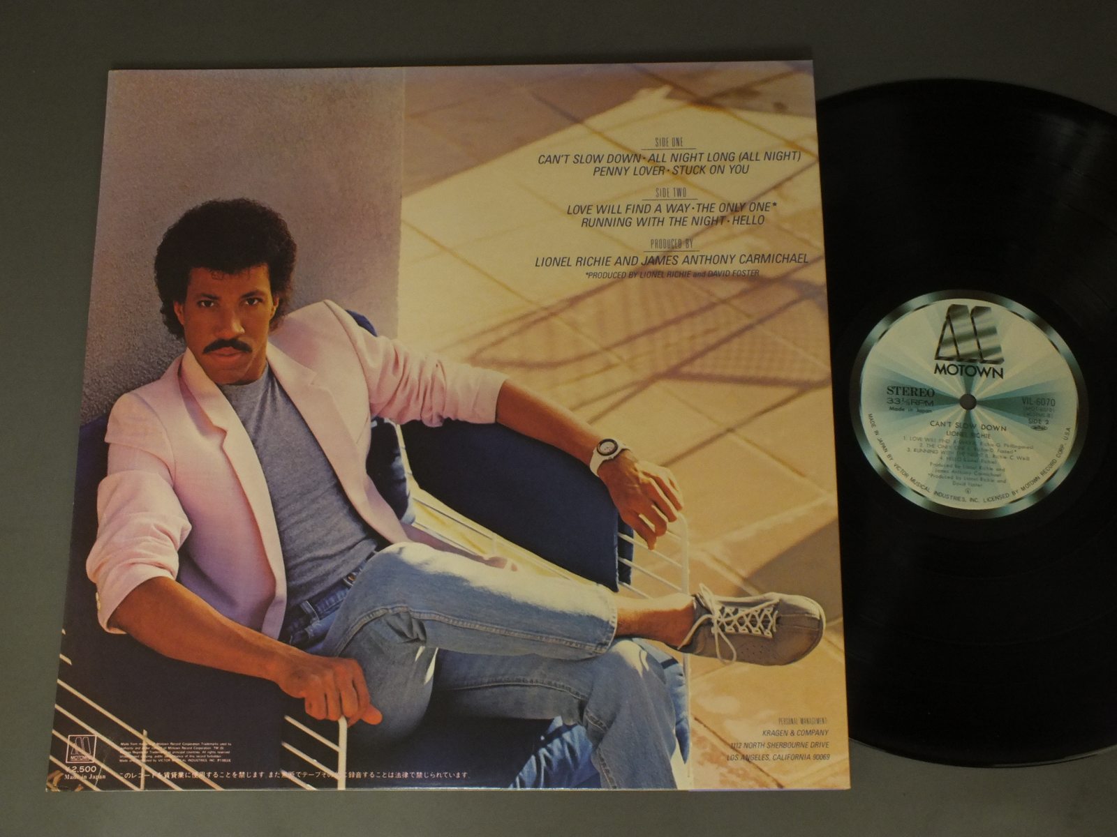 LIONEL RICHIEライオネル・リッチー/CAN`T SLOW DOWNオール・ナイト・ロング VIL6070 製造国:日本盤 / Media:LP外観:EX盤の状態:EX+帯:EX+ 価格(税込):¥330(売約済) 送料 7inch:定形外郵便 360円~LP:定形外郵便 660円~送料は、注文の最終画面で確認頂けます。 > > LIONEL RICHIE/CAN`T SLOW DOWN 外観 (EX)特記事項:特記なし。外観EXの共通説明:ダメージが限定的。中古品としては保存状態がよい方。シミ、ヨゴレ、スレ 少し~軽度。 盤の状態 (EX+)特記事項:極薄いスリキズ・スレ少し。一見してきれいな状態です。盤EX+の共通説明:盤面の極薄いスリキズ、スレ少し程度 音に出そうなものは無いように見える(極軽微なソフトティック音は除く)。 帯の状態 (EX+):特記なし。 Tweet それぞれの画像をクリックすると、大きい写真が見られます こちらの商品もお勧めです 1,210円 TEMPTATIONSテンプテーションズ / TOUCH MEタッチ・ミー 1,320円 DIANA ROSS & THE SUPREMESダイアナ・ロスとシュープリームス / THE BEST OF DIANA ROSS & THE SUPREMESダイアナ・ロスとシュープリームスの全て 660円 TEMPTATIONSテンプテーションズ / POWERパワー 1,210円 GRANDMASTER FLASHグランドマスター・フラッシュ / SOURCEソース 1,320円 DELLSデルズ / THERE ISゼア・イズ 440円 STYLISTICSスタイリスティックス / ONCE UPON A JUKE BOX想い出のジューク・ボックス 660円 GLADYS KNIGHT & THE PIPSグラディス・ナイト&ザ・ピップス / IMAGINATIONイマジネイション 1,210円 DRAMATICSドラマティックス / SO WHAT YOU WANNA DO愛にめざめて