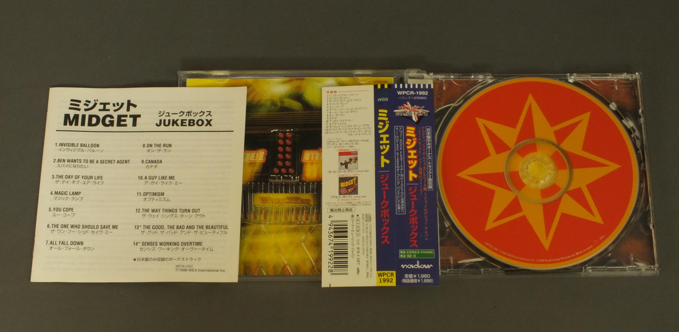 MIDGETミジェット/JUKEBOXジュークボックス WPCR1992 製造国:日本盤 / Media:CD外観:EX+盤の状態:EX帯:EX+ 価格(税込):¥330 送料 7inch:定形外郵便 360円~LP:定形外郵便 660円~送料は、注文の最終画面で確認頂けます。 > > MIDGET/JUKEBOX 外観 (EX+)特記事項:ヨレ、スレ少々。ヨゴレなども少しだけできれいな感じです。外観EX+の共通説明:中古としては美品、一見してきれいでダメージが軽微。シミ、ヨゴレ、スレ有っても僅か~少し。 盤の状態 (EX)特記事項:薄いスリキズが少しありますが、軽微な感じ。盤EXの共通説明:盤面のスリキズが薄いものが少し~軽度 音に出そうなものは無いように見える(軽微なソフトティック音は除く)。 帯の状態 (EX+):あまりヨレやよごれ等は無くきれいな感じ。 Tweet それぞれの画像をクリックすると、大きい写真が見られます こちらの商品もお勧めです 11,000円 POWER STATION / DANCING IN THE STREET ( LIVE AT UNIVERSAL AMPITI THEATRE USA JULY 28th 1985 )