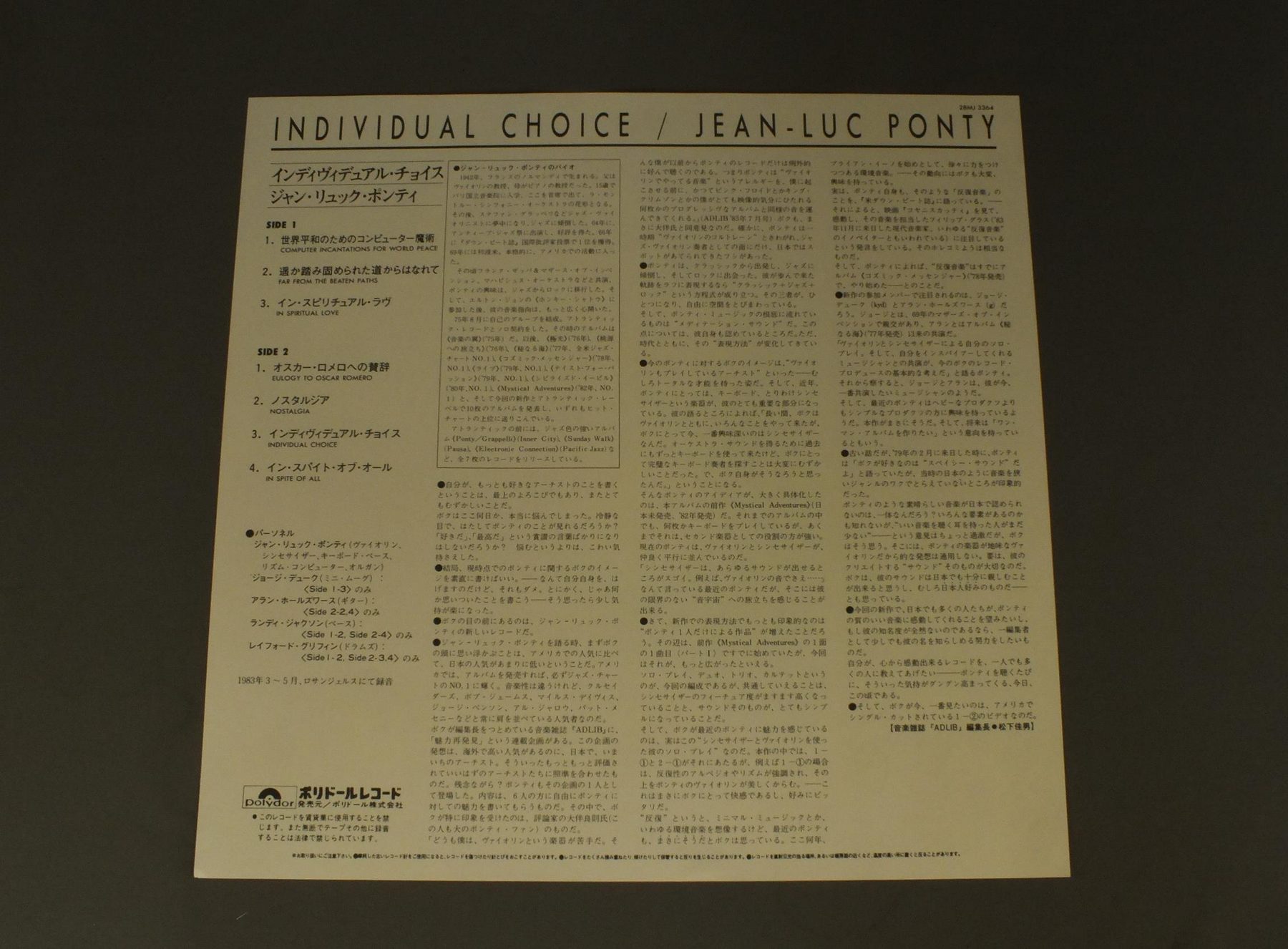 JAN-LUC PONTYジャン・リュック・ポンティ/INDIVIDUAL CHOICEインディヴィデュアル・チョイス 28MJ3364 製造国:日本盤 / Media:LP外観:EX+盤の状態:EX+帯:EX+ 価格(税込):¥2,167(売約済) 送料 7inch:定形外郵便 360円~LP:定形外郵便 660円~送料は、注文の最終画面で確認頂けます。 > > JAN-LUC PONTY/INDIVIDUAL CHOICE 外観 (EX+)特記事項:特記なし。外観EX+の共通説明:中古としては美品、一見してきれいでダメージが軽微。シミ、ヨゴレ、スレ有っても僅か~少し。 盤の状態 (EX+)特記事項:極薄いスリキズ・スレ少し。一見してきれいな状態です。盤EX+の共通説明:盤面の極薄いスリキズ、スレ少し程度 音に出そうなものは無いように見える(極軽微なソフトティック音は除く)。 帯の状態 (EX+):特記なし。 Tweet それぞれの画像をクリックすると、大きい写真が見られます こちらの商品もお勧めです 662円 SPYRO GYRAスパイロ・ジャイラ / FREETIMEフリータイム 1,210円 EARL KLUGHアール・クルー / LOW RIDEロー・ライド 1,320円 BOB JAMESボブ・ジェイムス / RAMEAUラモー 1,210円 LARRY CARLTONラリー・カールトン / STRIKES TWICEストライクス・トワイス 770円 STANLEY JORDANスタンリー・ジョーダン / MAGIC TOUCHマジック・タッチ 880円 SKYスカイ / CADMIUMカドミウム 1,210円 MEZZOFORTEメゾフォルテ / NO LIMITSノー・リミッツ 1,320円 SPECIAL EFXスペシャルエフェクス / SPECIAL EFXスペシャルエフェクス