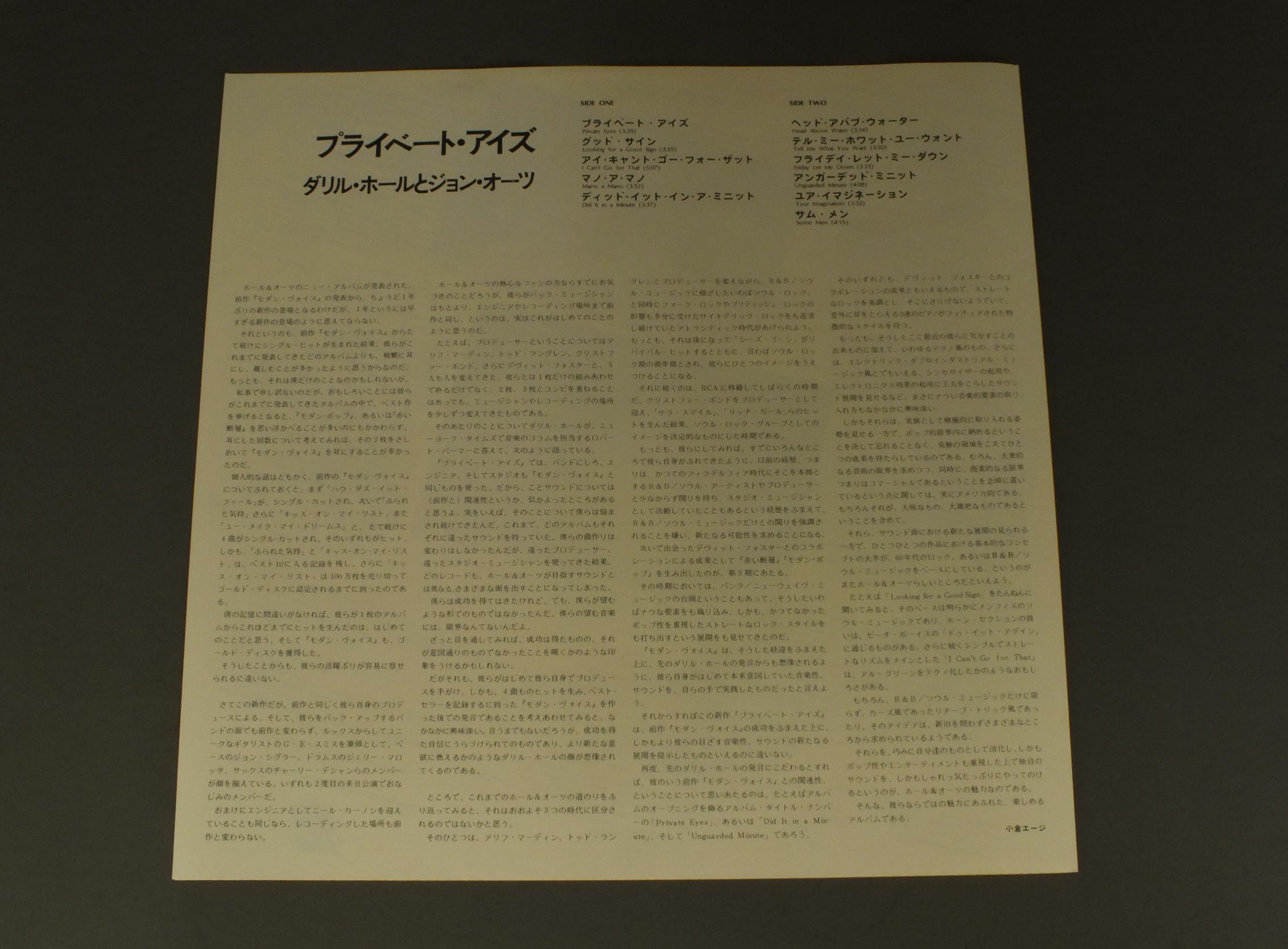 DARYL HALL/JOHN OATESダリル・ホールとジョン・オーツ/PRIVATE EYESプライベート・アイズ RPL8090 製造国:日本盤 / Media:LP外観:EX+盤の状態:EX帯:EX+ 価格(税込):¥550(売約済) 送料 7inch:定形外郵便 360円~LP:定形外郵便 660円~送料は、注文の最終画面で確認頂けます。 > > DARYL HALL/JOHN OATES/PRIVATE EYES 外観 (EX+)特記事項:特記なし。外観EX+の共通説明:中古としては美品、一見してきれいでダメージが軽微。シミ、ヨゴレ、スレ有っても僅か~少し。 盤の状態 (EX)特記事項:薄いスリキズ・スレ少しある感じ。一見してきれいな感じです。盤EXの共通説明:盤面のスリキズが薄いものが少し~軽度 音に出そうなものは無いように見える(軽微なソフトティック音は除く)。 帯の状態 (EX+):特記なし。 Tweet それぞれの画像をクリックすると、大きい写真が見られます こちらの商品もお勧めです 1,210円 THREE SUNSスリー・サンズ / GOLDEN ALBUMゴールデン・アルバム 1,210円 FIREFALLファイアフォール / FIREFALLファイアフォール 660円 SUZI QUATROスージー・クアトロ / QUATRO陶酔のアイドル/クアトロ 770円 STYXスティクス / CORNERSTONEコーナーストーン 1,210円 STYXスティクス / PARADISE THEATREパラダイス・シアター 990円 BYREDSバーズ / BYRDSバーズ 1,210円 DEVADIP CARLOS SANTANAカルロス・サンタナ / SWING OF DELIGHTスイング・オブ・ディライト 1,320円 MIKE BLOOMFIELD & AL KOOPER / LIVE ADVENTURES OF MIKE BLOOMFIELD AND AL KOOPERフィルモアの奇蹟