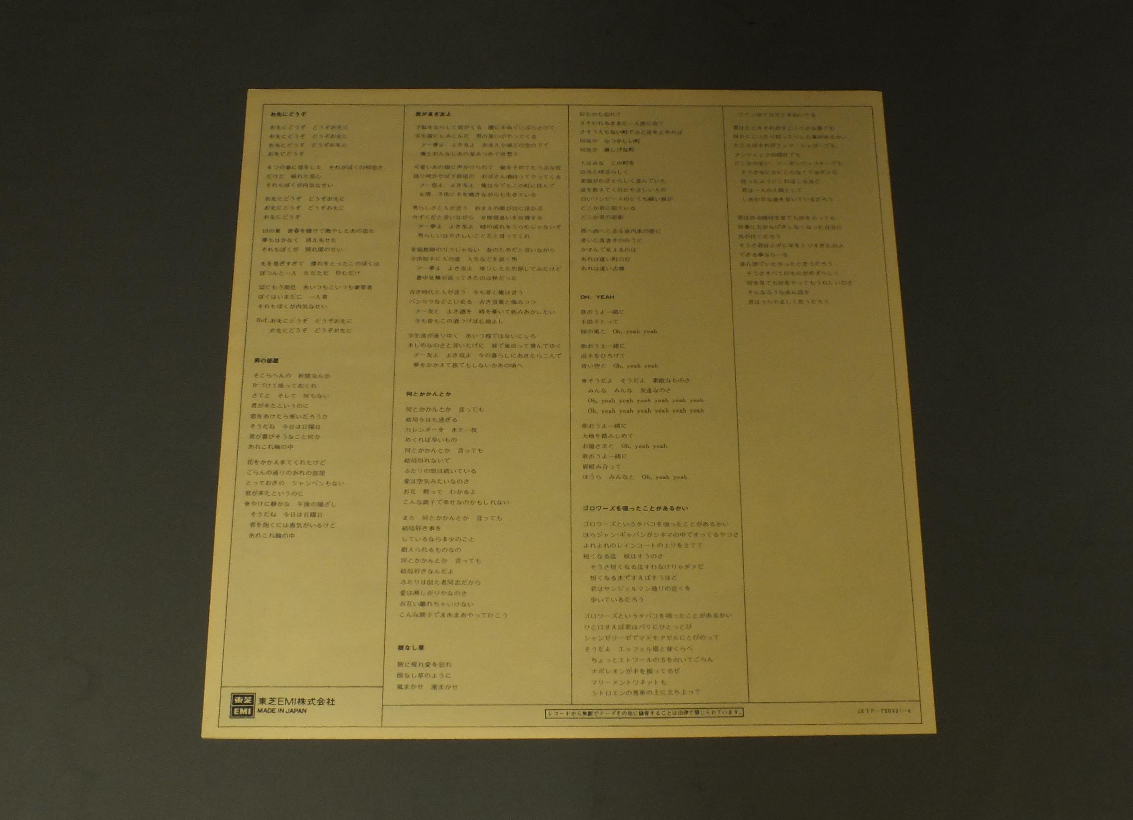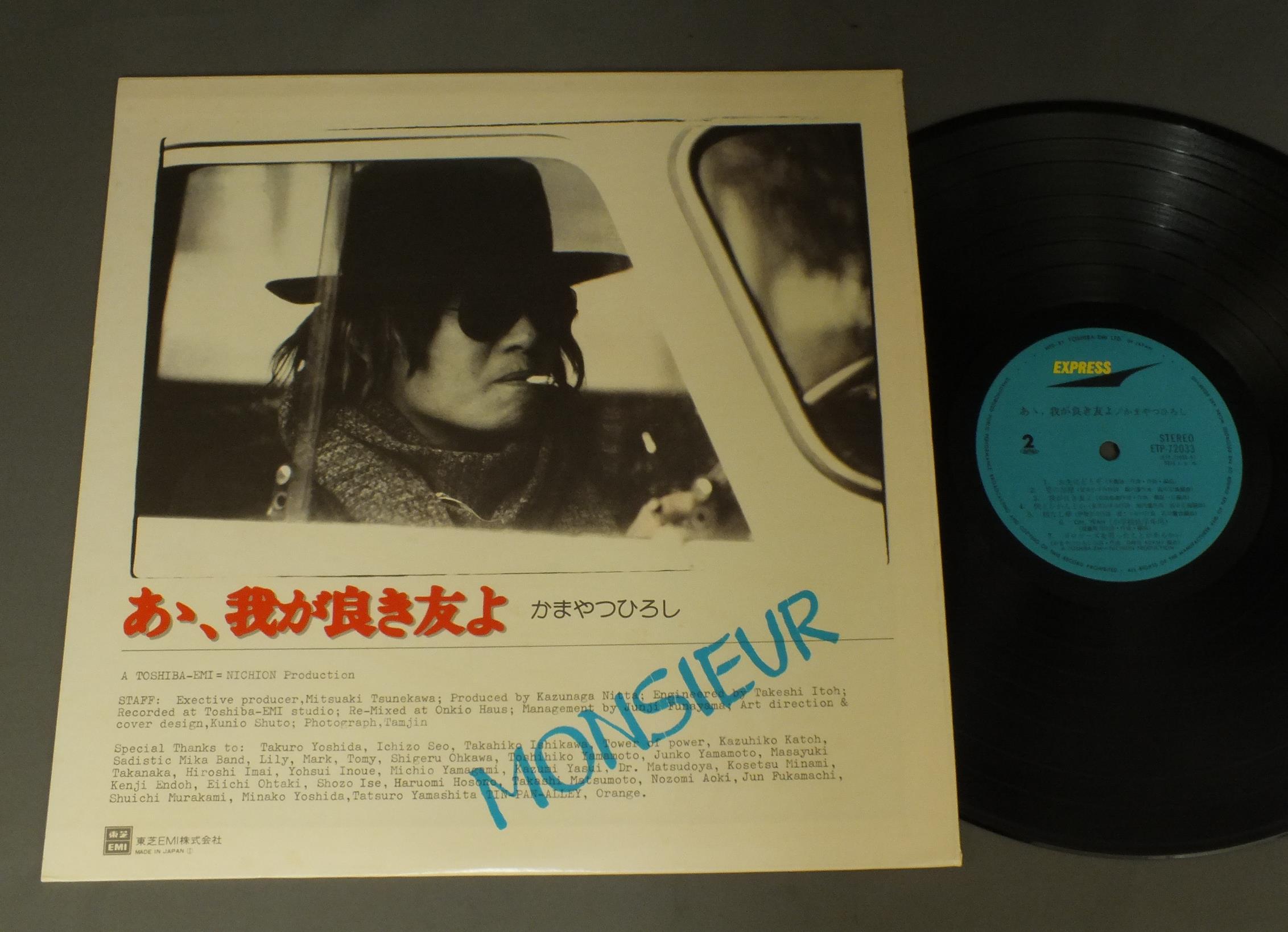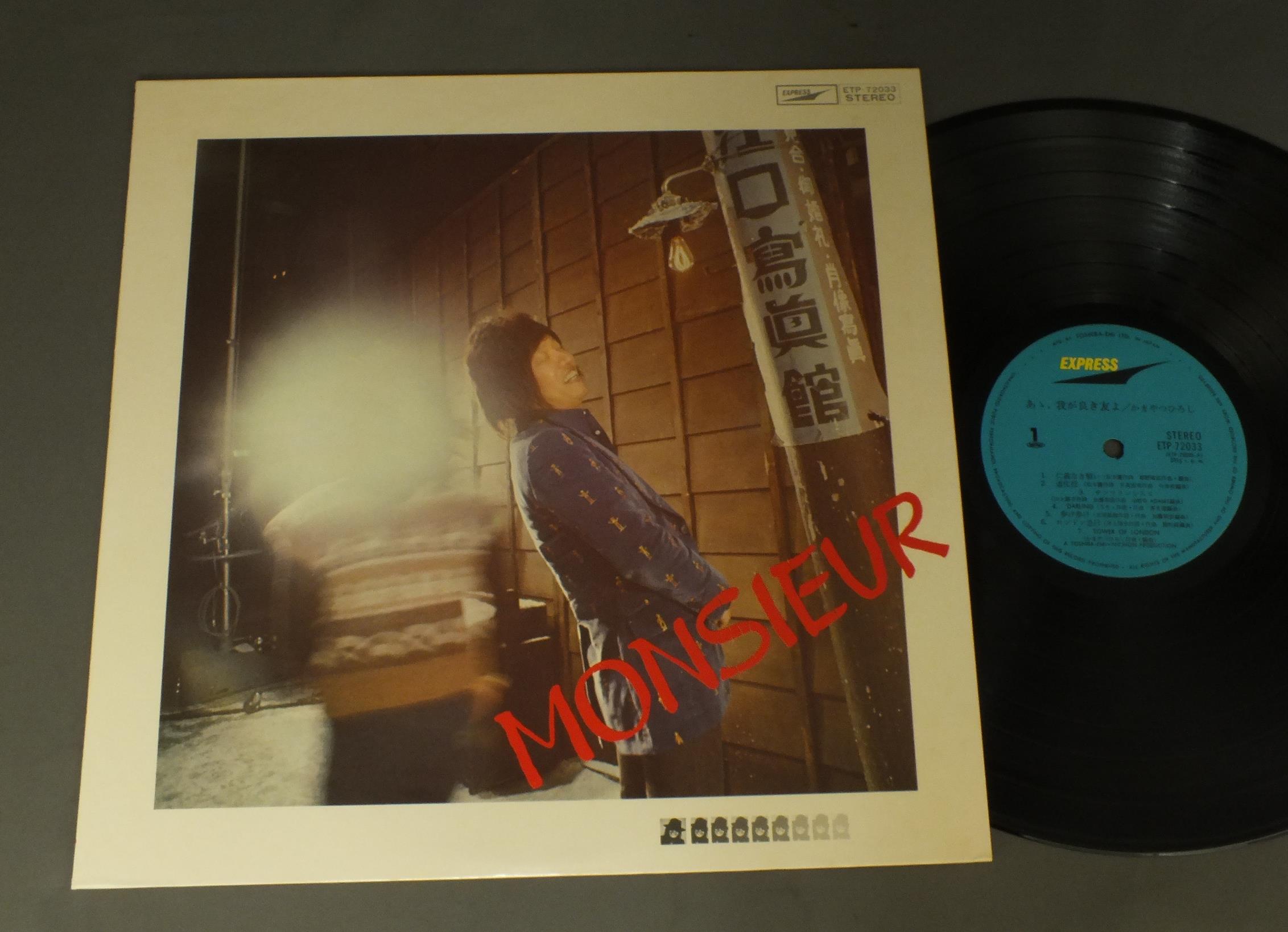 MONSIEURかまやつひろし/あゝ.我が良き友よ ETP72033 製造国:日本盤 / Media:LP外観:EX+盤の状態:EX+ 価格(税込):¥1,650(売約済) 送料 7inch:定形外郵便 360円~LP:定形外郵便 660円~送料は、注文の最終画面で確認頂けます。 > > MONSIEUR/ 外観 (EX+)特記事項:特記なし。外観EX+の共通説明:中古としては美品、一見してきれいでダメージが軽微。シミ、ヨゴレ、スレ有っても僅か~少し。 盤の状態 (EX+)特記事項:極薄いスリキズ・スレ少し。一見してきれいな状態です。盤EX+の共通説明:盤面の極薄いスリキズ、スレ少し程度 音に出そうなものは無いように見える(極軽微なソフトティック音は除く)。 Tweet それぞれの画像をクリックすると、大きい写真が見られます こちらの商品もお勧めです 1,320円 YUMI ARAI荒井由実 / YUMING BRAND PART3ユーミン・ブラインド・パート3 1,210円 YUMI MATSUTOYA松任谷由実 / DA-DI-DAダ・ディ・ダ 770円 CANDIESキャンディーズ / CANDIESキャンディーズ 1,320円 BOROボロ / COMING SOON 660円 MAYUMI ITSUWA五輪真弓 / L`ETRANGERえとらんぜ 550円 CHAGE & ASUKAチャゲ&飛鳥 / 4th ALBUM 21 CENTURY21世紀 660円 GARO / GARO 4 440円 TESSEI MIYOSHI三好鉄生 / TESSEI三好鉄生