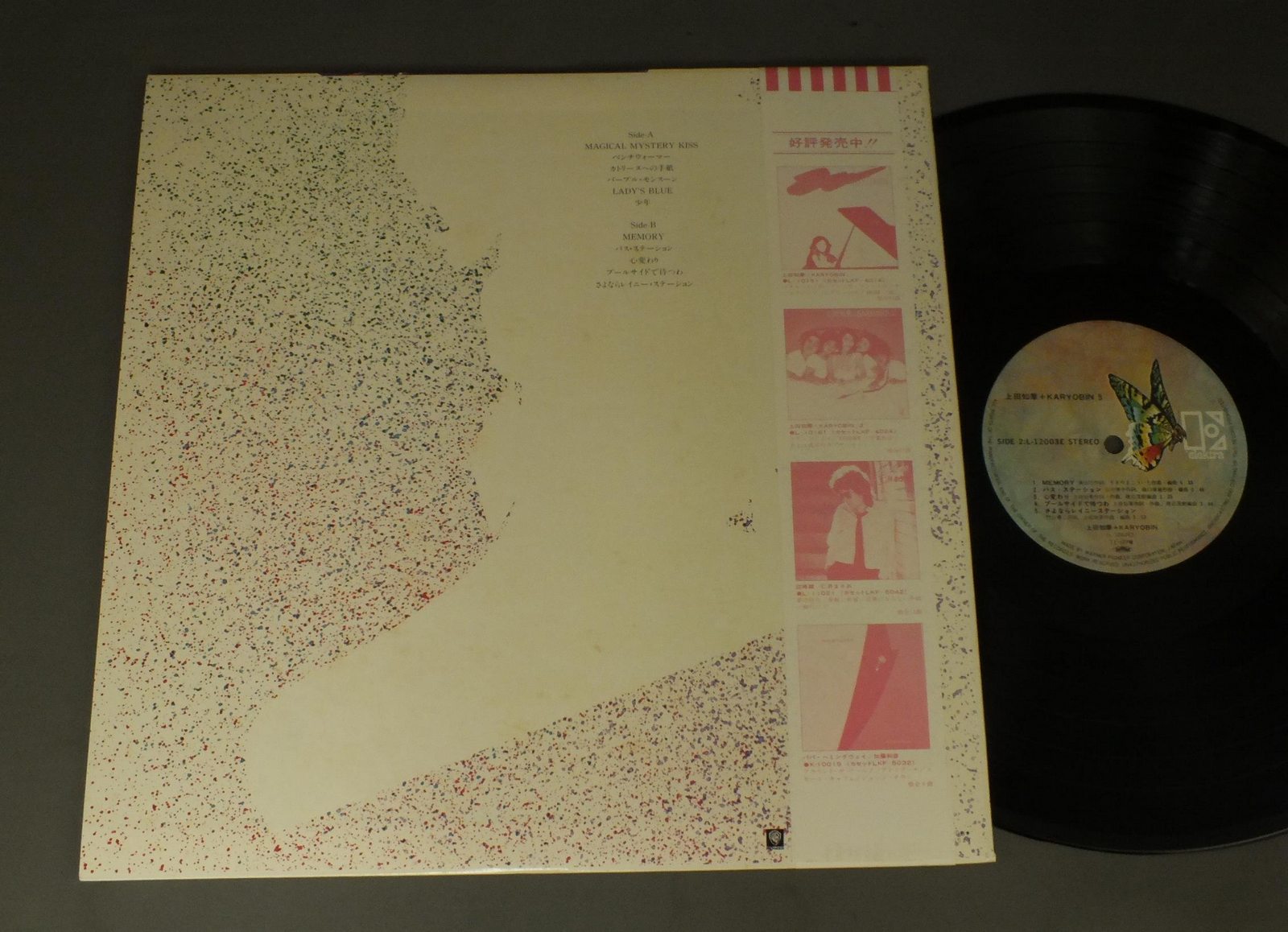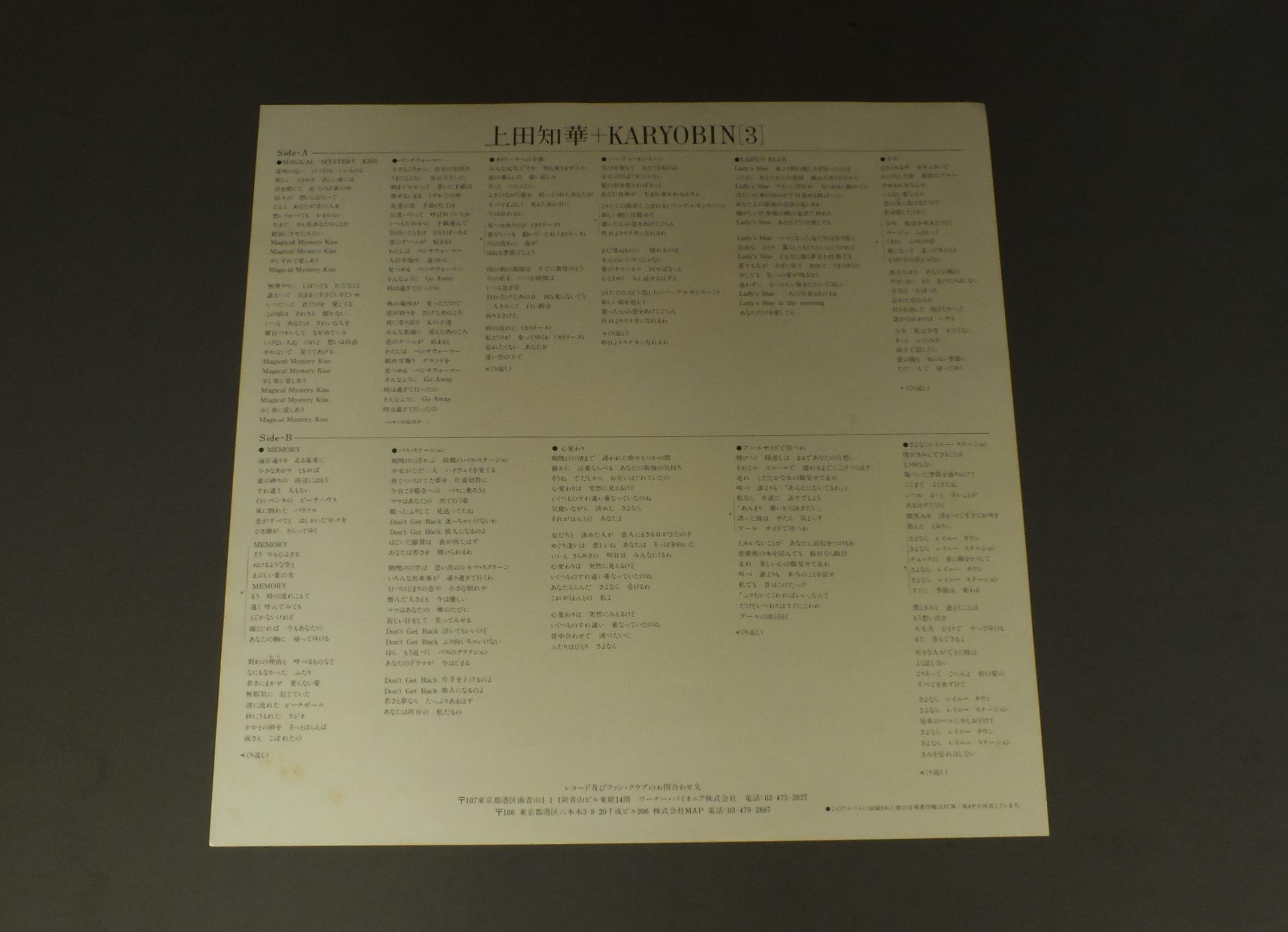 CHIKA UEDA上田知華/KARYOBIN[3] 上田知華+KARYOBIN[3] L12003E 製造国:日本盤 / Media:LP外観:EX盤の状態:EX帯:EX+ 価格(税込):¥880(売約済) 送料 7inch:定形外郵便 360円~LP:定形外郵便 660円~送料は、注文の最終画面で確認頂けます。 > > CHIKA UEDA/KARYOBIN[3] 外観 (EX)特記事項:ジャケ表面に薄いシミ外観EXの共通説明:ダメージが限定的。中古品としては保存状態がよい方。シミ、ヨゴレ、スレ 少し~軽度。 盤の状態 (EX)特記事項:薄いスリキズ・スレ軽くある感じ。軽微なものの様子です。盤EXの共通説明:盤面のスリキズが薄いものが少し~軽度 音に出そうなものは無いように見える(軽微なソフトティック音は除く)。 帯の状態 (EX+):特記なし。 Tweet それぞれの画像をクリックすると、大きい写真が見られます こちらの商品もお勧めです 1,210円 MOTOHARU SANO佐野元春 / BACK TO THE STREET 2,200円 HIKASUEヒカシュー / SUMMER夏 770円 KAZUO ZAITSU財津和夫 / ROUND ABOUT WAY (SOLO CONCERT LIVE)ソロ・コンサート・ライヴ 770円 KUMIKO YAMASHITA山下久美子 / DAKISHIMETE ONLY YOU抱きしめてオンリィ・ユー 770円 NUMBER ONE BANDナンバーワン・バンド / MOMOもも 440円 MUNEYUKI SATOHさとう宗幸 / AOBAJO KOIUTA青葉城恋歌 770円 KUMIKO YAMASHITA山下久美子 / BABY BABY 550円 CHAGE & ASUKAチャゲ&飛鳥 / 4th ALBUM 21 CENTURY21世紀