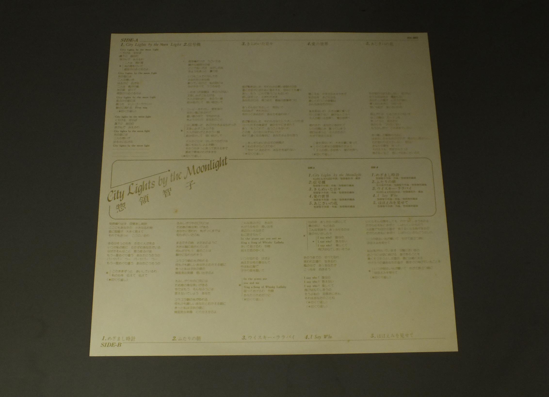 SOURYOU TOMOKO惣領智子/CITY LIGHTS BY THE MOONLIGHT RVL8025 製造国:日本盤 / Media:LP外観:EX+盤の状態:EX+帯:EX+ 価格(税込):¥2,200(売約済) 送料 7inch:定形外郵便 360円~LP:定形外郵便 660円~送料は、注文の最終画面で確認頂けます。 > > SOURYOU TOMOKO/CITY LIGHTS BY THE MOONLIGHT 外観 (EX+)特記事項:特記なし。外観EX+の共通説明:中古としては美品、一見してきれいでダメージが軽微。シミ、ヨゴレ、スレ有っても僅か~少し。 盤の状態 (EX+)特記事項:極薄いスリキズ・スレ少し。一見してきれいな状態です。盤EX+の共通説明:盤面の極薄いスリキズ、スレ少し程度 音に出そうなものは無いように見える(極軽微なソフトティック音は除く)。 帯の状態 (EX+):特記なし。 Tweet それぞれの画像をクリックすると、大きい写真が見られます こちらの商品もお勧めです 880円 YUKARI ITOH伊東ゆかり 布施 明 / DELUXE伊東ゆかりと布施 明-ふたりの愛の世界- 990円 AMII OZAKI尾崎亜美 / POINTS 770円 YASUHIRO ABE安部恭弘 / HOLD ME TIGHTホールド・ミー・タイト 880円 AKIRA INABA因幡晃 / NANIKA IIWASURETA YOUNA何か言い忘れたようで… 1,210円 TAKURO YOSHIDAよしだたくろう / HELLO !元気です。 1,210円 MOMOE YAMAGUCHI山口百恵 / FACE IN A VISIONア・フェイス・イン・ア・ビジョン 1,320円 TAKAKO SHIRAI白井貴子 / PRINCESS NIGHTプリンセスナイト 770円 YASUHIRO ABE安部恭弘 / TUNE BOX THE SUMMER 1968チューン・ボックス
