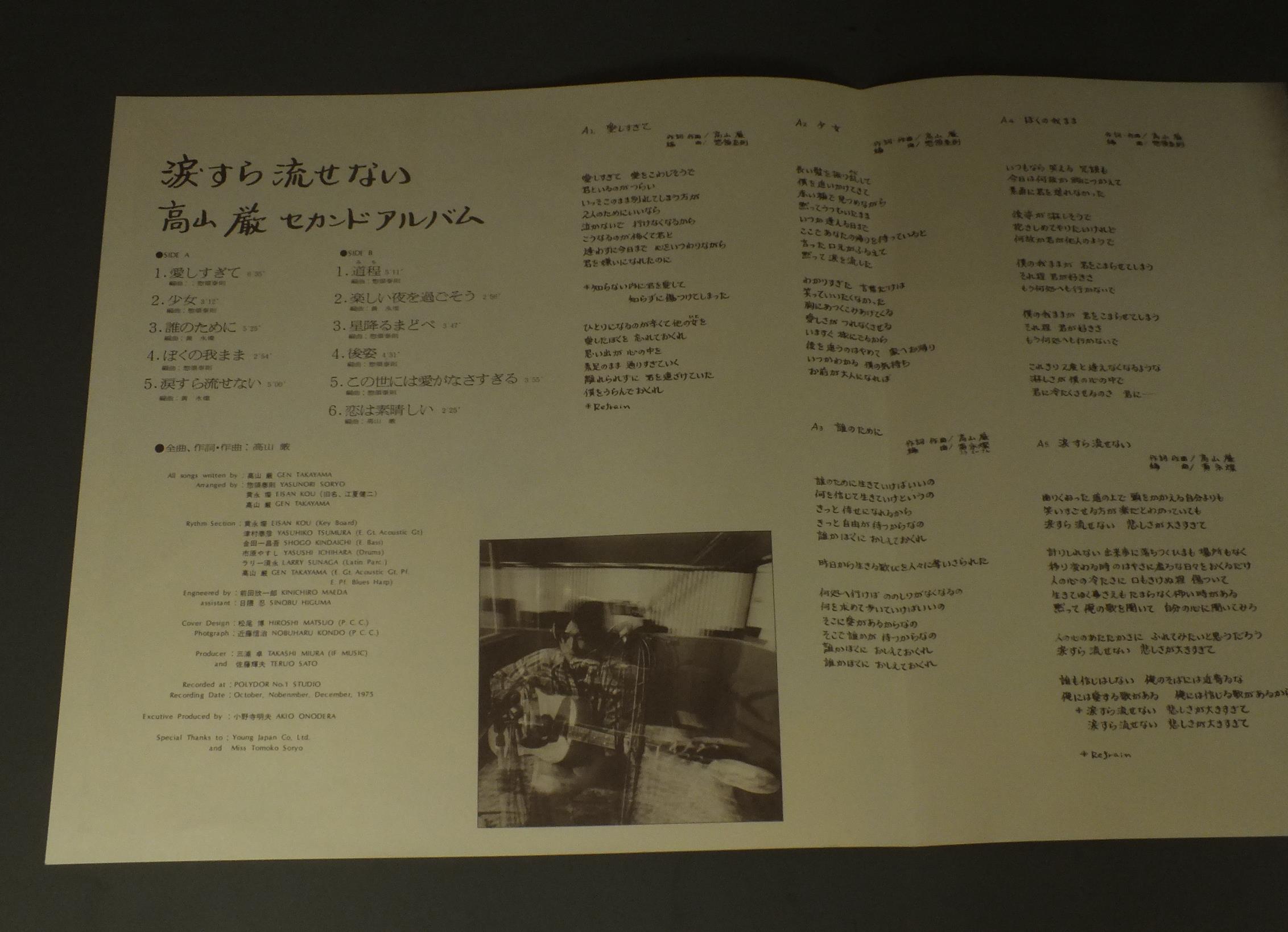 GEN TAKAYAMA高山厳/涙すら流せない MR5074 製造国:日本盤 / Media:LP外観:EX-盤の状態:EX+ 価格(税込):¥2,200(売約済) 送料 7inch:定形外郵便 360円~LP:定形外郵便 660円~送料は、注文の最終画面で確認頂けます。 > > GEN TAKAYAMA/ 外観 (EX-)特記事項:ジャケ表面に薄いシミ外観EX-の共通説明:ダメージ軽度~多少。 中古品としては普通の状態。シミ、ヨゴレ、スレなど軽く~多少。 盤の状態 (EX+)特記事項:極薄いスリキズ・スレ少し。一見してきれいな状態です。盤EX+の共通説明:盤面の極薄いスリキズ、スレ少し程度 音に出そうなものは無いように見える(極軽微なソフトティック音は除く)。 Tweet それぞれの画像をクリックすると、大きい写真が見られます こちらの商品もお勧めです 660円 MAYUMI ITSUWA五輪真弓 / L`ETRANGERえとらんぜ 1,320円 OKAWARI SISTERSおかわりシスターズ / L.A.S.Tラ・ス・ト カレンダー付 770円 KAKIZAKI OPEN THE ROAD神埼・オン・ザ・ロード / OPEN MY ROAD 1,650円 MOMOE YAMAGUCHI山口百恵 / MOBIUS`S GAMEメビウス・ゲーム 1,320円 ALFEEアルフィー / FOR YOUR LOVE 880円 TAKURO YOSHIDA吉田拓郎 / ROLLING 30 + FREE 7inchローリング30+おまけ7インチ 770円 KAZUHIKO KATOH加藤和彦 / L`OPERA FRAGILE 1,210円 SNAKEMAN SHOWスネークマン・ショー / 急いで口で吸え!