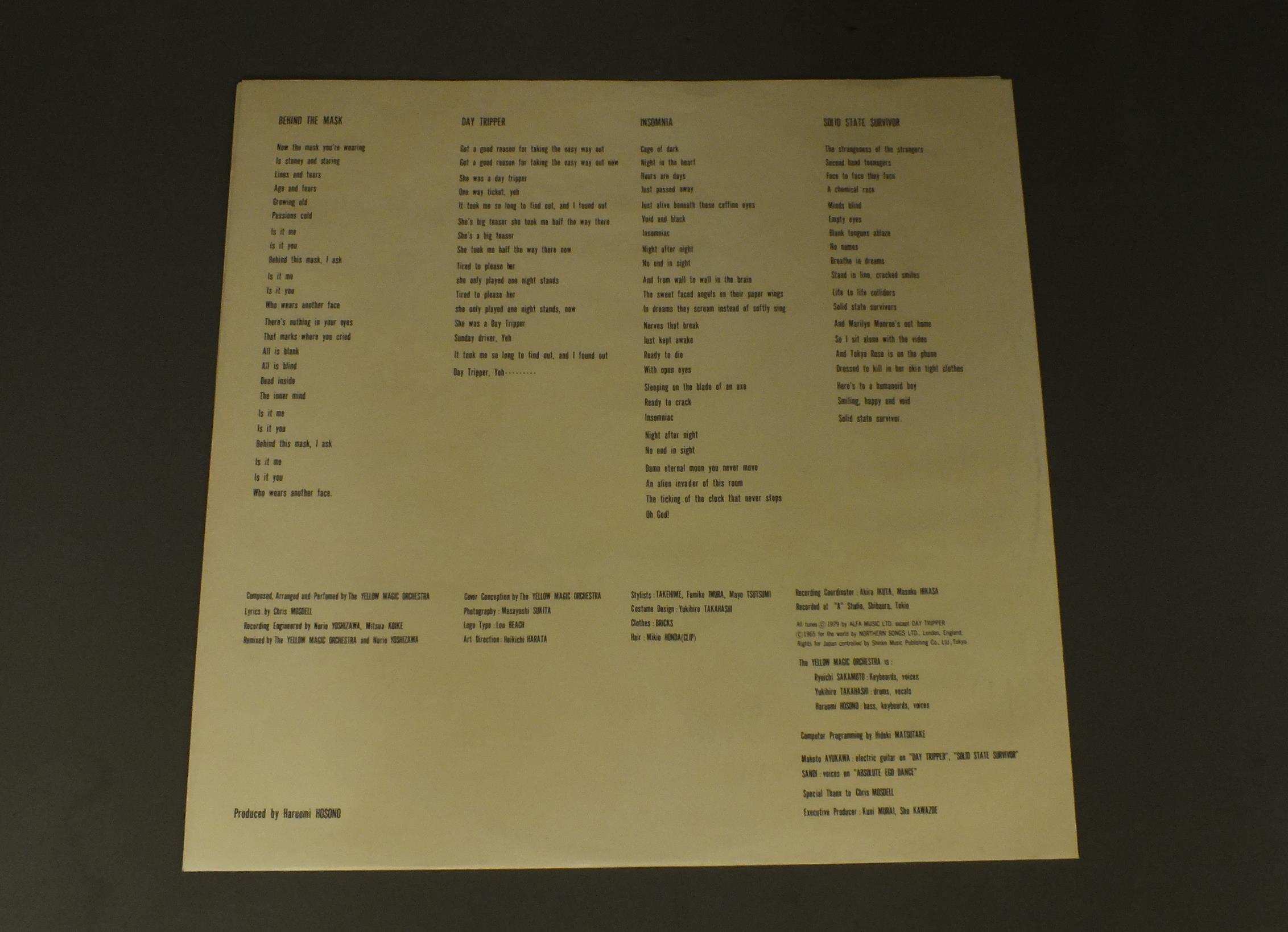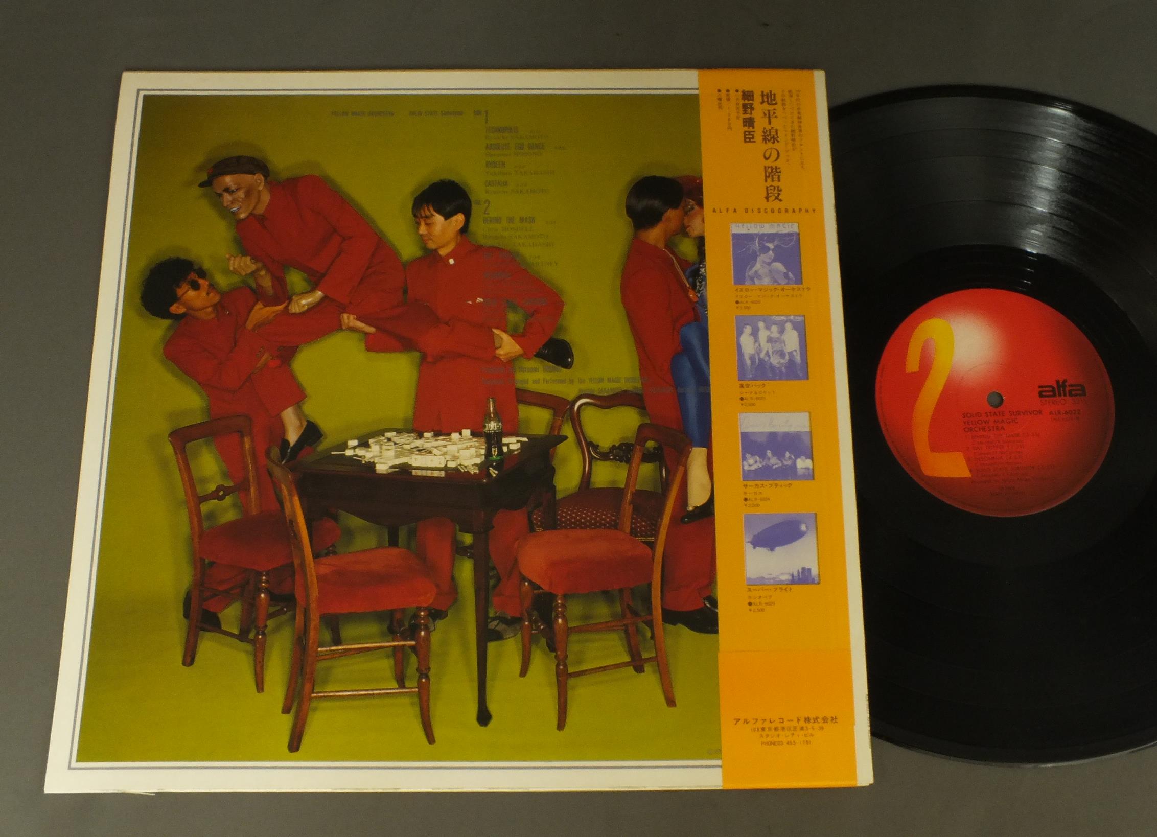 YELLOW MAGIC ORCHESTRAイエロー・マジック・オーケストラ/SOLID STATE SURVIVORソリッド・ステイト・サヴァイヴァー ALR6022 製造国:日本盤 / Media:LP外観:EX+盤の状態:EX帯:EX+ 価格(税込):¥1,100(売約済) 送料 7inch:定形外郵便 360円~LP:定形外郵便 660円~送料は、注文の最終画面で確認頂けます。 > > YELLOW MAGIC ORCHESTRA/SOLID STATE SURVIVOR 外観 (EX+)特記事項:特記なし。外観EX+の共通説明:中古としては美品、一見してきれいでダメージが軽微。シミ、ヨゴレ、スレ有っても僅か~少し。 盤の状態 (EX)特記事項:薄いスリキズ・スレ軽くある感じ。軽微なものの様子です。盤EXの共通説明:盤面のスリキズが薄いものが少し~軽度 音に出そうなものは無いように見える(軽微なソフトティック音は除く)。 帯の状態 (EX+):特記なし。 Tweet それぞれの画像をクリックすると、大きい写真が見られます こちらの商品もお勧めです 770円 HIRO TSUNODA & JAP`S GAP`Sつのだ・ひろ&ジャップス・ギャップス / 1st ALBUMジャップス・ギャップス・テーマ 1,210円 TAKURO YOSHIDAよしだたくろう / HELLO !元気です。 440円 MARI AMACHI天地真理 / BRIDGE OF A RAINBOW虹をわたって 1,980円 SALON MUSICサロン・ミュージック / MY GIRL FRIDAY 1,210円 HIROMI OHTA太田裕美 / TEDUKURI NO GASHUU手作りの画集 1,210円 EIKICHI YAZAWA矢沢永吉 / KISS ME PLEASEキス・ミー・プリーズ 660円 GARO / GARO 4 1,650円 YUMI ARAI etc荒井由実他 / YUMING SUMMER SONG BOOKユーミン・サマー・ソング・ブック