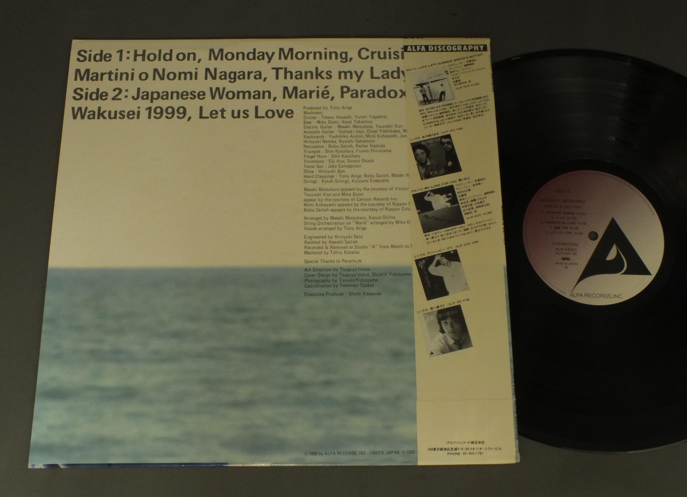 BREAD & BUTTERブレッド&バター/MONDAY MORNINGマンディ・モーニング ALR28001 製造国:日本盤 / Media:LP外観:EX盤の状態:EX帯:EX+ 価格(税込):¥1,100(売約済) 送料 7inch:定形外郵便 360円~LP:定形外郵便 660円~送料は、注文の最終画面で確認頂けます。 > > BREAD & BUTTER/MONDAY MORNING 外観 (EX)特記事項:ジャケ表面に薄いシミ外観EXの共通説明:ダメージが限定的。中古品としては保存状態がよい方。シミ、ヨゴレ、スレ 少し~軽度。 盤の状態 (EX)特記事項:極薄いスリキズ・スレ少し。一見してきれいな状態です。盤EXの共通説明:盤面のスリキズが薄いものが少し~軽度 音に出そうなものは無いように見える(軽微なソフトティック音は除く)。 帯の状態 (EX+):特記なし。 Tweet それぞれの画像をクリックすると、大きい写真が見られます こちらの商品もお勧めです 880円 YOUSUI INOUE井上陽水 / EVERY NIGHT 1,320円 JUN & NENEじゅん&ネネ / WORLD OF JUN & NENE愛するってこわい -じゅん&ネネの世界- 440円 MUNEYUKI SATOHさとう宗幸 / AOBAJO KOIUTA青葉城恋歌 880円 TAKAKO SHIRAI白井貴子 / HEART ATTACKER 1,320円 TULIPチューリップ / LIVE THE 1000thライブ THE 1000th 1,210円 AKIRA KOBAYASHI小林旭 / マイトガイ・ゴールデン・ヒット 770円 HIROMI OHTA大田裕美 / 12 PAGES POETRY12ページの詩集 770円 KEIKO FUJI藤圭子 / WOMAN`S BLUES女のブルース