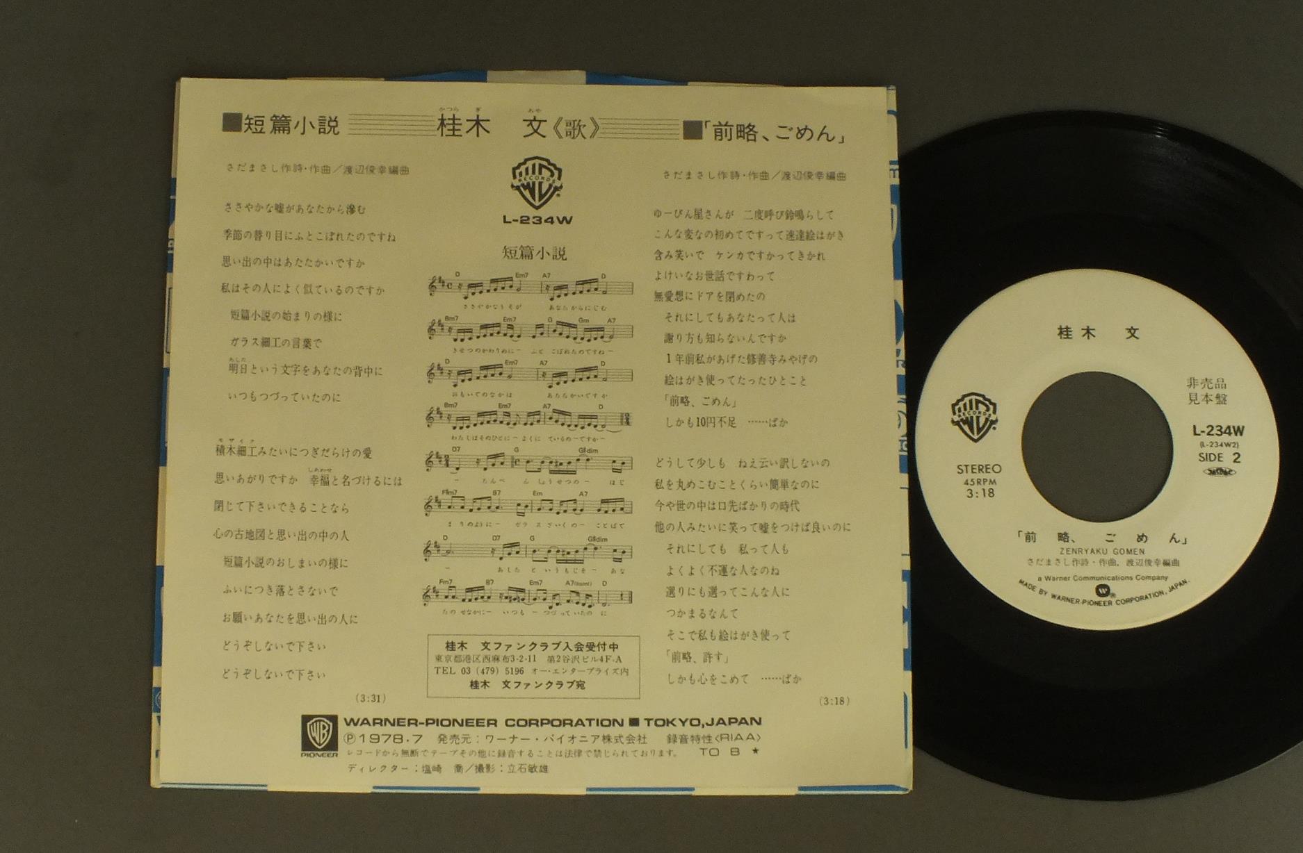 桂木文/TANPEN SHOSETSU短編小説 L234W 製造国:日本盤 / Media:7inch外観:EX+盤の状態:EX+ 価格(税込):¥550(売約済) 送料 7inch:定形外郵便 360円~LP:定形外郵便 660円~送料は、注文の最終画面で確認頂けます。 > > /TANPEN SHOSETSU 外観 (EX+)特記事項:特記なし。コンディションリストを参照ください。外観EX+の共通説明:中古としては美品、一見してきれいでダメージが軽微。シミ、ヨゴレ、スレ有っても僅か~少し。 盤の状態 (EX+)特記事項:極薄いスリキズ・スレ少し。一見してきれいな状態です。盤EX+の共通説明:盤面の極薄いスリキズ、スレ少し程度 音に出そうなものは無いように見える(極軽微なソフトティック音は除く)。 その他:白見本盤 Tweet それぞれの画像をクリックすると、大きい写真が見られます こちらの商品もお勧めです 880円 SEIKO MATSUDA松田聖子 / MORNING SHOWER映画 プルメリアの伝説 1,320円 ONYANKO CLUBおニャン子クラブ / MERRY X`MAS FOR YOU PIC DISCメリー・クリスマス・フォー・ユー 770円 MIKI ASAKURA麻倉末稀 / LOVE AGAIN 770円 CHIEMI KAI甲斐智枝美 / WINK ( 1st ALBUM )ウインク 770円 SHOKO SAWADA沢田聖子 / SHOKO LIVE 1,210円 ERI NITTA新田恵利 / ERI 660円 TOSHIRO OHMI近江俊郎 / BEST COLLECTION懐かしの歌声デラックス 湯の町エレジー 990円 SONOKO KAWAI河合その子 / SIESTAシエスタ
