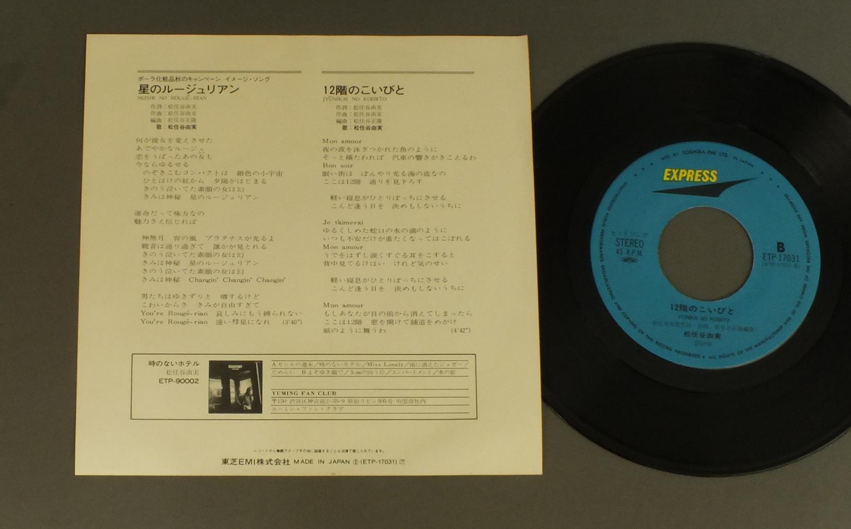 YUMI MATSUTOYA松任谷由実/HOSHI NO ROUGE-RIAN星のルージュリアン ETP17031 製造国:日本盤 / Media:7inch外観:EX+盤の状態:EX 価格(税込):¥770(売約済) 送料 7inch:定形外郵便 360円~LP:定形外郵便 660円~送料は、注文の最終画面で確認頂けます。 > > YUMI MATSUTOYA/HOSHI NO ROUGE-RIAN 外観 (EX+)特記事項:特記なし。コンディションリストを参照ください。外観EX+の共通説明:中古としては美品、一見してきれいでダメージが軽微。シミ、ヨゴレ、スレ有っても僅か~少し。 盤の状態 (EX)特記事項:薄いスリキズ・スレ少しある感じ。一見してきれいな感じです。盤EXの共通説明:盤面のスリキズが薄いものが少し~軽度 音に出そうなものは無いように見える(軽微なソフトティック音は除く)。 Tweet それぞれの画像をクリックすると、大きい写真が見られます こちらの商品もお勧めです 550円 MIKI ASAKURA麻倉未稀 / HERO & HEROINEHERO & HEROINE 660円 TAKAKO SHIRAI白井貴子 / PASCAL 990円 YOSHIMI IWASAKI岩崎良美 / KOKORO NO ATELIER心のアトリエ 990円 MASAAKI SAKAI堺正章 / SOLITUDEひとりぼっちのマチャアキ 550円 HIDEKI SAIJO西城秀樹 / KOU NO BOUSOU恋の暴走 770円 KUMIKO YAMASHITA山下久美子 / DANCIN` IN THE KITCHENダンシン・イン・ザ・キッチン 880円 YUKARI ITOH伊東ゆかり 布施 明 / DELUXE伊東ゆかりと布施 明-ふたりの愛の世界- 880円 TWIST世良公則 &ツイスト / ファースト・アルバム