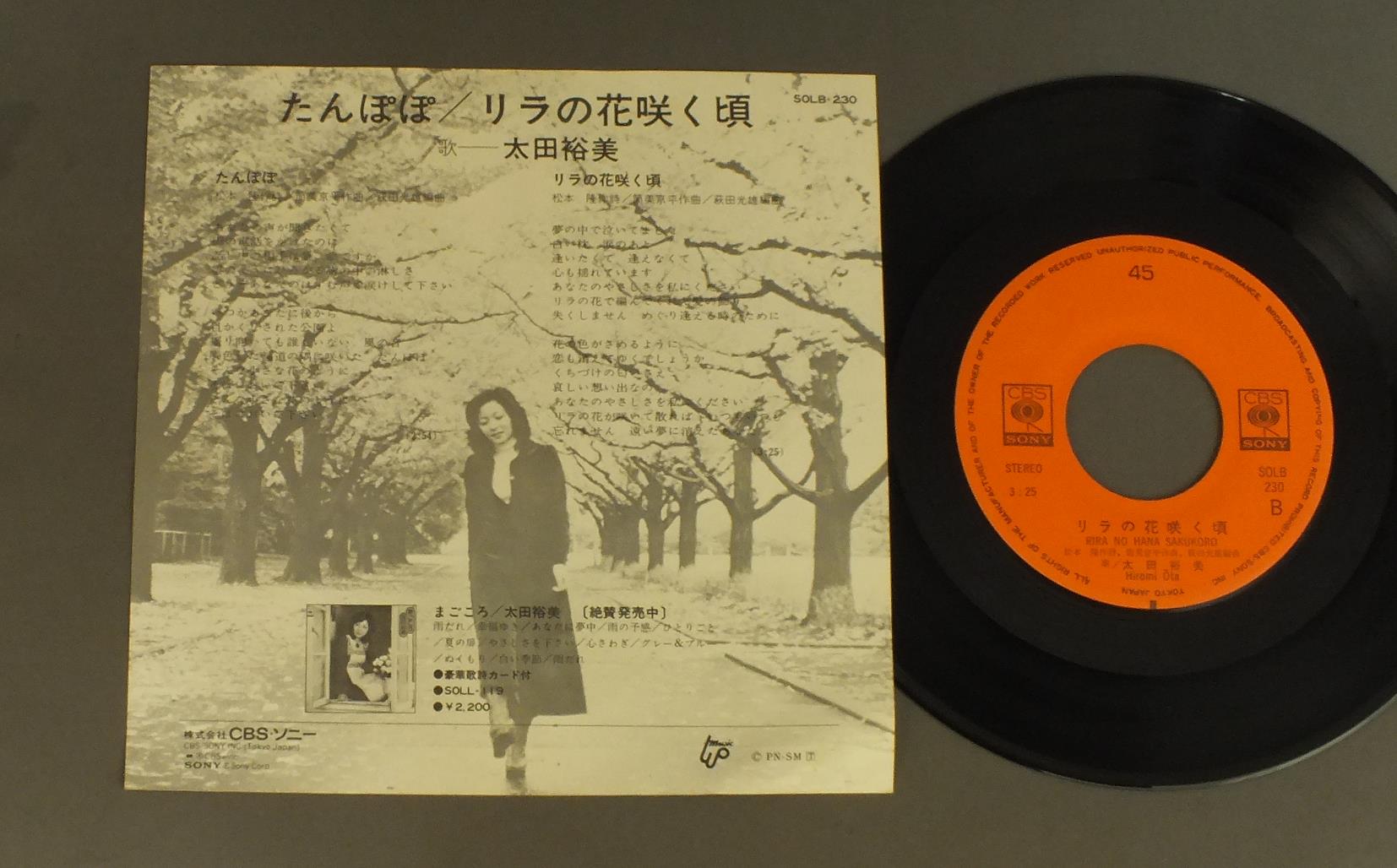 HIROMI OTA太田裕美/TANPOPOたんぽぽ SOLB230 製造国:日本盤 / Media:7inch外観:EX+盤の状態:EX+ 価格(税込):¥550(売約済) 送料 7inch:定形外郵便 360円~LP:定形外郵便 660円~送料は、注文の最終画面で確認頂けます。 > > HIROMI OTA/TANPOPO 外観 (EX+)特記事項:特記なし。コンディションリストを参照ください。外観EX+の共通説明:中古としては美品、一見してきれいでダメージが軽微。シミ、ヨゴレ、スレ有っても僅か~少し。 盤の状態 (EX+)特記事項:極薄いスリキズ・スレ少し。一見してきれいな状態です。盤EX+の共通説明:盤面の極薄いスリキズ、スレ少し程度 音に出そうなものは無いように見える(極軽微なソフトティック音は除く)。 Tweet それぞれの画像をクリックすると、大きい写真が見られます こちらの商品もお勧めです 1,210円 SHOUGO HAMADA浜田省吾 / KIMIGA JINSEI NO TOKI君が人生の時 770円 I SEONG-AE季成愛 / SAYONARAさよなら - 演歌の源流を探る 770円 MOONRIDERSムーンライダーズ / SUMMER ORGASM夏の日のオーガズム 1,320円 CHA-CHAチャ・チャ / HITOMI NO-NAKA-NO TAKARAJIMA瞳の中の宝島 770円 TAKURO YOSHIDAよしだたくろう / NINGEN-NANTE人間なんて 3,300円 TOTAL PRODUCE ORGANAIZER SIDAN師★団 / SUPER FLIGHT IN THE DARK超・夜間飛行 1,210円 YUKO OTOMO大友裕子 / KIZUNA絆(きずな) 1,650円 RC SUCCESIONRCサクセション / BEAT POPSBEAT POPS-RCサクセション