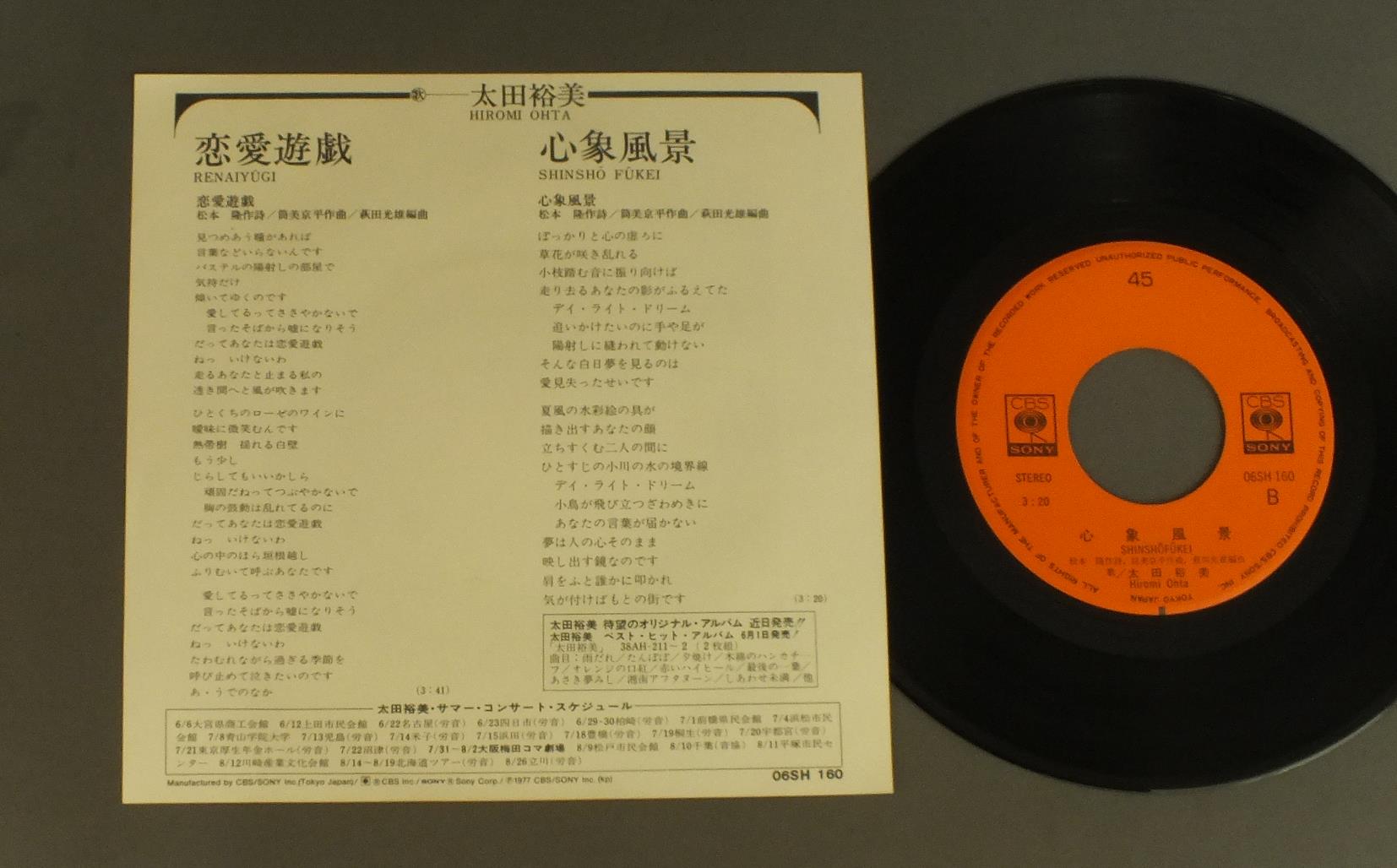 HIROMI OTA太田裕美/RENAIYUGI恋愛遊戯 06SH160 製造国:日本盤 / Media:7inch外観:EX+盤の状態:EX+ 価格(税込):¥330(売約済) 送料 7inch:定形外郵便 360円~LP:定形外郵便 660円~送料は、注文の最終画面で確認頂けます。 > > HIROMI OTA/RENAIYUGI 外観 (EX+)特記事項:特記なし。コンディションリストを参照ください。外観EX+の共通説明:中古としては美品、一見してきれいでダメージが軽微。シミ、ヨゴレ、スレ有っても僅か~少し。 盤の状態 (EX+)特記事項:極薄いスリキズ・スレ少し。一見してきれいな状態です。盤EX+の共通説明:盤面の極薄いスリキズ、スレ少し程度 音に出そうなものは無いように見える(極軽微なソフトティック音は除く)。 Tweet それぞれの画像をクリックすると、大きい写真が見られます こちらの商品もお勧めです 770円 KOICHI MORITA & TOP GALLANTS`森田公一とトップギャラン / BEST HITSヒット全曲集 770円 TAKURO YOSHIDA吉田拓郎 / SHANGRI-LAシャングリ・ラ 880円 KAZUHIKO KATOH加藤和彦 / L`OPERA FRAGILE 440円 MANABU MIYAHARA宮原学 / READY STEADY GO 990円 YOSHIMI HAMADA浜田良美 / SHUNJYU-NO SHOW春秋の章 770円 EIGO KAWASHIMA河島英五 / SHINBOU信望 990円 YUKO TOMITAとみたゆう子 / TIMEタイム 660円 KENICHI HAGIWARA萩原健一 / NADJAナジャ