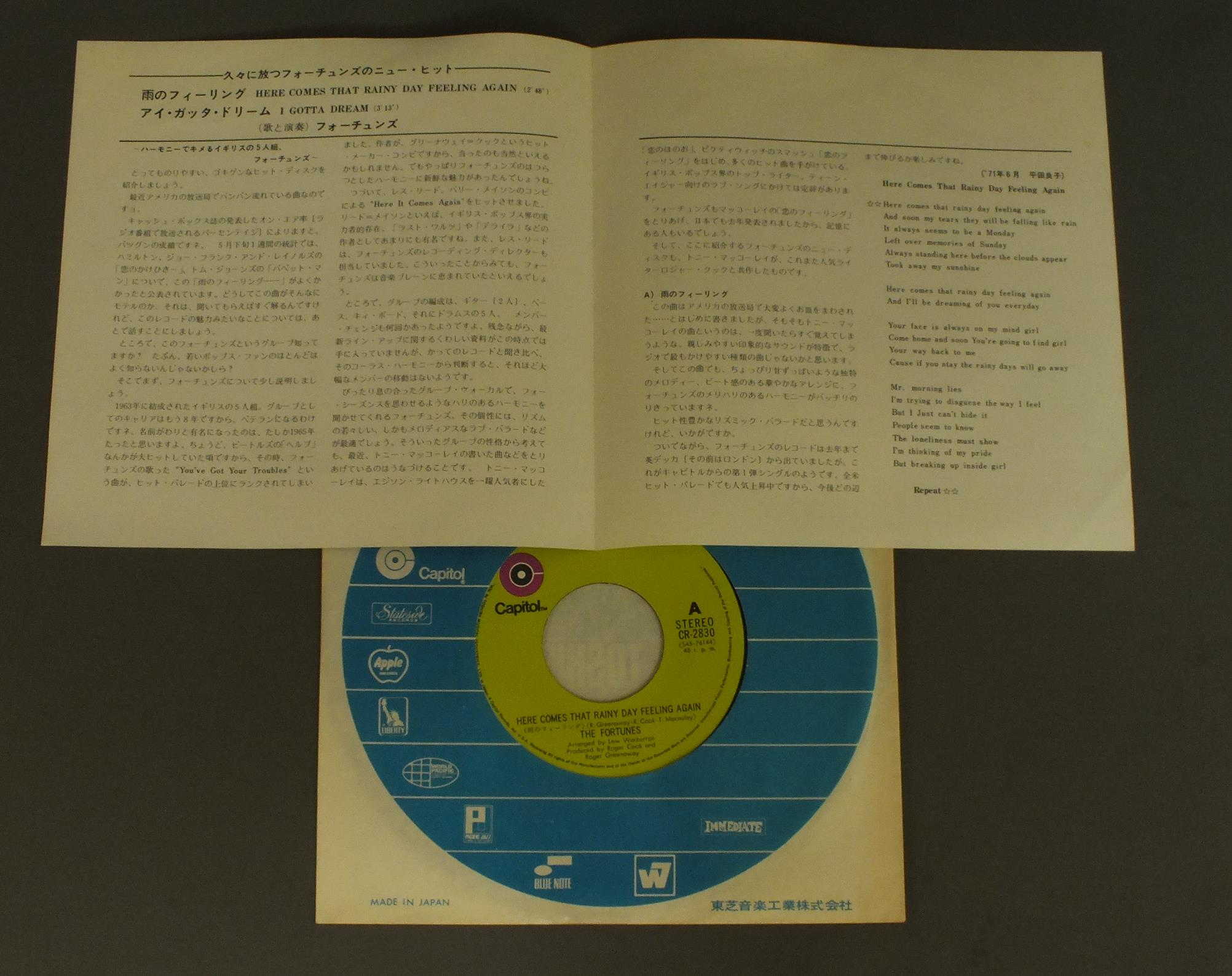FORTUNESフォーチュンズ/HERE COMES THAT RAINY DAY FEELING AGAIN雨のフィーリング CR2830 製造国:日本盤 / Media:7inch外観:EX盤の状態:EX+ 価格(税込):¥440 送料 7inch:定形外郵便 360円~LP:定形外郵便 660円~送料は、注文の最終画面で確認頂けます。 レコード検索 > SWING/BIG BAND > FORTUNES/HERE COMES THAT RAINY DAY FEELING AGAIN 外観 (EX)特記事項:裏側にシミ軽有り。外観EXの共通説明:ダメージが限定的。中古品としては保存状態がよい方。シミ、ヨゴレ、スレ 少し~軽度。 盤の状態 (EX+)特記事項:薄いスリキズ・スレ少し。一見してきれいな状態です。盤EX+の共通説明:盤面の極薄いスリキズ、スレ少し程度 音に出そうなものは無いように見える(極軽微なソフトティック音は除く)。 Tweet それぞれの画像をクリックすると、大きい写真が見られます こちらの商品もお勧めです 2,640円 SPOTNICKSスプートニクス / KARELIA-THE BEST OF THE SPOTNICKS霧のカレリア-ベスト・オブ・ザ・スプートニクス 4,950円 ANIMALSアニマルズ / BEST ALBUM アニマルズのすべて 赤盤