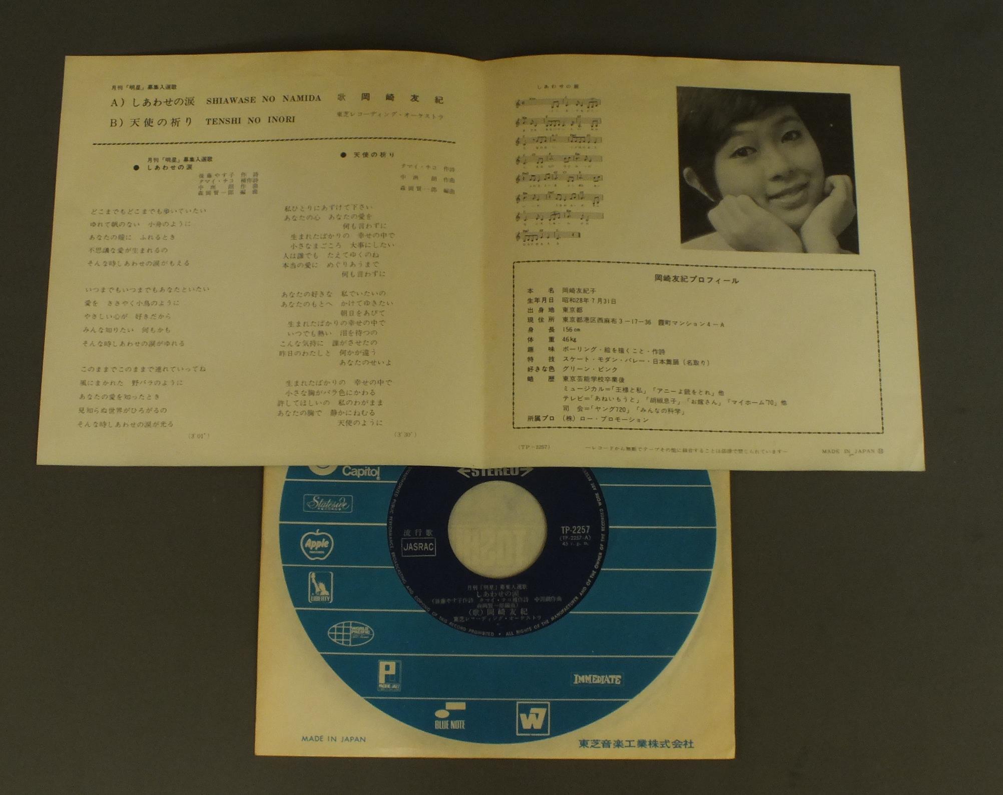 YUKI OKAZAKI岡崎友紀/SHIAWASE NO NAMIDAしあわせの涙 TP2257 製造国:日本盤 / Media:7inch外観:EX盤の状態:EX 価格(税込):¥1,100(売約済) 送料 7inch:定形外郵便 360円~LP:定形外郵便 660円~送料は、注文の最終画面で確認頂けます。 > > YUKI OKAZAKI/SHIAWASE NO NAMIDA 外観 (EX)特記事項:見開きに多少日焼け感有り。外観EXの共通説明:ダメージが限定的。中古品としては保存状態がよい方。シミ、ヨゴレ、スレ 少し~軽度。 盤の状態 (EX)特記事項:薄いスリキズ・スレ軽くある感じ。殆どが軽微なものの様子です。盤EXの共通説明:盤面のスリキズが薄いものが少し~軽度 音に出そうなものは無いように見える(軽微なソフトティック音は除く)。 Tweet それぞれの画像をクリックすると、大きい写真が見られます こちらの商品もお勧めです 770円 BOBBY OKAMOTO & THE INDIAN SUMMERボビー岡本&インディアン・サマー / INDIAN SUMMERインディアン・サマー 770円 YUMI MATSUTOYA松任谷由実 / ALARM A LAMODEアラーム・ア・ラ・モード 1,650円 MOMOE YAMAGUCHI山口百恵 / MOBIUS`S GAMEメビウス・ゲーム 770円 EPOエポ / PUMP ! PUMP ! 880円 TULIPチューリップ / LIVE ACT TULIPライヴ アクト・チューリップ 3,300円 TOTAL PRODUCE ORGANAIZER SIDAN師★団 / SUPER FLIGHT IN THE DARK超・夜間飛行 770円 KUMIKO YAMASHITA山下久美子 / DANCIN` IN THE KITCHENダンシン・イン・ザ・キッチン 770円 EMU絵夢 / 2nd ALBUMII