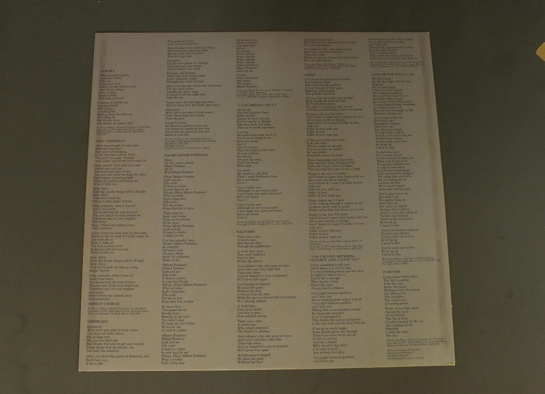 CARPENTERS/HORIZON SP4530 製造国:米国盤 / Media:LP外観:EX盤の状態:EX- 価格(税込):¥2,200(売約済) 送料 7inch:定形外郵便 360円~LP:定形外郵便 660円~送料は、注文の最終画面で確認頂けます。 > > CARPENTERS/HORIZON 外観 (EX)特記事項:ヘリスレ有り。解説カード無し。外観EXの共通説明:ダメージが限定的。中古品としては保存状態がよい方。シミ、ヨゴレ、スレ 少し~軽度。 盤の状態 (EX-)特記事項:薄いスリキズ・細かい表面スレ軽くある感じ。全体的には殆どが軽微なものの様子です。盤EX-の共通説明:盤面のスリキズが多少有り。音に出そうなものは殆ど無いように見える~さほど気にならないぐらいの軽いプチ数カ所程度。 Tweet それぞれの画像をクリックすると、大きい写真が見られます こちらの商品もお勧めです 2,860円 EMMYLOU HARRIS / LUXURY LINER 770円 EMMYLOU HARRIS / CIMARRON 1,100円 MIRIAM MAKEBA / FORBIDDEN GAMES 1,320円 EYDIE GORME / HERE`S EYDIE GORME 880円 LIBBY HOLMAN / SOMETHING TO REMEMBER HER BY 1,100円 BELINDA CARLISLE / BELINDA CARLISLE STORY ( AIRDATE JULY 15 1988 ) 1,650円 REGINE / REGINE 770円 BUFFY SAINTE-MARIE / I`M GONNA BE A COUNTRY GIRL AGAIN