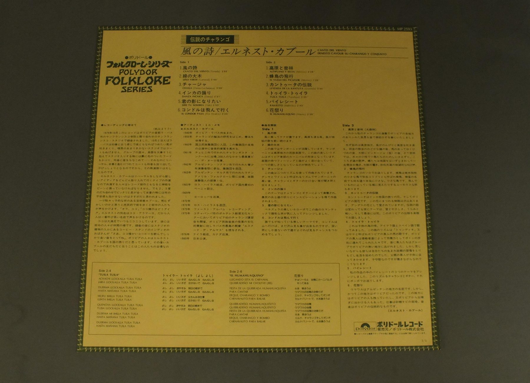 ERNESTO CAVOURエルネスト・カブール/CANTO DEL VLENTOフォルクローレ 風の詩 MP2593 製造国:日本盤 / Media:LP外観:EX盤の状態:EX帯:EX+ 価格(税込):¥2,214(売約済) 送料 7inch:定形外郵便 360円~LP:定形外郵便 660円~送料は、注文の最終画面で確認頂けます。 > > ERNESTO CAVOUR/CANTO DEL VLENTO 外観 (EX)特記事項:特記なし。外観EXの共通説明:ダメージが限定的。中古品としては保存状態がよい方。シミ、ヨゴレ、スレ 少し~軽度。 盤の状態 (EX)特記事項:薄いスリキズ・スレ少しある感じ。一見してきれいな感じです。盤EXの共通説明:盤面のスリキズが薄いものが少し~軽度 音に出そうなものは無いように見える(軽微なソフトティック音は除く)。 帯の状態 (EX+):特記なし。 Tweet それぞれの画像をクリックすると、大きい写真が見られます こちらの商品もお勧めです 770円 PEREZ PRADO & HIS ORCHESTRAペレス・プラード楽団 / PEREZ PRADO VOL 1ペレス・プラード・ベスト VOL 1 1,540円 ELIZETH CARDOSOエリゼッチ・カルドーゾ / O INVERNO DO MEU TEMPO 770円 DIEGO EL PEROTE-M.DE MARCHENA-A.VARGAS etcディエゴ・エル・ペローテ-メルチョール・デ・マルチェーナ-アントニオ・バルガス 他 / CAFE CHINITAS美しきマラガの詩情 770円 CYMBALUM TSIGANEジプシーの音楽 / HUNGARIAN CIMBALOMハンガリーのツインバロム 770円 JULIO MOLINA CABRALフリオ・モリーナ・ガブラール / LUNA TUCUMANAトゥクマンの月 770円 PEDRO CHALCOペドロ・チャルコ / PERUペルー - アンデス高原の神秘の笛(フィリップス民俗音楽世界地図10) 1,210円 EAST EUROPE GYPSY MUSIC民族音楽シリーズ 東欧のジプシー音楽 / JANOS RACZ - RUSSES ET HONGROISESヤーノシュ・ラーツのジプシー・ヴァイオリン 770円 OSIPOV STATE RUSSIAN FOLK ORCH. etcオシポフ国立民族オーケストラ 他 / RUSSIAロシア - 大草原にこだまするバラライカのしらべ(フィリップス民俗音楽世界地図7)