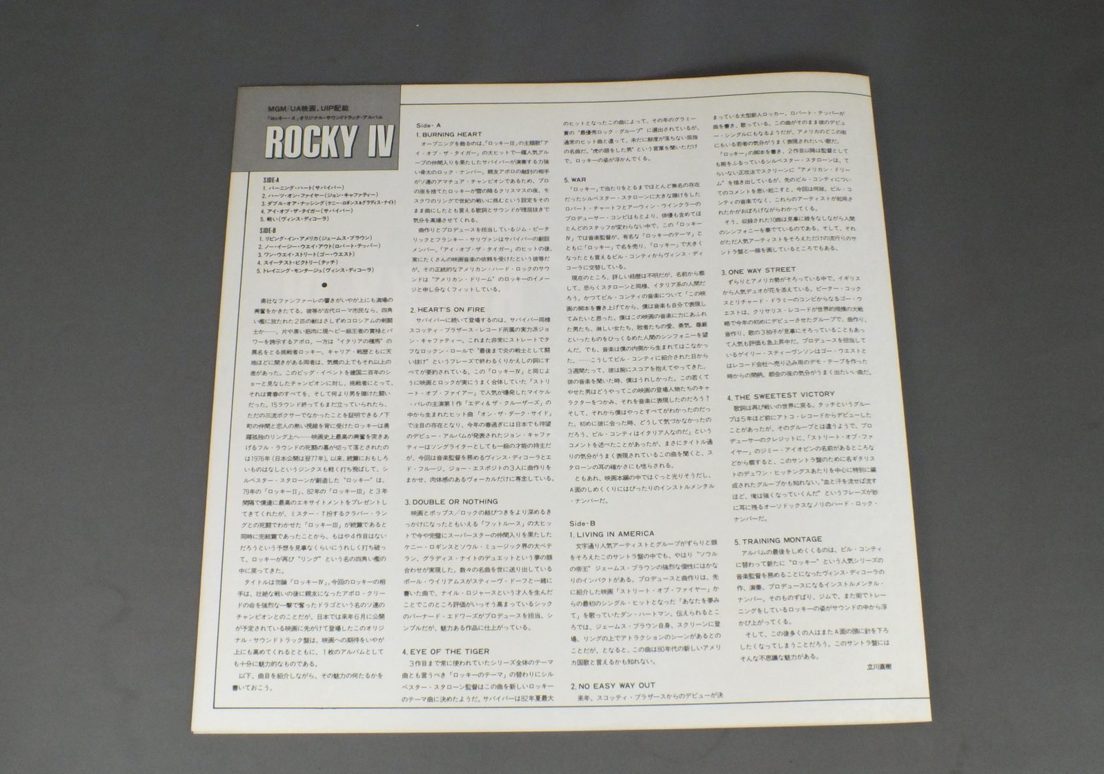 SOUND TRACK/ ROCKY 4映画ロッキー 4 C28Y0161 製造国:日本盤 / Media:LP外観:EX盤の状態:EX+ 価格(税込):¥550(売約済) 送料 7inch:定形外郵便 360円~LP:定形外郵便 660円~送料は、注文の最終画面で確認頂けます。 > > SOUND TRACK/ ROCKY 4 外観 (EX)特記事項:特記なし。外観EXの共通説明:ダメージが限定的。中古品としては保存状態がよい方。シミ、ヨゴレ、スレ 少し~軽度。 盤の状態 (EX+)特記事項:極薄いスリキズ・スレ少し。一見してきれいな状態です。盤EX+の共通説明:盤面の極薄いスリキズ、スレ少し程度 音に出そうなものは無いように見える(極軽微なソフトティック音は除く)。 Tweet それぞれの画像をクリックすると、大きい写真が見られます こちらの商品もお勧めです 770円 VANGELISヴァンゲリス / CHARIOTS OF FIREチャリオッツ・オブ・ファイアー 1,210円 PETER OTOOLE % SOPHIA LORENピーター・オトール&ソフィア・ローレン / SOUNDTRACK MAN OF LA MANCHA映画 ラ・マンチャの男 1,650円 FRANCIS COPPOLAフランシス・コッポラ / SOUND TRACK APOCALYPSE NOW映画 地獄の黙示録 1,650円 FRANCIS COPPOLAフランシス・コッポラ / SOUNDTRACK APOCALYPSE NOWサントラ 地獄の黙示録 990円 ORIGINAL SOUND TRACKオリジナル・サウンド・トラック / CHITTY CHITTY BANG BANGチキ・チキ・バン・バン 770円 CLAUDE LELOUCHクロード・ルルーシュ / LES UNS ET LES AUTRES映画 愛と哀しみのボレロ 550円 YUJIRO ISHIHARA石原裕次郎 / SOUND TRACK FROM NIKKATSU FILM想い出のスクリーン(日活映画サウンドトラックより) 770円 JOHN ADDISONジョン・アディスン監督 / SOUNDTRACK BRIDGE TOO FAR映画 遠すぎた橋