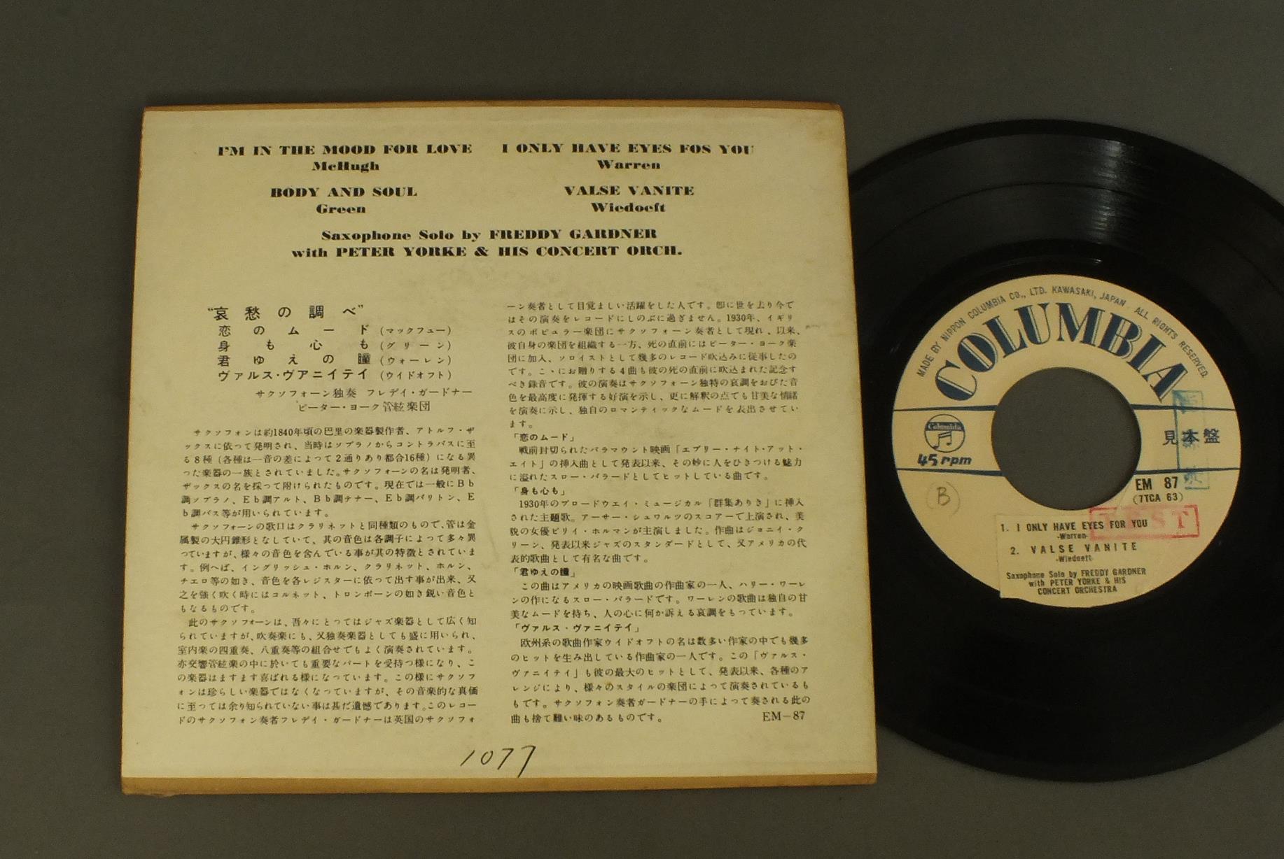FREDDY GARDNERフレディー・ガードナー/I`M IN MOOD FOR LOVE恋のムード EM87 製造国:日本盤 / Media:7inch外観:EX盤の状態:EX- 価格(税込):¥550(売約済) 送料 7inch:定形外郵便 360円~LP:定形外郵便 660円~送料は、注文の最終画面で確認頂けます。 > > FREDDY GARDNER/I`M IN MOOD FOR LOVE 盤の状態 (EX-)特記事項:薄いスリキズ・細かい表面スレ多少ある感じ。殆どが軽微なものの様子です。盤EX-の共通説明:盤面のスリキズが多少有り。音に出そうなものは殆ど無いように見える~さほど気にならないぐらいの軽いプチ数カ所程度。 その他:白見本盤 Tweet それぞれの画像をクリックすると、大きい写真が見られます こちらの商品もお勧めです 770円 STANLEY CLARKE / JOURNEY TO LOVE 770円 ENSEMBLE NIPPONIA日本音楽集団 / WORKS OF KATSUTOSHI NAGASAWA (HOSHUN)長澤勝俊作品集萌春 770円 TOSHIYUKI ICHIMURA市村俊幸 / MY LIFE MY PIANO 1,980円 EIJI KITAMURA北村英治 / APRIL DATE ( MASTER SOUND PRESSING )エイプリル・デイト (マスターサウンド盤) 2,200円 CANNONBALL ADDERLEYキャノンボール・アダレイ / CANNONBALL IN STEREO 60s ISSUEキャノンボール・イン・ステレオ ぺラジャケ 1,210円 JAMES MOODYジェームス・ムーディ / EMARCY JAMES MOODY - THE COMPLETE MOODY STORYコンプリート・ジェームス・ムーディ・オン・エマーシー 770円 TEDDY WILSONテディ・ウイルソン / NOBLE ART OF TEDDY WILSONノーブル・アート・オブ・テディ・ウイルソン 770円 BRUBECK & LAVERNE TRIO / SEE HOW IT FEELS想いのままに