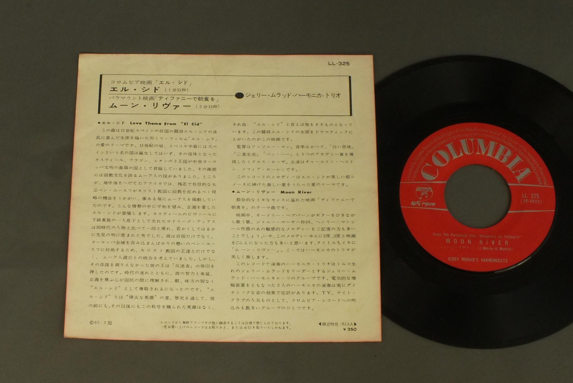 JERRY MURAD`S HARMONICATSジェリー・ムラッド・ハーモニカ・トリオ/LOVE THEME FROM EL CID映画「エル・シド」エル・シド LL325 製造国:日本盤 / Media:7inch外観:EX盤の状態:EX 価格(税込):¥550(売約済) 送料 7inch:定形外郵便 360円~LP:定形外郵便 660円~送料は、注文の最終画面で確認頂けます。 > > JERRY MURAD`S HARMONICATS/LOVE THEME FROM EL CID 盤の状態 (EX)特記事項:薄いスリキズ・スレ軽くある感じ。殆どが軽微なものの様子です。盤EXの共通説明:盤面のスリキズが薄いものが少し~軽度 音に出そうなものは無いように見える(軽微なソフトティック音は除く)。 Tweet それぞれの画像をクリックすると、大きい写真が見られます こちらの商品もお勧めです 770円 TONY SCOTT QUINTETトニー・スコット・クワルテット / TONY SCOTT QUINTET 1,320円 GATO BARBIERIガトー・バルビエリ / TROPICOトロピコ 880円 HERBIE MANNハービー・マン / EVOLUTION OF MANNハービー・マン・ストーリー 1,320円 JOHN GRAASジョン・グラース / COUP DE GRAASクー・デ・グラース 990円 CHARLIE PARKERチャーリー・パーカー / CHARLIE PARKER ON SAVOY VOL6チャーリー・パーカー・オン・サヴォイVOL6 880円 WILTON FELDERウイルトン・フェルダー / WE ALL HAVE A STAR星の伝説 1,210円 RAY BROWN & MILT JACKSONレイ・ブラウンとミルト・ジャクソン / BROWN & JACKSON 1,210円 MAYNARD FURGUSONメイナード・ファーガソン / WORLD OF MAYNARD FURGUSONM・F・ホーン・1