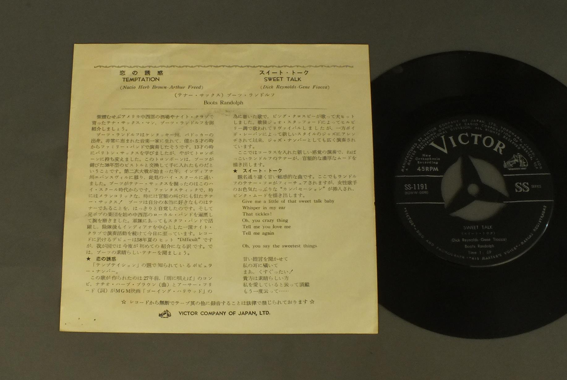 BOOTS RANDOLPHブーツ・ランドルフ/TEMPTATION恋の誘惑 SS1191 製造国:日本盤 / Media:7inch外観:EX-盤の状態:EX- 価格(税込):¥550(売約済) 送料 7inch:定形外郵便 360円~LP:定形外郵便 660円~送料は、注文の最終画面で確認頂けます。 レコード検索 > CLASSIC ORCH. > BOOTS RANDOLPH/TEMPTATION 外観 (EX-)特記事項:下隅にホッチキス穴外観EX-の共通説明:ダメージ軽度~多少。 中古品としては普通の状態。シミ、ヨゴレ、スレなど軽く~多少。 盤の状態 (EX-)特記事項:薄いスリキズ・細かい表面スレ多少ある感じ。殆どが軽微なものの様子です。盤EX-の共通説明:盤面のスリキズが多少有り。音に出そうなものは殆ど無いように見える~さほど気にならないぐらいの軽いプチ数カ所程度。 Tweet それぞれの画像をクリックすると、大きい写真が見られます こちらの商品もお勧めです 1,320円 JOHN COLTRANE & WILBURN HARDENジョン・コルトレーン&ウィルバー・ハーディン / MAINSTREAM 1958メインストリーム1958 660円 KAZUMI BAND香津美バンド / TALK YOU ALL TIGHT頭狂好児唐眼 770円 SONYA ROBINSONソニア・ロビンソン / SONYAソニア 1,210円 MAYNARD FURGUSONメイナード・ファーガソン / WORLD OF MAYNARD FURGUSONM・F・ホーン・1 1,210円 WYNTON KELLYウィントン・ケリー / KELLY BLUEケリー・ブルー 1,320円 SUNSET ALL STARSサンセット・オール・スターズ / JAMMIN` AT SUNSET VOL.2ジャミン・アット・サンセット 第2集 770円 RON CARTERロン・カーター / ANYTHING GOESエニシング・ゴーズ 1,210円 KARIN KROC & ARCHIE SHEPPカーリン・クローグ&アーチー・シェップ / HI-FLYハイ・フライ