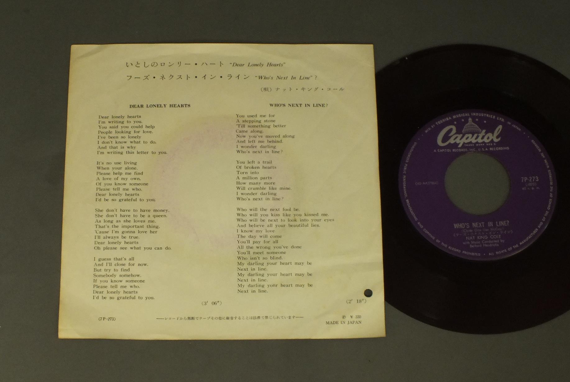NAT `KING` COLEナット・キング・コール/DEAR LONELY HEARTSいとしのロンリー・ハート 7P273 製造国:日本盤 / Media:7inch外観:EX-盤の状態:EX 価格(税込):¥1,191(売約済) 送料 7inch:定形外郵便 360円~LP:定形外郵便 660円~送料は、注文の最終画面で確認頂けます。 > > NAT `KING` COLE/DEAR LONELY HEARTS 外観 (EX-)特記事項:パンチ穴有り。外観EX-の共通説明:ダメージ軽度~多少。 中古品としては普通の状態。シミ、ヨゴレ、スレなど軽く~多少。 盤の状態 (EX)特記事項:薄いスリキズ・スレ軽くある感じ。プチ出そうなところは少しだけで、ほとんどが軽微なものの様子です。盤EXの共通説明:盤面のスリキズが薄いものが少し~軽度 音に出そうなものは無いように見える(軽微なソフトティック音は除く)。 その他:赤盤 Tweet それぞれの画像をクリックすると、大きい写真が見られます こちらの商品もお勧めです 1,210円 OSCAR PETERSONオスカー・ピーターソン / BLUES ETUDEジャズ・ピアノの真髄 1,210円 DEREK SMITHディレク・スミス / NEW SOILニュー・ソワール 1,320円 THE QUINTETパーカー - ガレスピー - パウエル - ローチ - ミンガス / JAZZ AT MASSEY HALLジャズ・アット・マッセイ・ホール 1,210円 MODERN JAZZ QUARTET & SWINGLE SINGERSMJQとスィングル・シンガーズ / PLACE VENDOMEヴァンドーム 660円 JACQUES LOUSSIERジャック・ルーシェ / PLAY BACHプレイ・バッハ 770円 STANLEY CLARKE / JOURNEY TO LOVE 990円 SIDNEY DEPARIS etc / COMMODORE SHOW CASEコモドア・ショーケース 1,210円 JOHN MEHEGAN & EDDIE COSTAジョン・ミーガン&エディ・コスタ / PAIR OF PIANOSペア・オブ・ピアノ