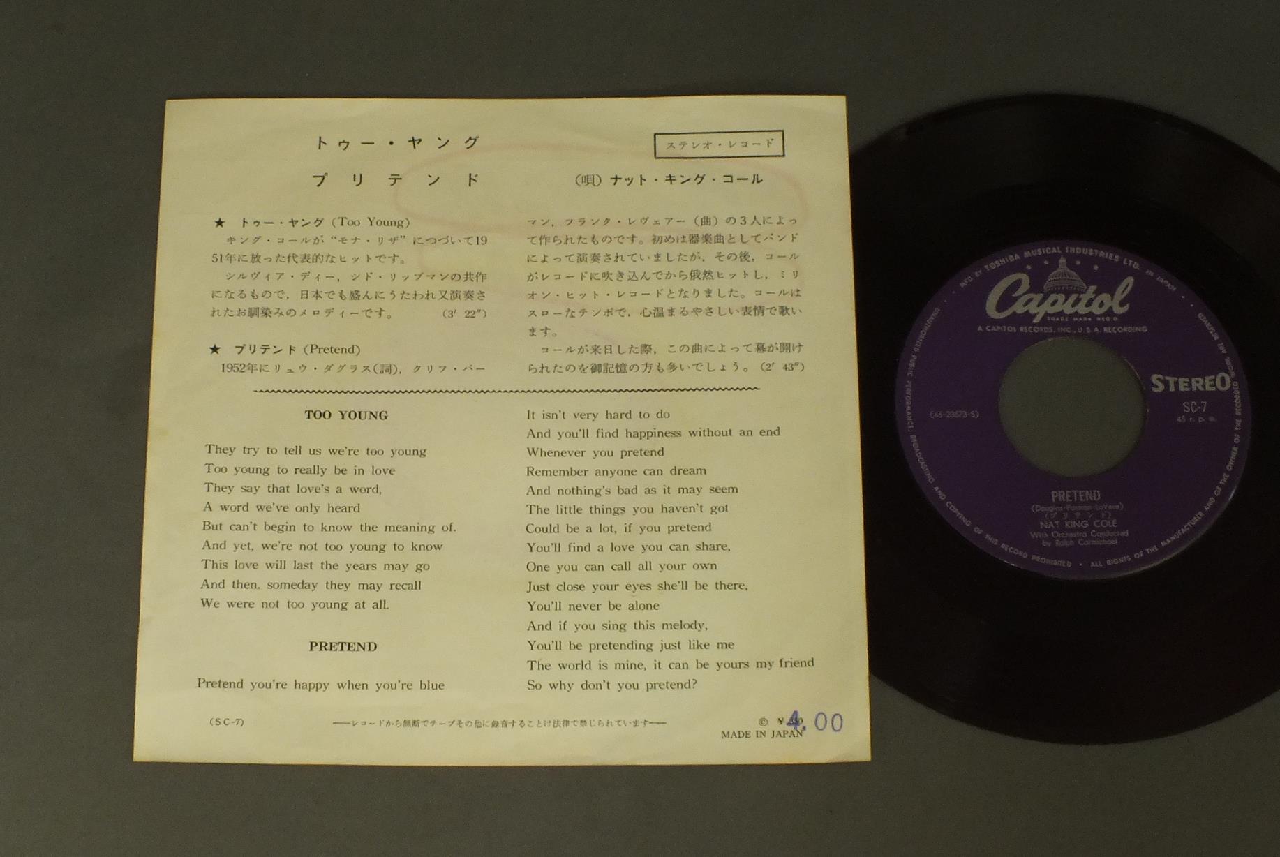 NAT `KING` COLEナット・キング・コール/TOO YOUNGトゥー・ヤング SC7 製造国:日本盤 / Media:7inch外観:EX盤の状態:EX 価格(税込):¥550(売約済) 送料 7inch:定形外郵便 360円~LP:定形外郵便 660円~送料は、注文の最終画面で確認頂けます。 > > NAT `KING` COLE/TOO YOUNG 盤の状態 (EX)特記事項:薄いスリキズ・スレ軽くある感じ。軽微なものの様子です。盤EXの共通説明:盤面のスリキズが薄いものが少し~軽度 音に出そうなものは無いように見える(軽微なソフトティック音は除く)。 その他:赤盤 Tweet それぞれの画像をクリックすると、大きい写真が見られます こちらの商品もお勧めです 770円 RAY BAYANT TRIOレイ・ブライアント・トリオ / CON ALMAコン・アルマ 770円 TEDDY WILSONテディ・ウィルソン / THE TEDDY WILLSON 1,210円 STAN KENTONスタン・ケントン / PORTRAITS ON STANDARDSポートレイツ・オン・スタンダーズ 1,320円 GREAT JAZZ TRIOグレート・ジャズ・トリオ / AT THE VILLAGE VANGUARD VOL2アット・ザ・ヴィレッジ・ヴァンガードVOL2 770円 THAD JONES & MEL LEWISサド・ジョーンズ & メル・ルイス / LIVE IN TOKYOライブ・イン・東京 990円 PETER SPRAGUEピーター・スプラッチ / MUSICA DEL MARムジカ・デル・マール 990円 TAL FARLOWタル・ファーロウ / SWINGINNG GUITARスウィンギング・ギター 990円 CHARLIE PARKERチャーリー・パーカー / CHARLIE PARKER ON SAVOY VOL4チャーリー・パーカー・オン・サヴォイVOL4