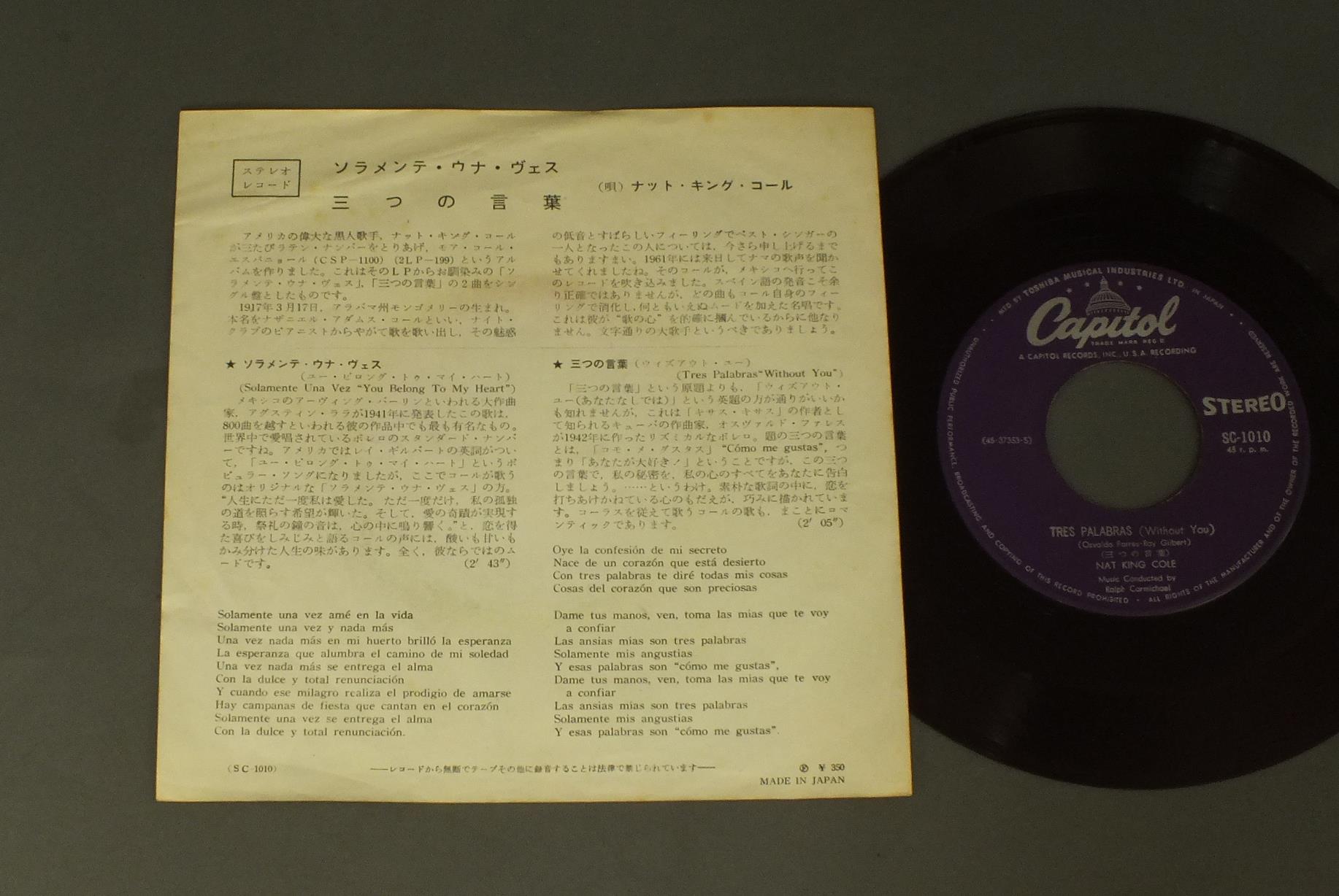 NAT `KING` COLEナット・キング・コール/SOLAMENTE UNA VEZソラメンテ・ウナ・ヴェス SC1010 製造国:日本盤 / Media:7inch外観:EX-盤の状態:EX 価格(税込):¥1,191(売約済) 送料 7inch:定形外郵便 360円~LP:定形外郵便 660円~送料は、注文の最終画面で確認頂けます。 > > NAT `KING` COLE/SOLAMENTE UNA VEZ 盤の状態 (EX)特記事項:薄いスリキズ・スレ軽くある感じ。軽微なものの様子です。盤EXの共通説明:盤面のスリキズが薄いものが少し~軽度 音に出そうなものは無いように見える(軽微なソフトティック音は除く)。 その他:赤盤 Tweet それぞれの画像をクリックすると、大きい写真が見られます こちらの商品もお勧めです 990円 SIDNEY DEPARIS etc / COMMODORE SHOW CASEコモドア・ショーケース 1,210円 BINGO MIKI & INNER GALAXY ORCHESTRA三木敏悟&インナー・ギャラクシー・オーケストラ / EVE(EIGHT LETTERS)出航前夜-一通の手紙 1,210円 WILLIE SMITH - JESS STACY - JOE SULLIVANジェス・ステイシー - ウィリイ・スミス - ジョー・サリバン / CHAIRMEN OF THE BOARD VOL2ピアノ・ジャズの競演 第2集 1,210円 BENNY GOODMAN TRIOベニーグッドマントリオ / PLAYS FOR FLETCHER HENDERSON FUNDプレイズ・フォー・ザ・フィレッチャー・ヘンダーソン 1,650円 MODERN JAZZ QUARTETモダン・ジャズ・カルテット / CONCORDEコンコルド・デラックス 770円 TEDDY CHARLES TENTETテディ・チャールズ・テンテット / TEDDY CHARLES TENTETテディ・チャールズ・テンテット 1,320円 LOUIS ARMSTRONG & HIS ALL-STARSルイ・アームストロング・オールスターズ / PLAYS W.C.HANDYプレイズ・W.C.ハンディ 990円 HI-LO`Sハイ・ローズ / BACK AGAINバック・アゲイン