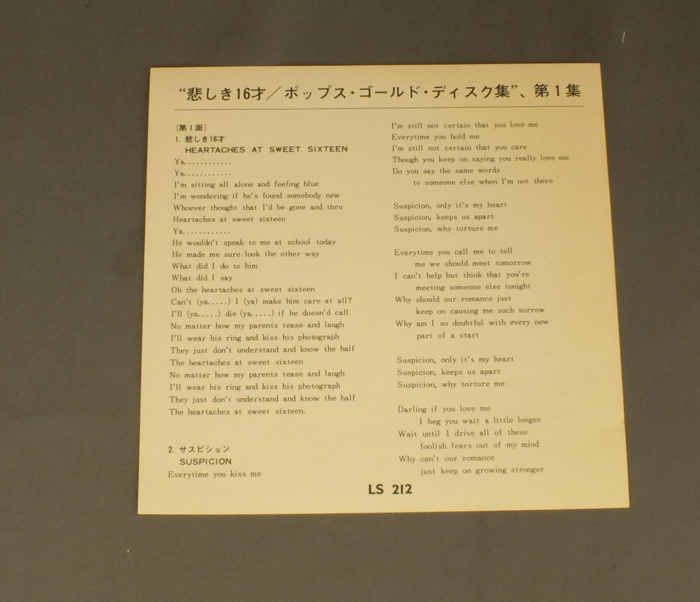 KATHY LINDEN etcケーシー・リンデン 他/HEARTACHE AT SWEET SIXTEEN VOL1悲しき16才 ポップス・ゴールド・ディスク集 第1集 LS212 製造国:日本盤 / Media:7inch外観:VG+盤の状態:EX 価格(税込):¥770(売約済) 送料 7inch:定形外郵便 360円~LP:定形外郵便 660円~送料は、注文の最終画面で確認頂けます。 > > KATHY LINDEN etc/HEARTACHE AT SWEET SIXTEEN VOL1 外観 (VG+)特記事項:背付近にステッカー外観VG+の共通説明:ダメージやや有り。シミ、ヨゴレ、スレなど多少~やや多め。 盤の状態 (EX)特記事項:薄いスリキズ・スレ軽くある感じ。殆どが軽微なものの様子です。盤EXの共通説明:盤面のスリキズが薄いものが少し~軽度 音に出そうなものは無いように見える(軽微なソフトティック音は除く)。 Tweet それぞれの画像をクリックすると、大きい写真が見られます こちらの商品もお勧めです 770円 ELVIS PRESLEYエルヴィス・プレスリー / THAT`S THE WAY IT IS映画 エルヴィス・オン・ステージ 770円 ELVIS PRESLEYエルヴィス・プレスリー / ELVIS-THAT`S THE WAY IT ISこの胸のときめきを -MGM映画 エルヴィス・オン・ステージ 主題歌集 440円 VENTURESベンチャーズ / POPS IN JAPANポップス・イン・ジャパン 880円 VENTURESベンチャーズ / JOYジョイ -ディスカバー・クラシック- 990円 VENTURESベンチャーズ / IN CHRISTMASイン・クリスマス 990円 ELVISエルヴィス / THIS IS ELVIS-SELECTIONS FROM THE ORIGINAL MOTION PICUTRE SOUNDTRACK映画 THIS IS ELVIS オリジナル・サウンドトラック 1,210円 ELVIS PRESLEY / ELVIS AS RECORDED AT MADISON SQUARE GARDENエルヴィス・イン・ニューヨーク 1,210円 ELVIS PRESLEY / ON STAGE FEBRUARY 1970プレスリー・オン・ステージ 1970