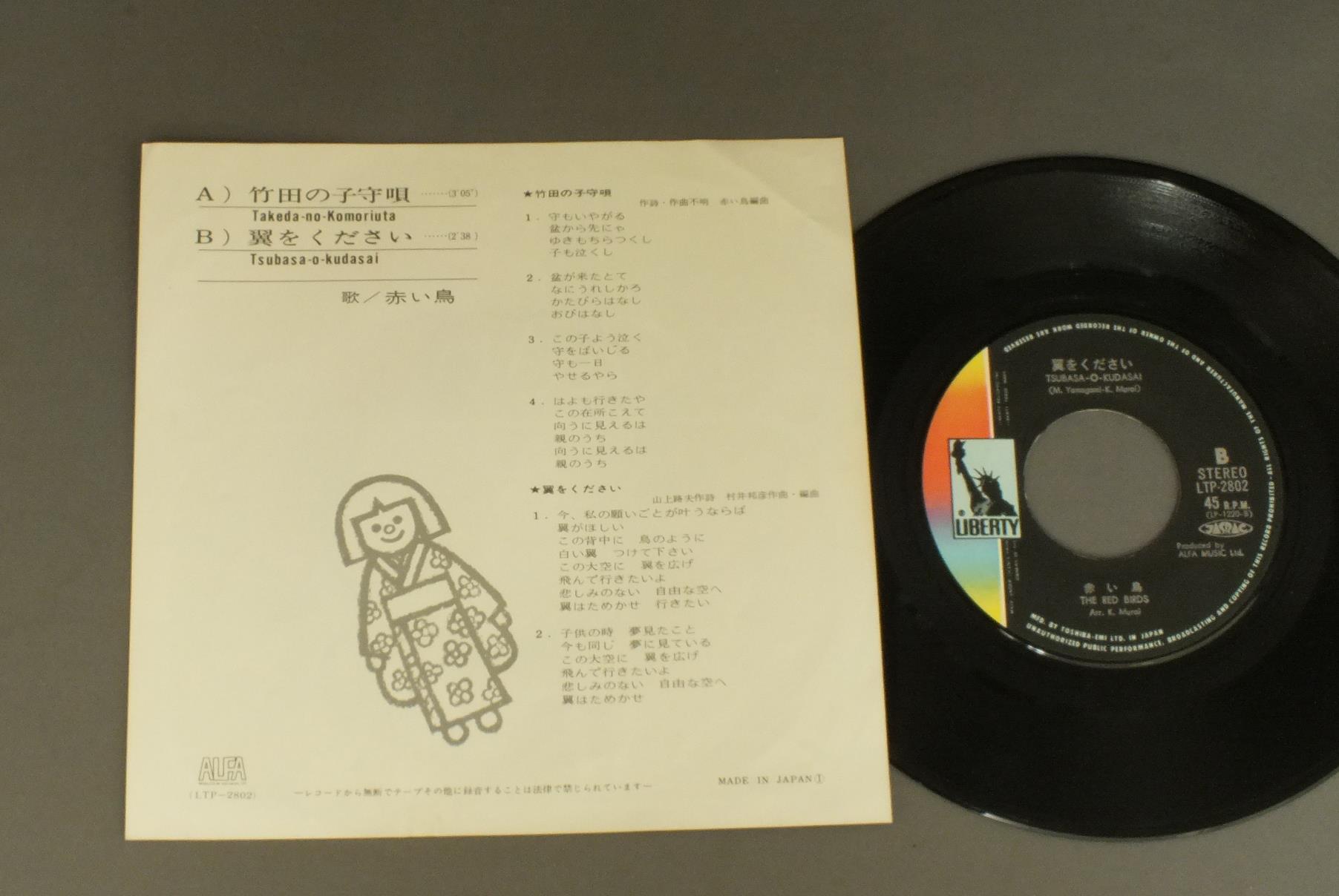 RED BIRD赤い鳥/TAKEDA-NO-KOMORIUTA竹田の子守唄 LTP2802 製造国:日本盤 / Media:7inch外観:EX盤の状態:EX 価格(税込):¥550(売約済) 送料 7inch:定形外郵便 360円~LP:定形外郵便 660円~送料は、注文の最終画面で確認頂けます。 > > RED BIRD/TAKEDA-NO-KOMORIUTA 盤の状態 (EX)特記事項:薄いスリキズ・スレ軽くある感じ。軽微なものの様子です。盤EXの共通説明:盤面のスリキズが薄いものが少し~軽度 音に出そうなものは無いように見える(軽微なソフトティック音は除く)。 Tweet それぞれの画像をクリックすると、大きい写真が見られます こちらの商品もお勧めです 1,980円 SHINTARO GODO五堂新太郎 / FADE INフェイド・イン 1,210円 HAKUDO OHTSUKA大塚博堂 / 過ぎ去りし想い出は 770円 TAKURO YOSHIDAよしだたくろう / ON STAGEオン・ザ・ステージ ともだち 770円 NATARSHER SEVENナターシャー・セブン / GOOD LOOKIN`道 世界のうた編 1,210円 KUMIKO YOKOI - CHUO CHOIR etc横井久美子・中央合唱団他 / HIROBAうたごえフォーク ひろば 880円 N.S.Pニュー・サディスティック・ピンク / N.S.P. 2N.S.P. II 1,980円 FURUIDO古井戸 / 2nd ALBUMオレンジ色のスケッチ(2nd ALBUM) 770円 TAKASHI NISHIOKA西岡たかし / 1969-19781969-1978 西岡たかし 五つの赤い風船 2